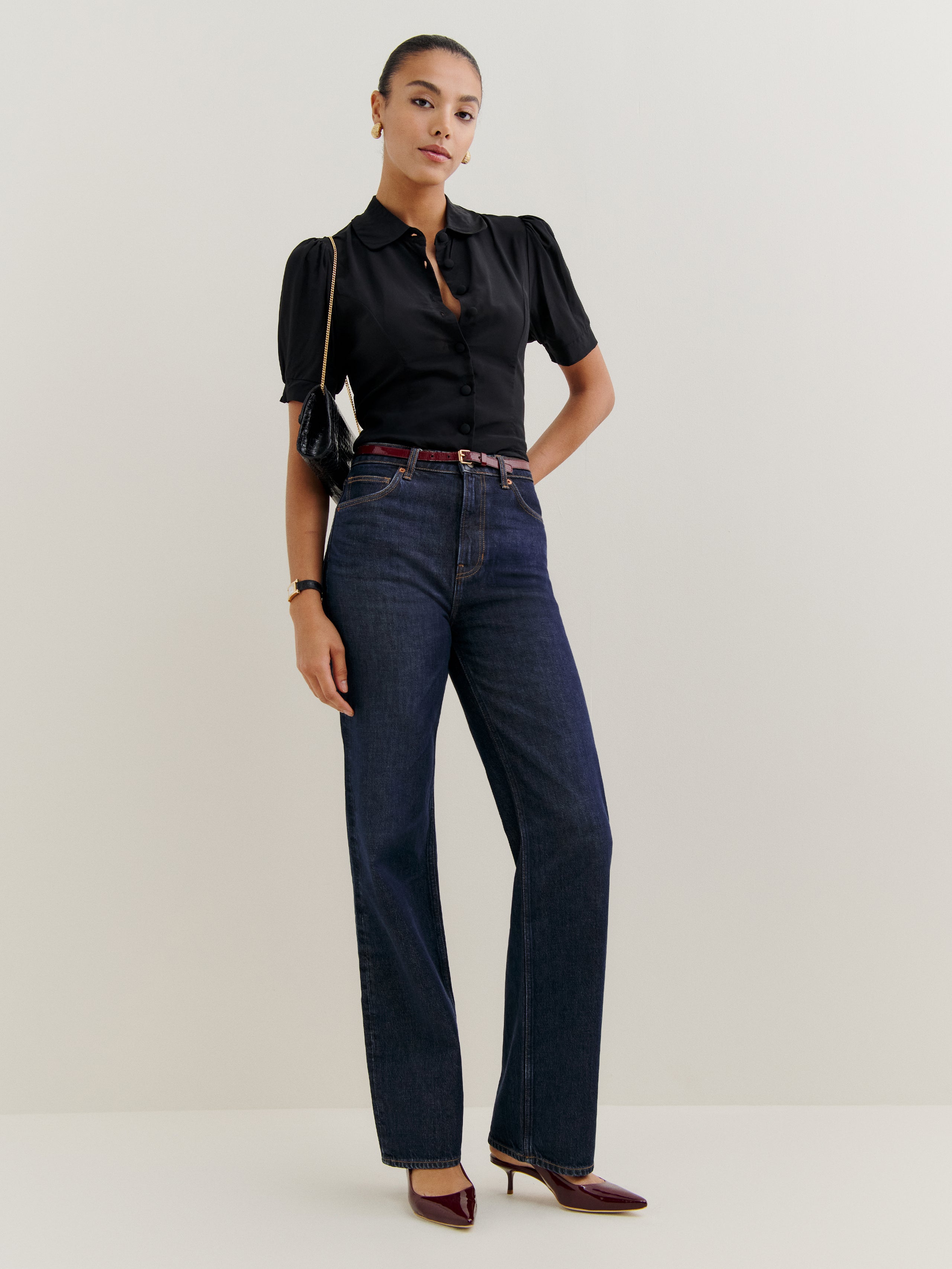 Up top. Shop the Elani Top from Reformation, a short-sleeved top with a collared neckline, button front,...