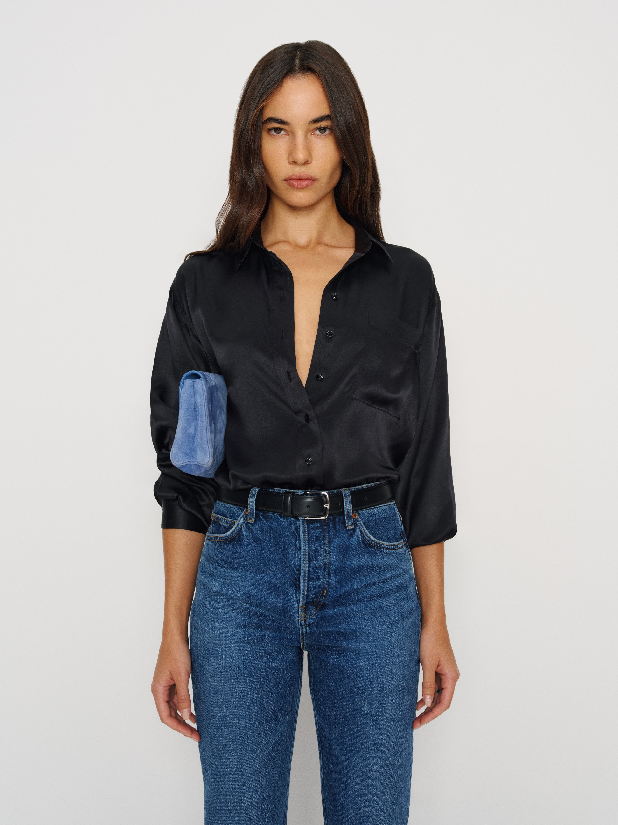 Smooth. Shop the Eli Oversized Silk Shirt from Reformation, a shirt with a collared neckline and button front. Good for work, and whatever you're doing after.