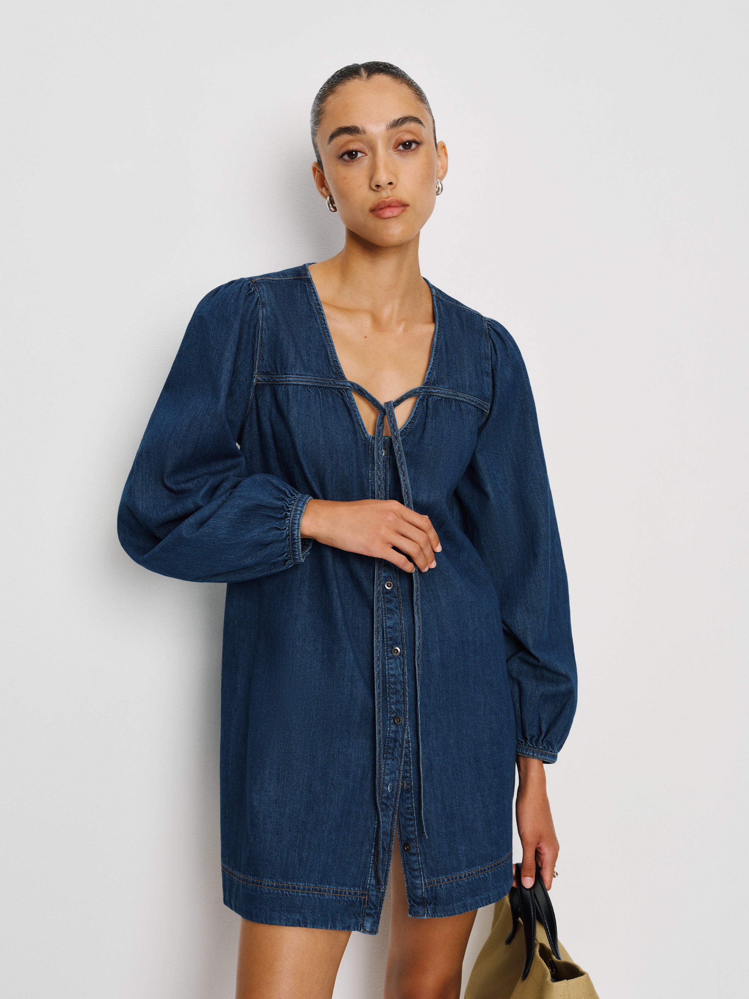 You must be new. Shop the Elowen Denim Mini Dress from Reformation, a long-sleeved mini dress with puff sleeves, a button front, and an adjustable tie detail.