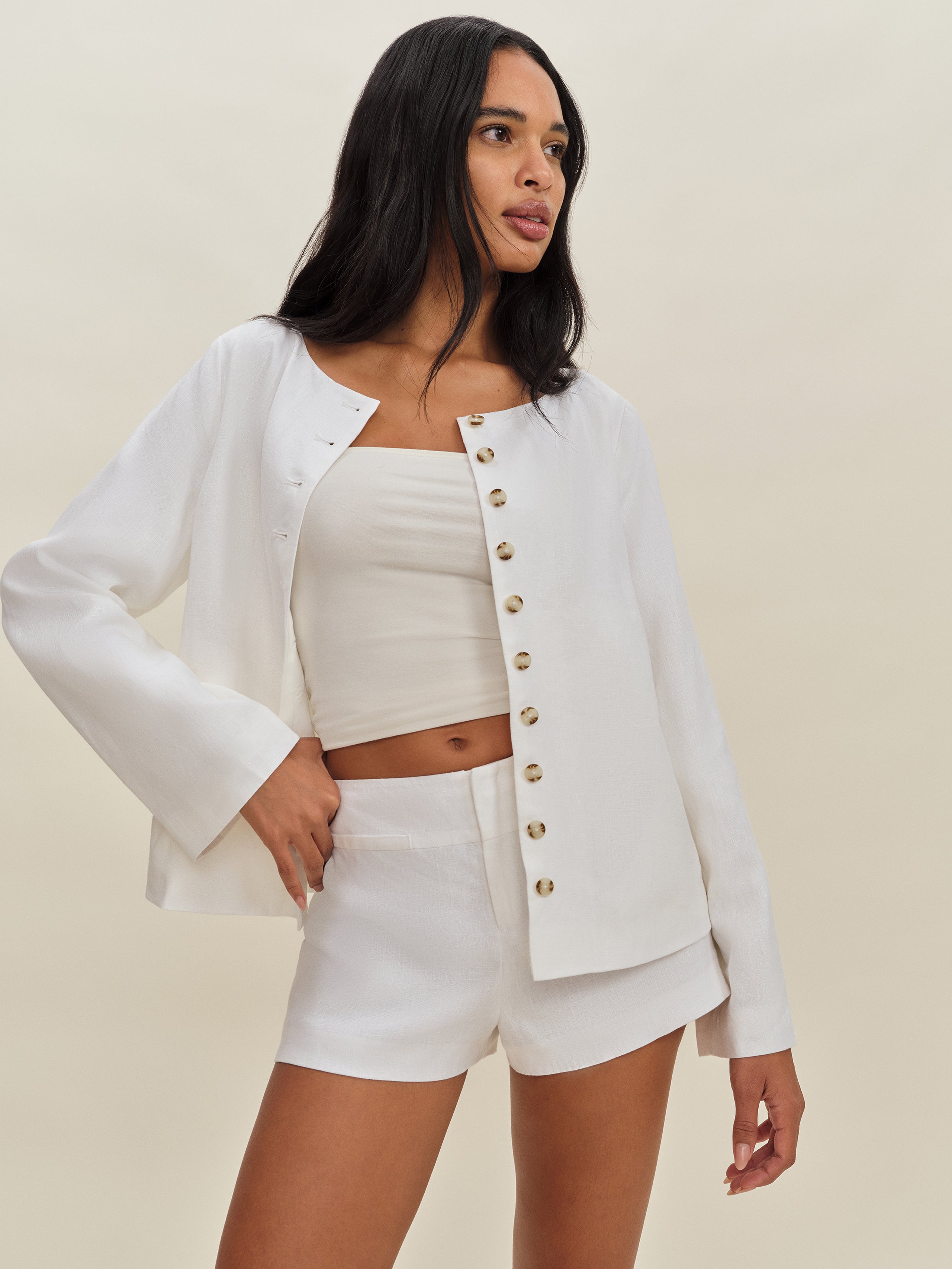 Let those legs out. Shop the Everett Short from Reformation, a mid-rise short with seam detailing, a zip closure, and adjustable buttons at the waist.