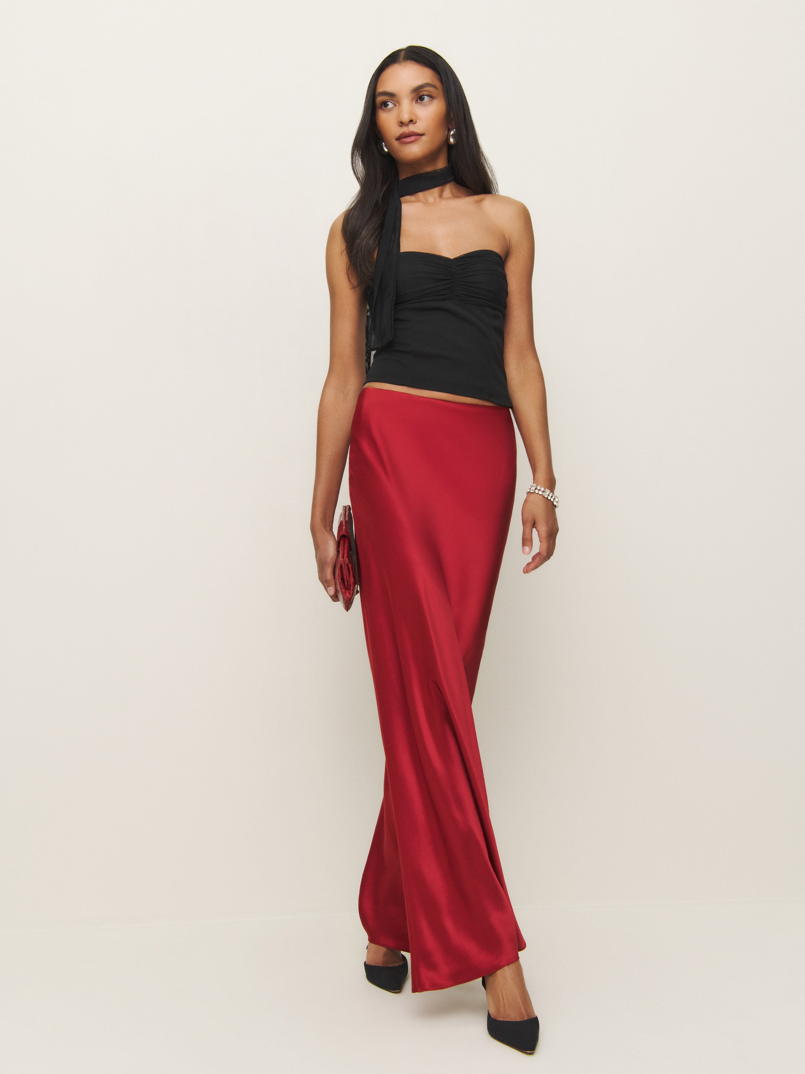 Up top. Shop the Ezra Knit Top from Reformation, a strapless knit top with a sweetheart neckline, ruching throughout the bust, and a detachable neck scarf.