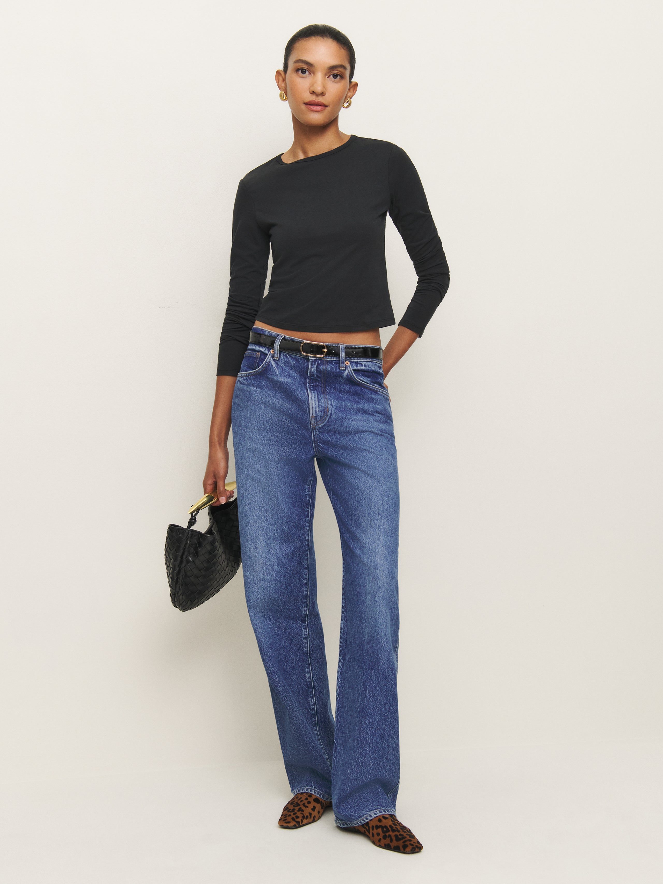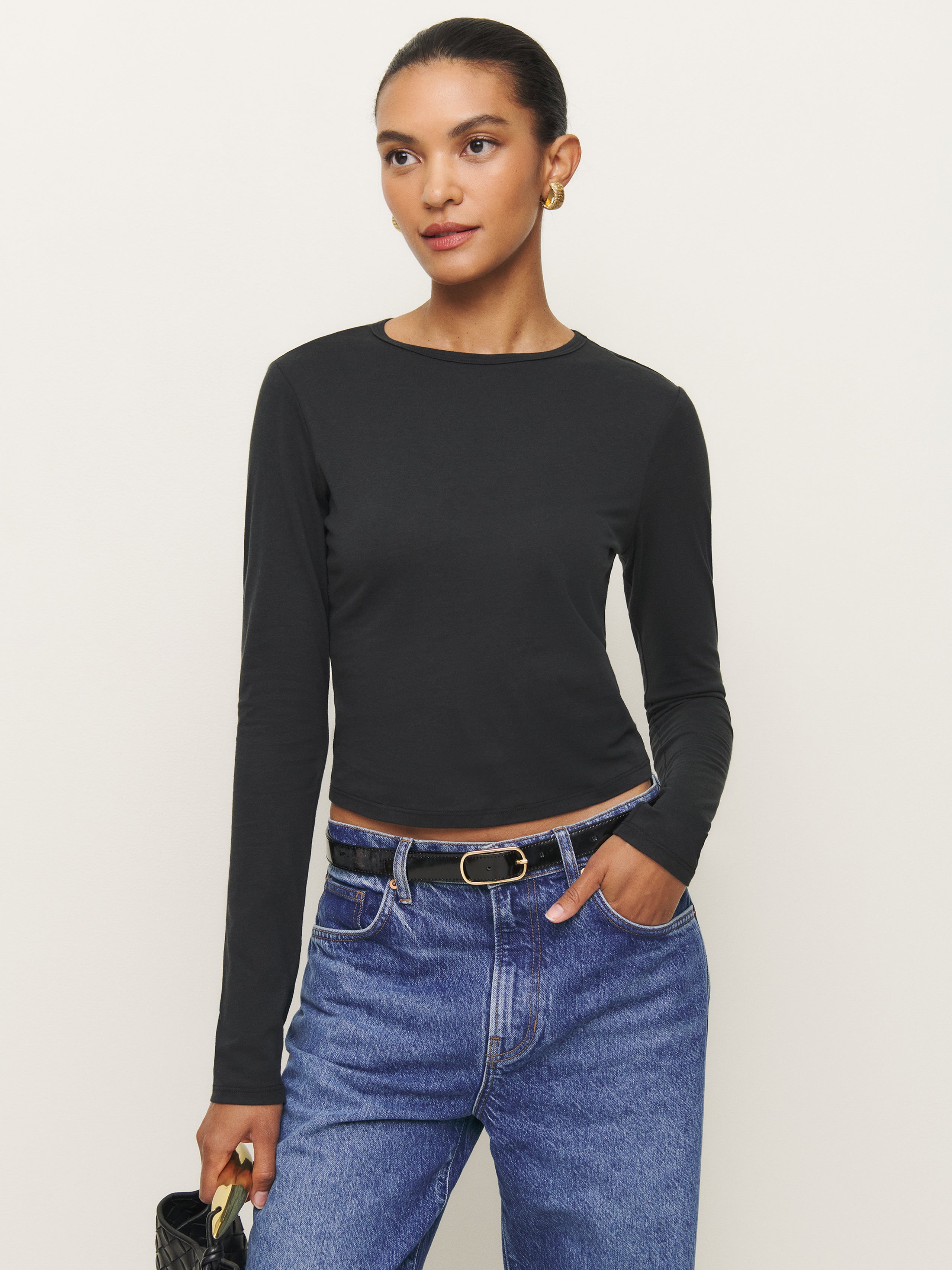 Shop the Ezra Slim Fit Long Sleeve from Reformation, a fitted long-sleeve tee with a crew neckline.