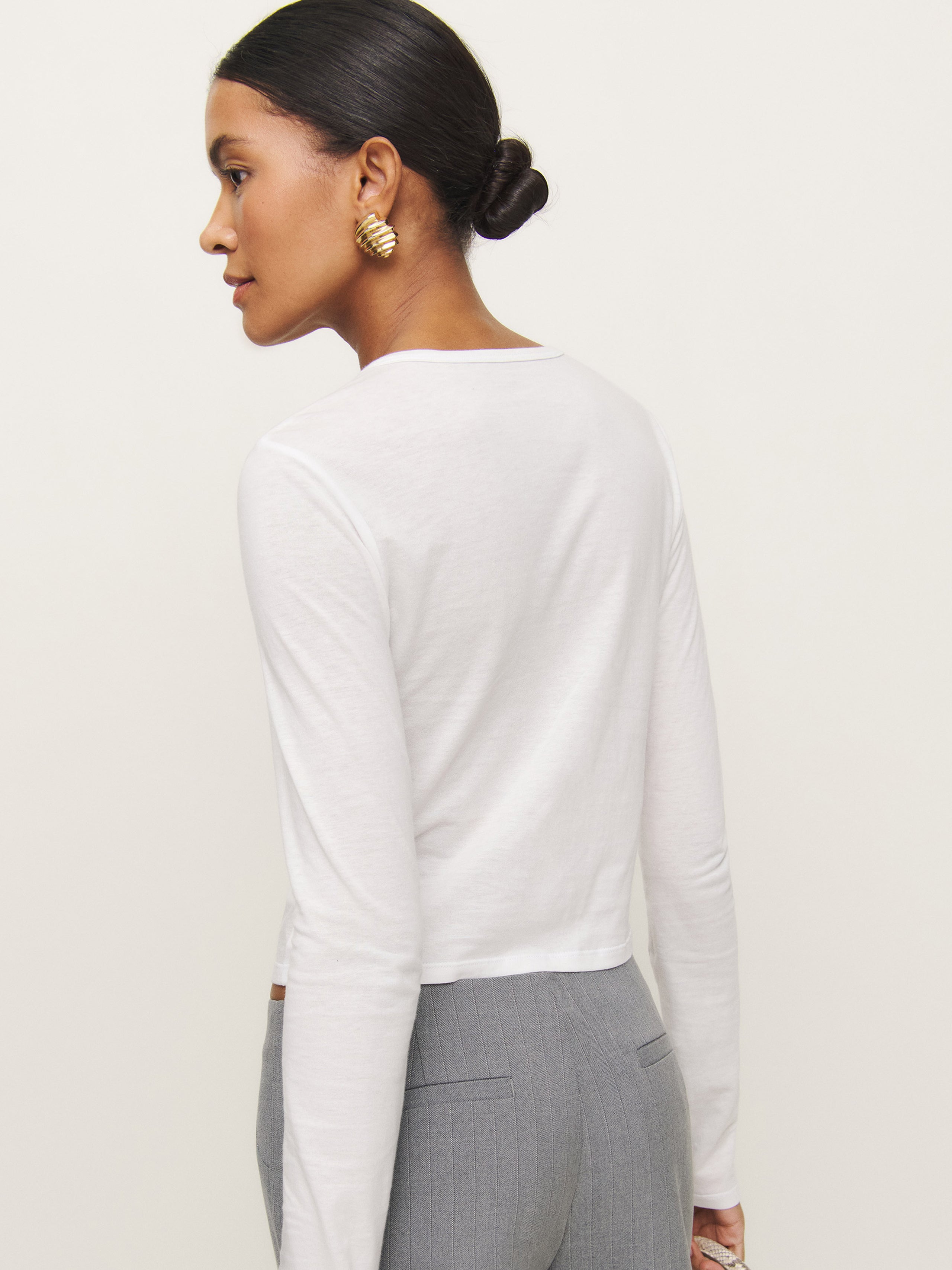 Shop the Ezra Slim Fit Long Sleeve from Reformation, a fitted long-sleeve tee with a crew neckline.