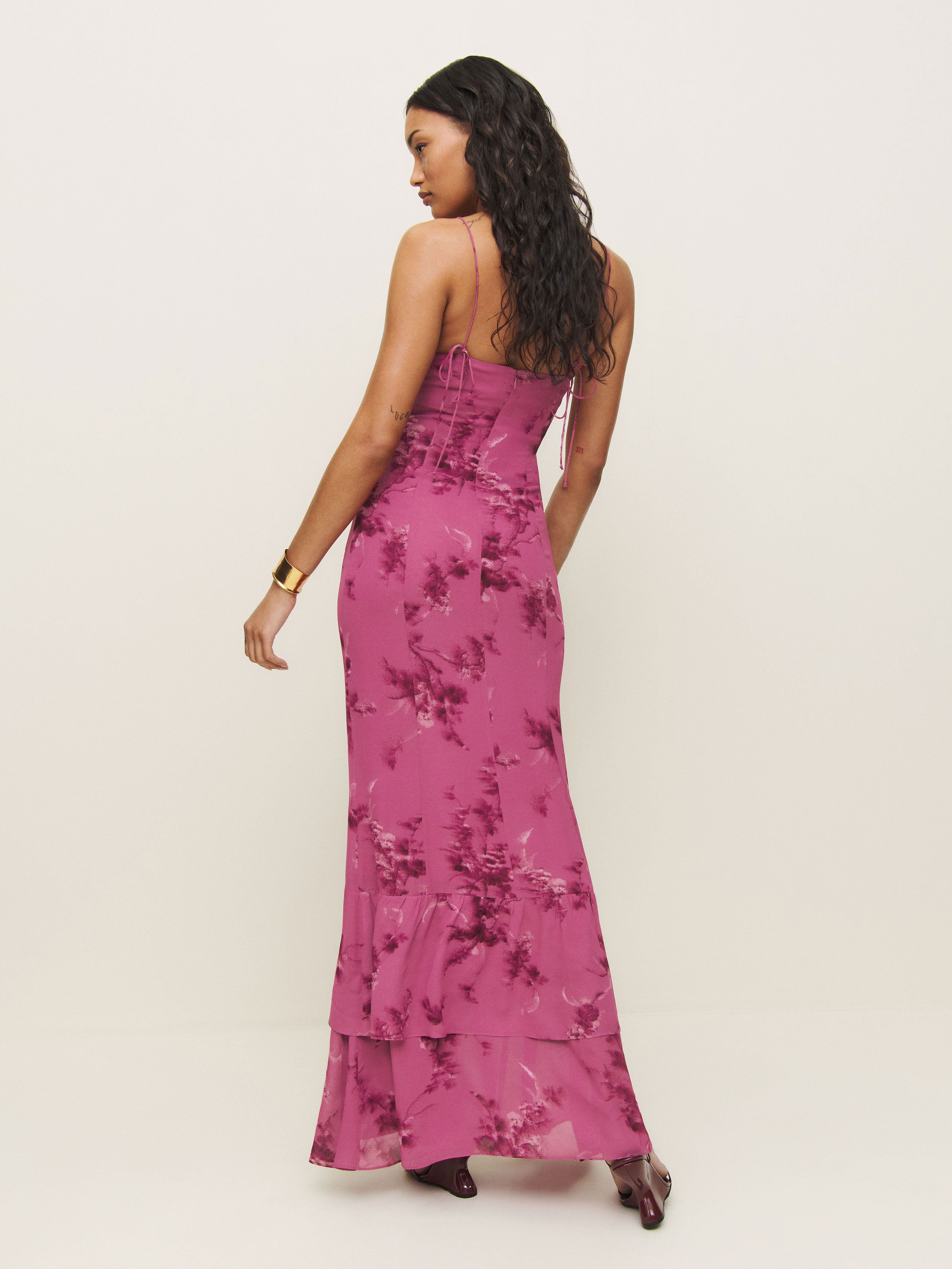 A little romance. Shop the Fallon Dress from Reformation, is a maxi dress with a sweetheart neckline, tie-straps and ruffles. It's fitted with bust cup details.