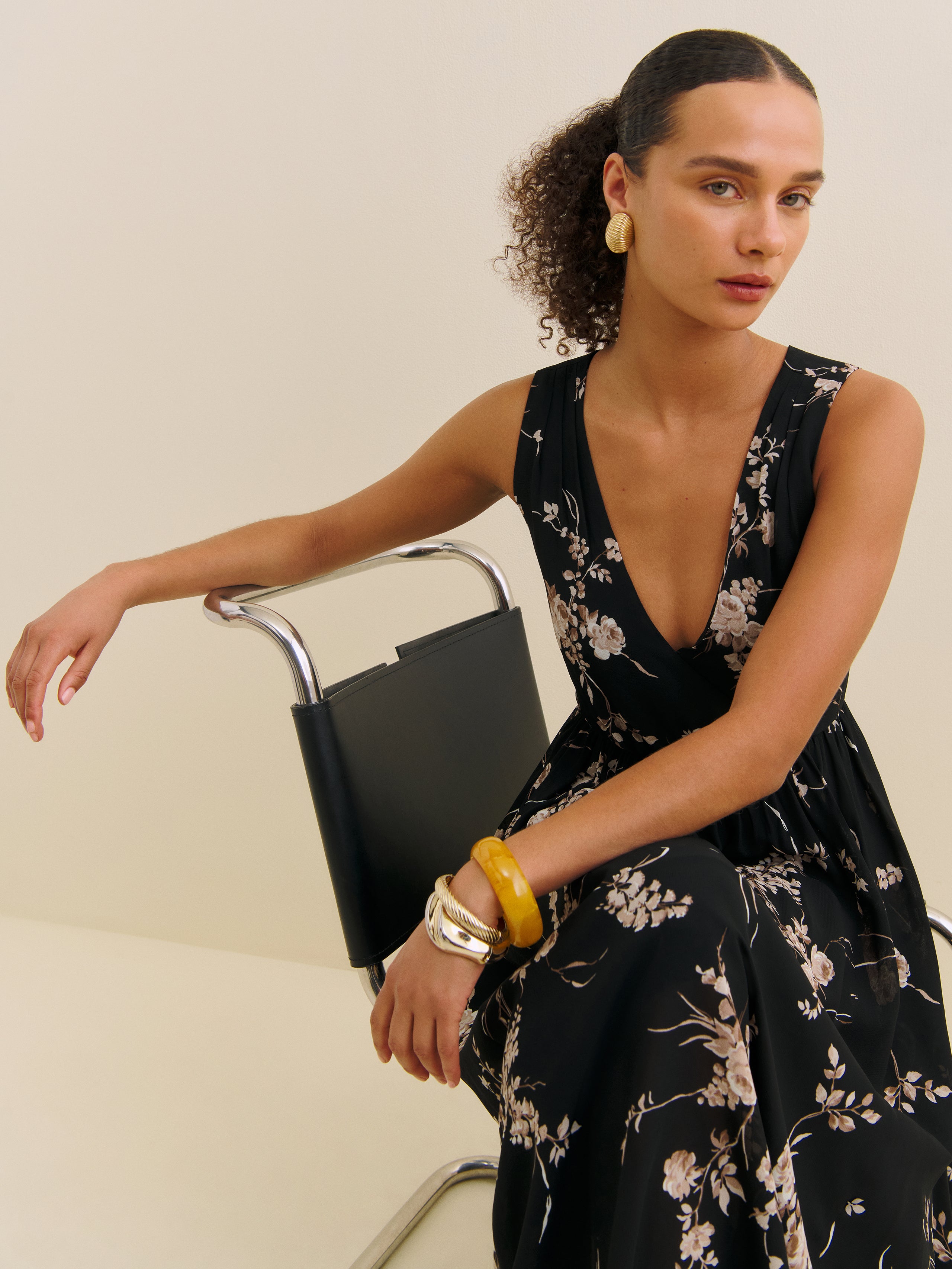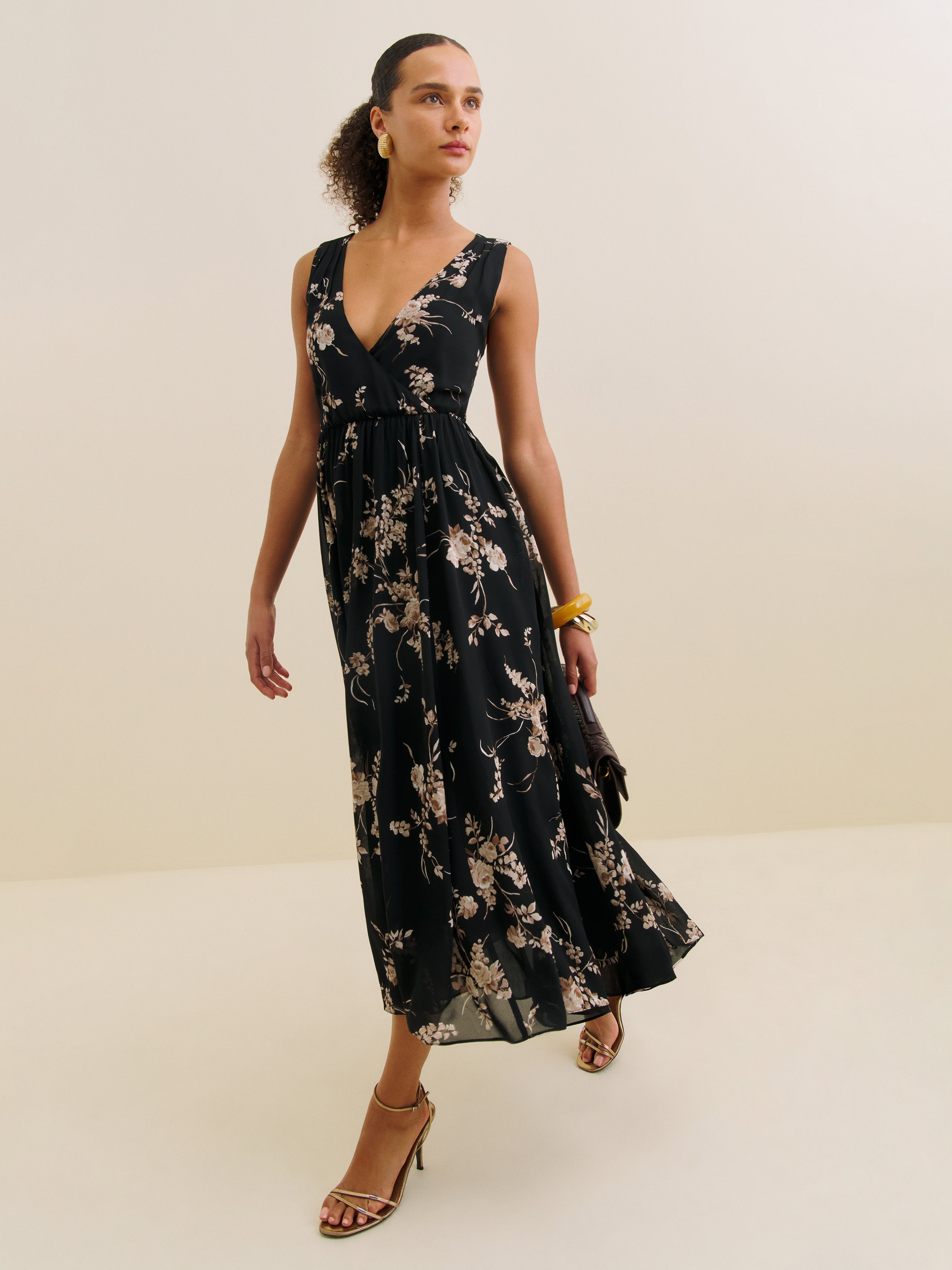 Wear the dress. Shop the Farah Dress from Reformation, a sleeveless midi dress with a v-neckline and pleating at the skirt.