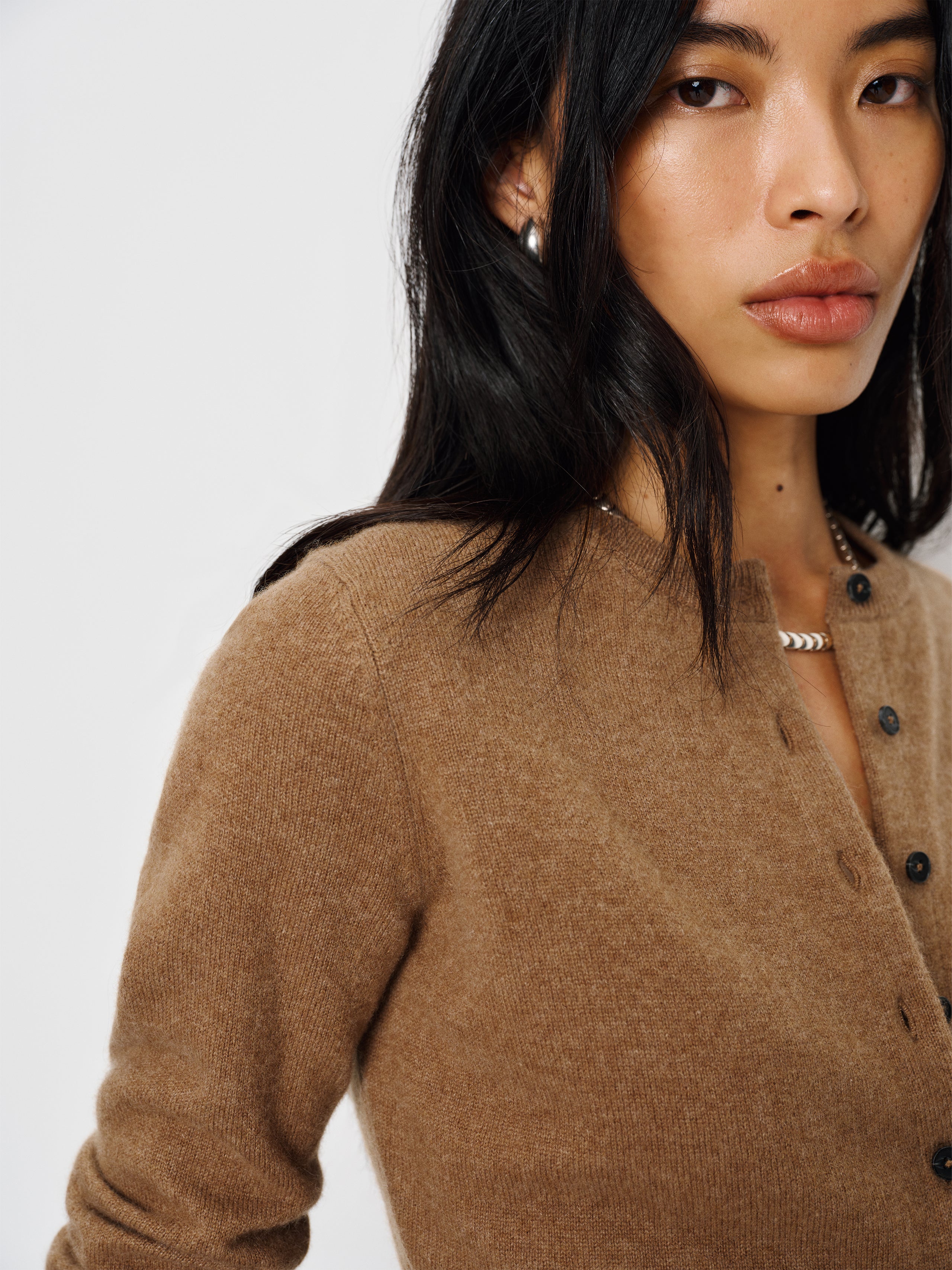 Who, me. Shop the Farren Cashmere Crew Cardigan from Reformation, a long-sleeved crew neck cardigan with a button front and ribbing at the cuffs and hem.