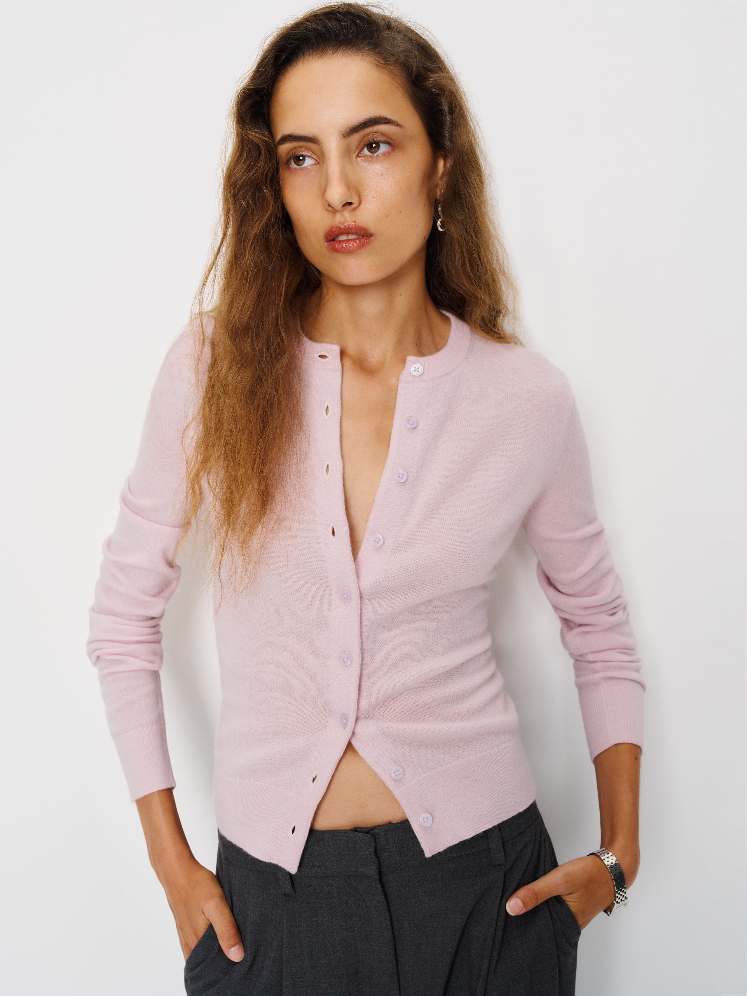Who, me. Shop the Farren Cashmere Crew Cardigan from Reformation, a long-sleeved crew neck cardigan with a button front and ribbing at the cuffs and hem.