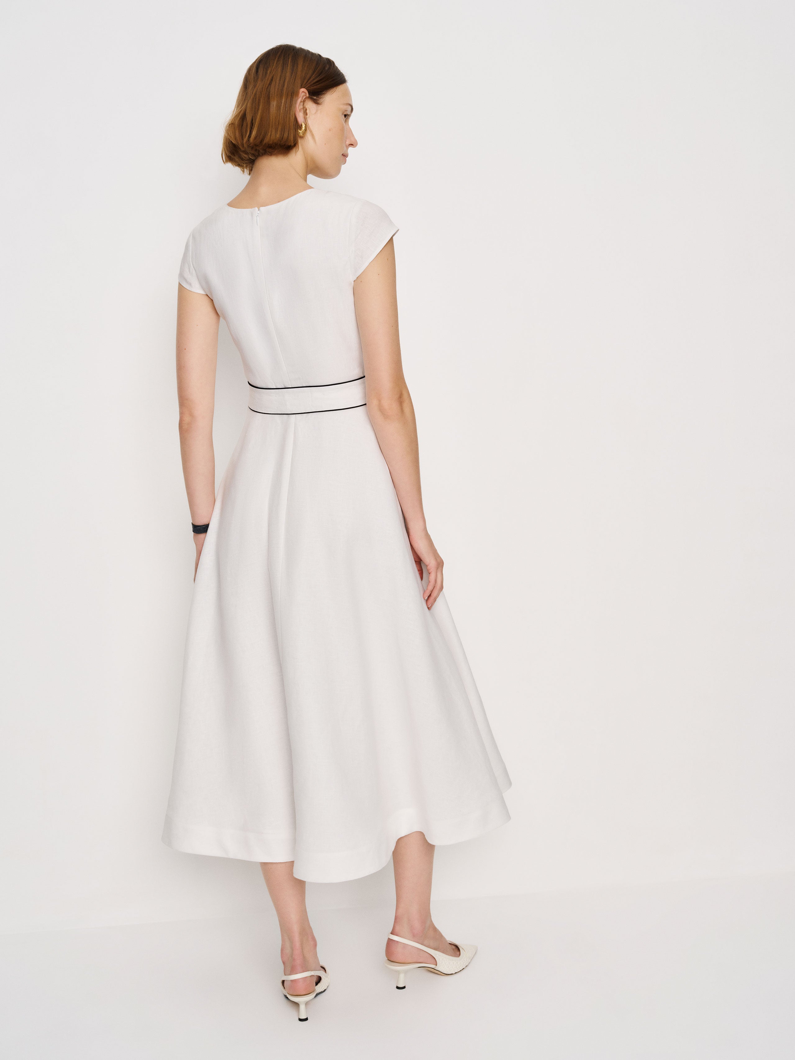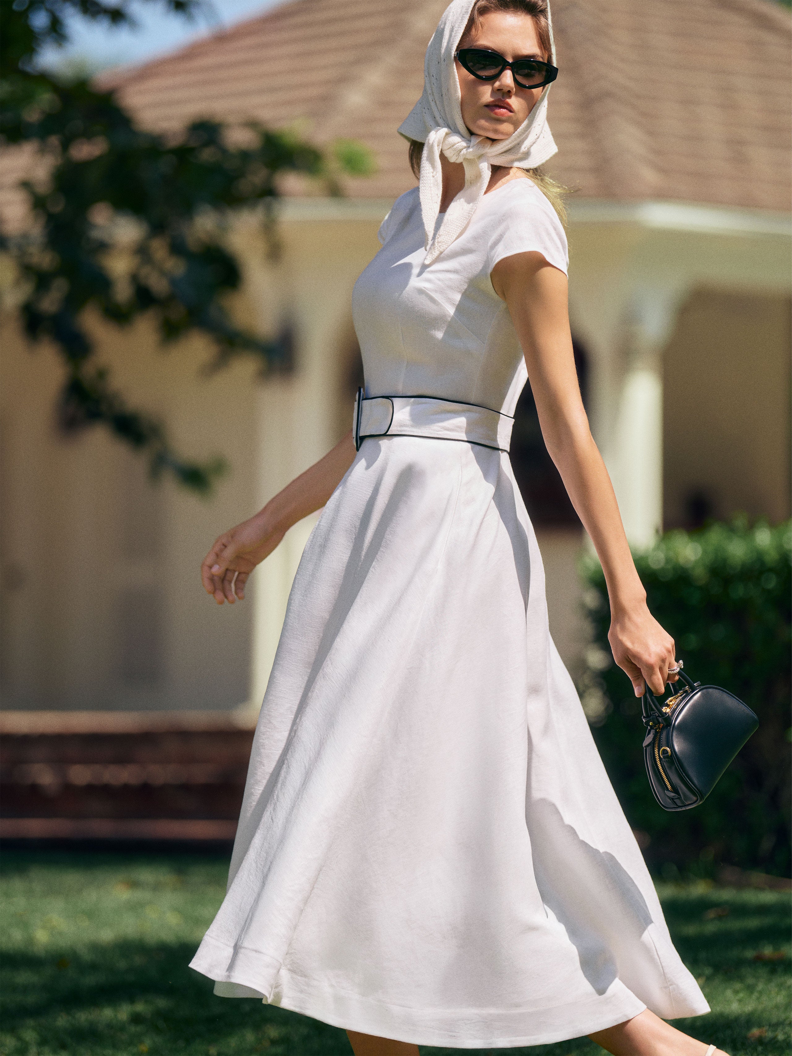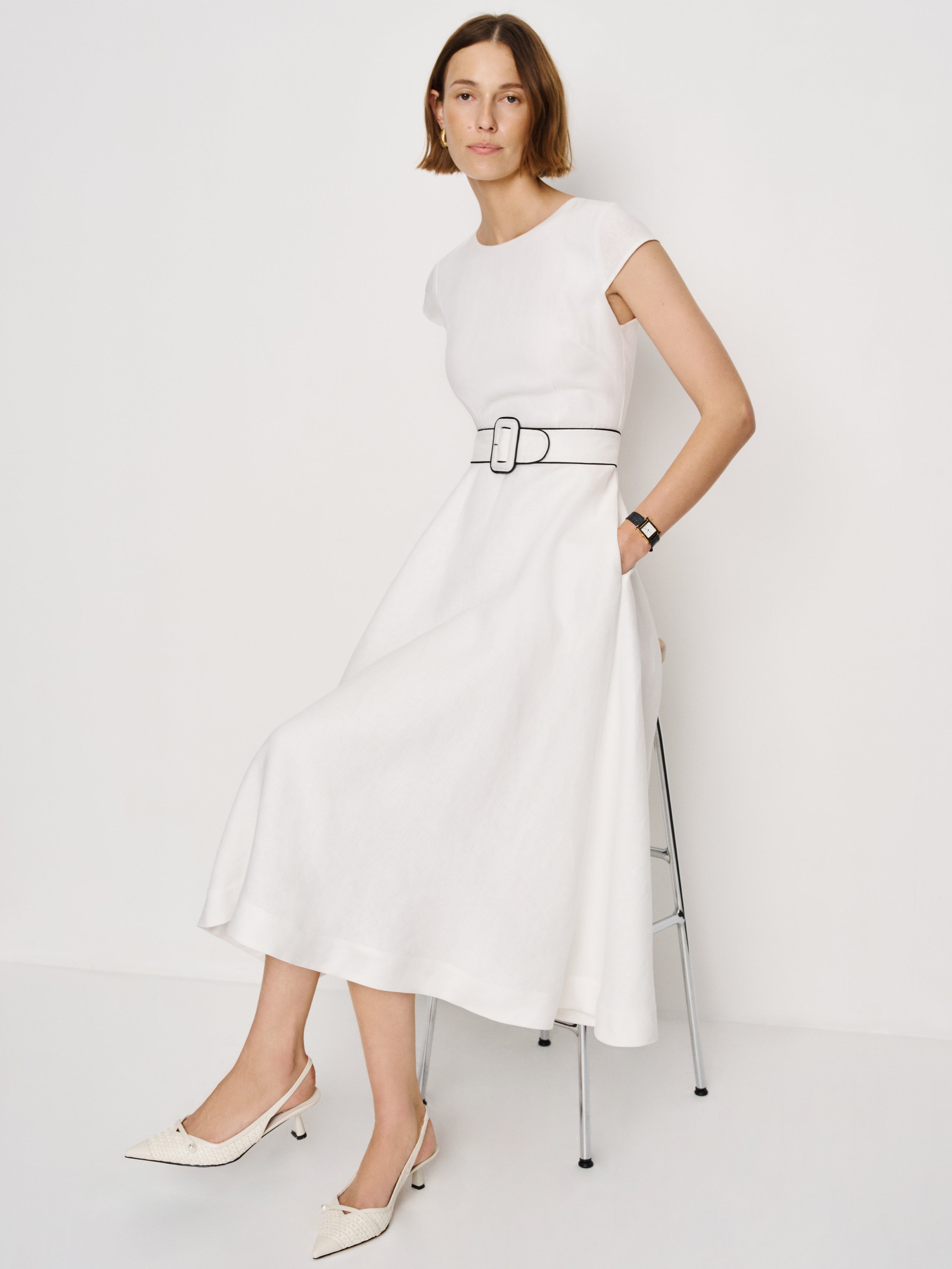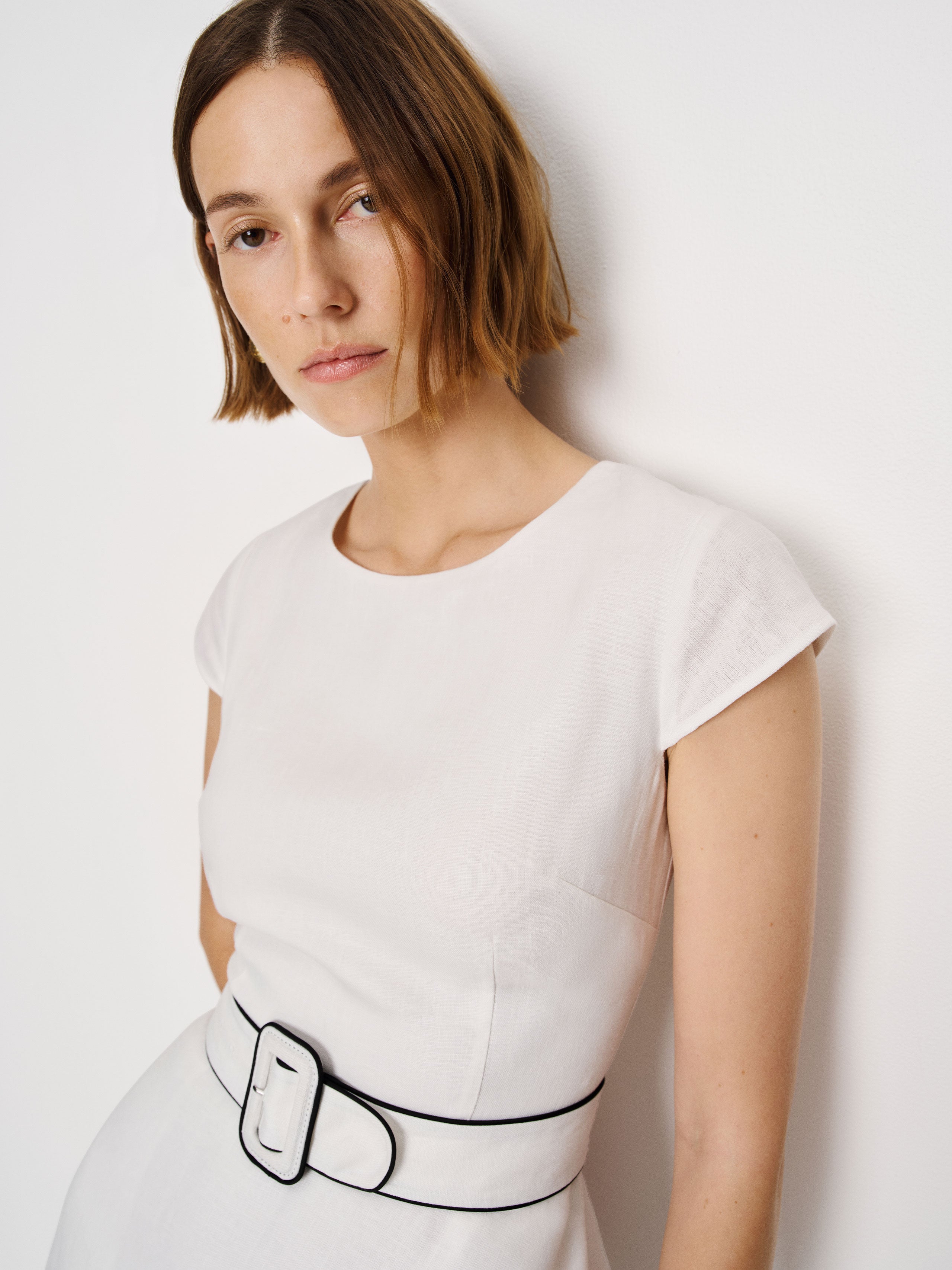 May cause compliments. Shop the Felipe Belted Linen Dress from Reformation, a midi short-sleeved dress with an A-line fit and an adjustable belt detail.