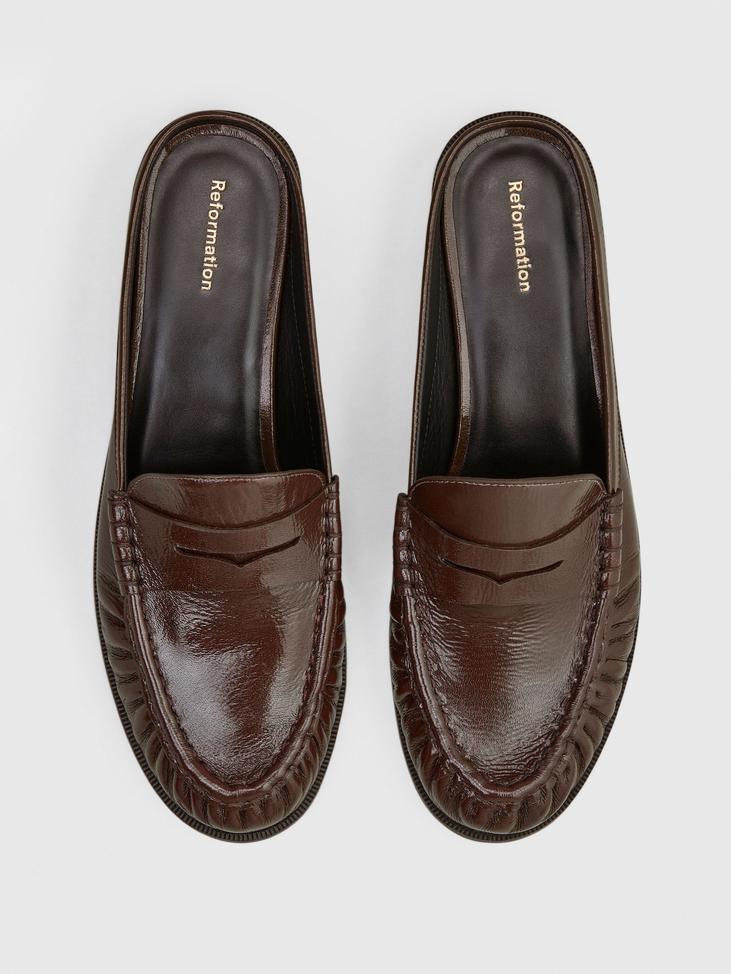 Who, me. Shop the Francine Loafer Mule from Reformation, a loafer with a rounded toe and ruching details. Good for work, and whatever you're doing after.