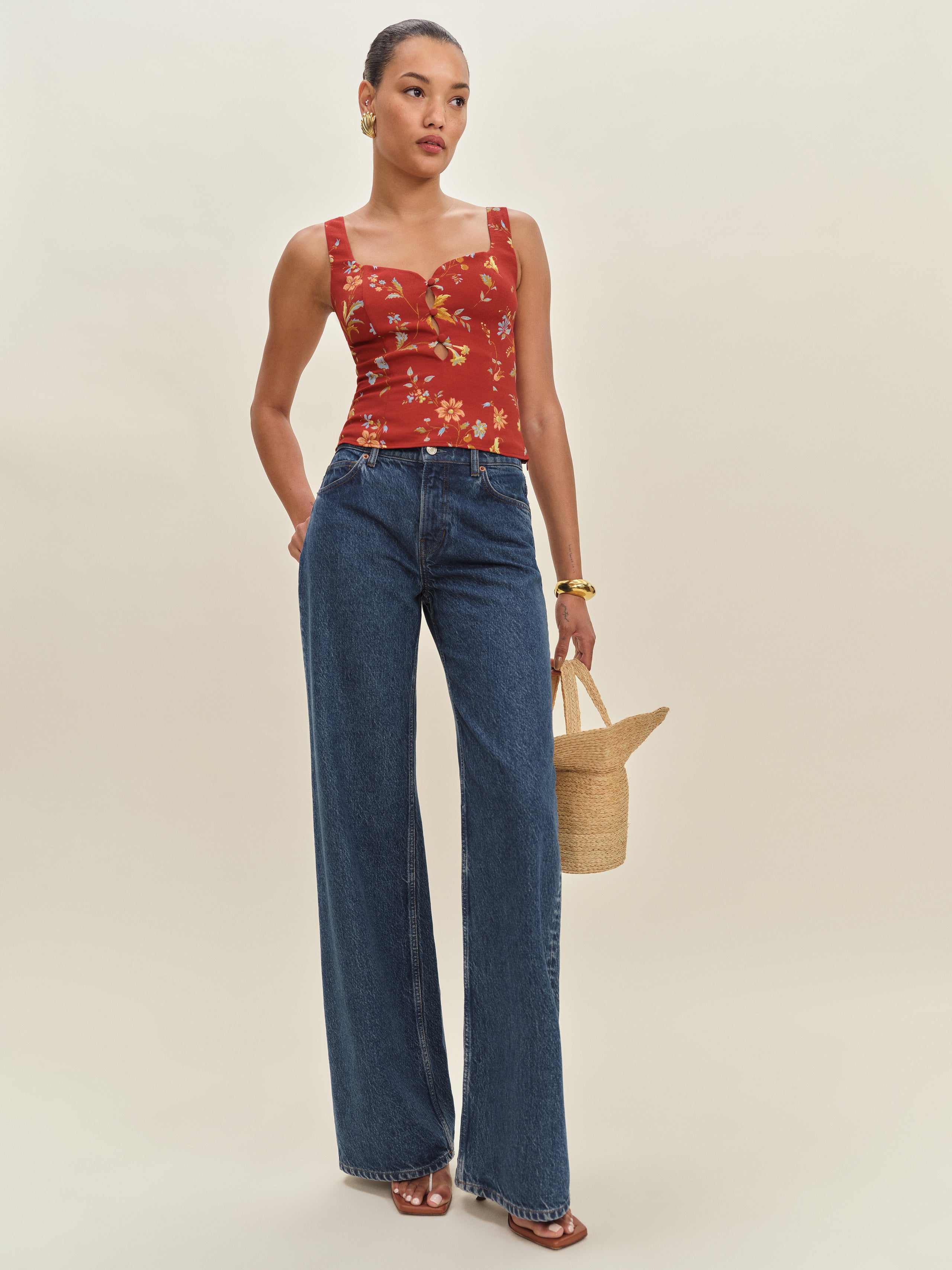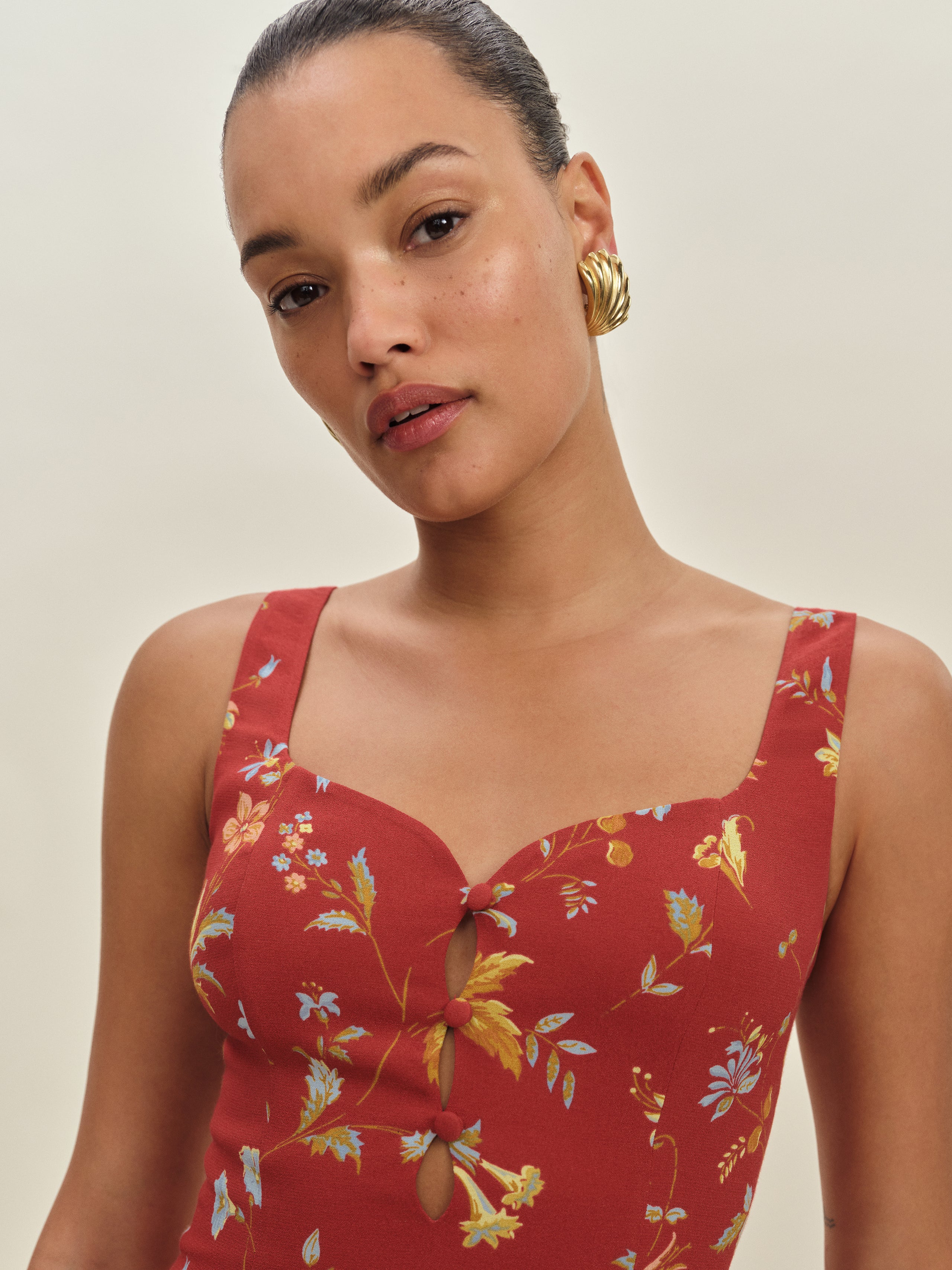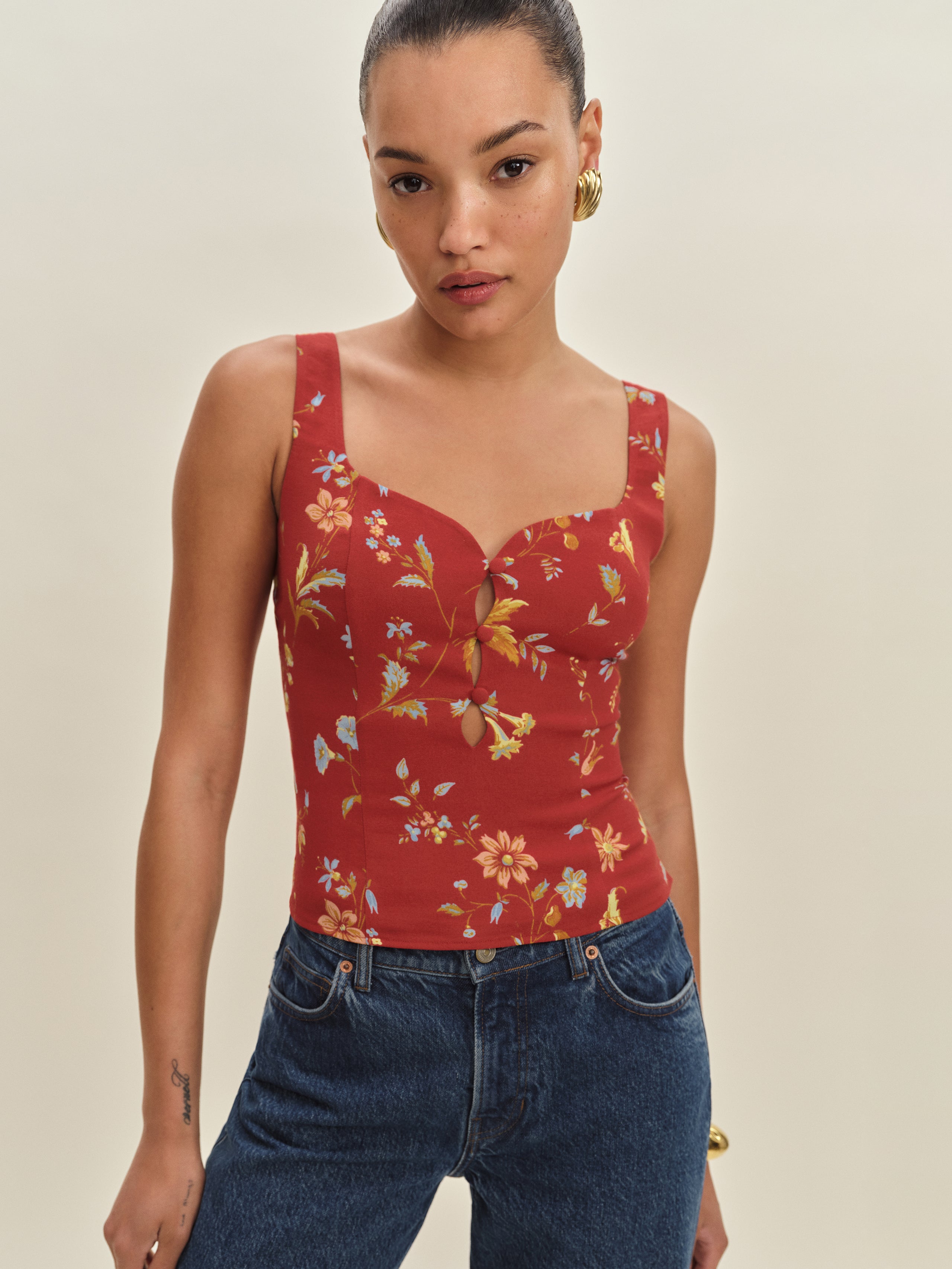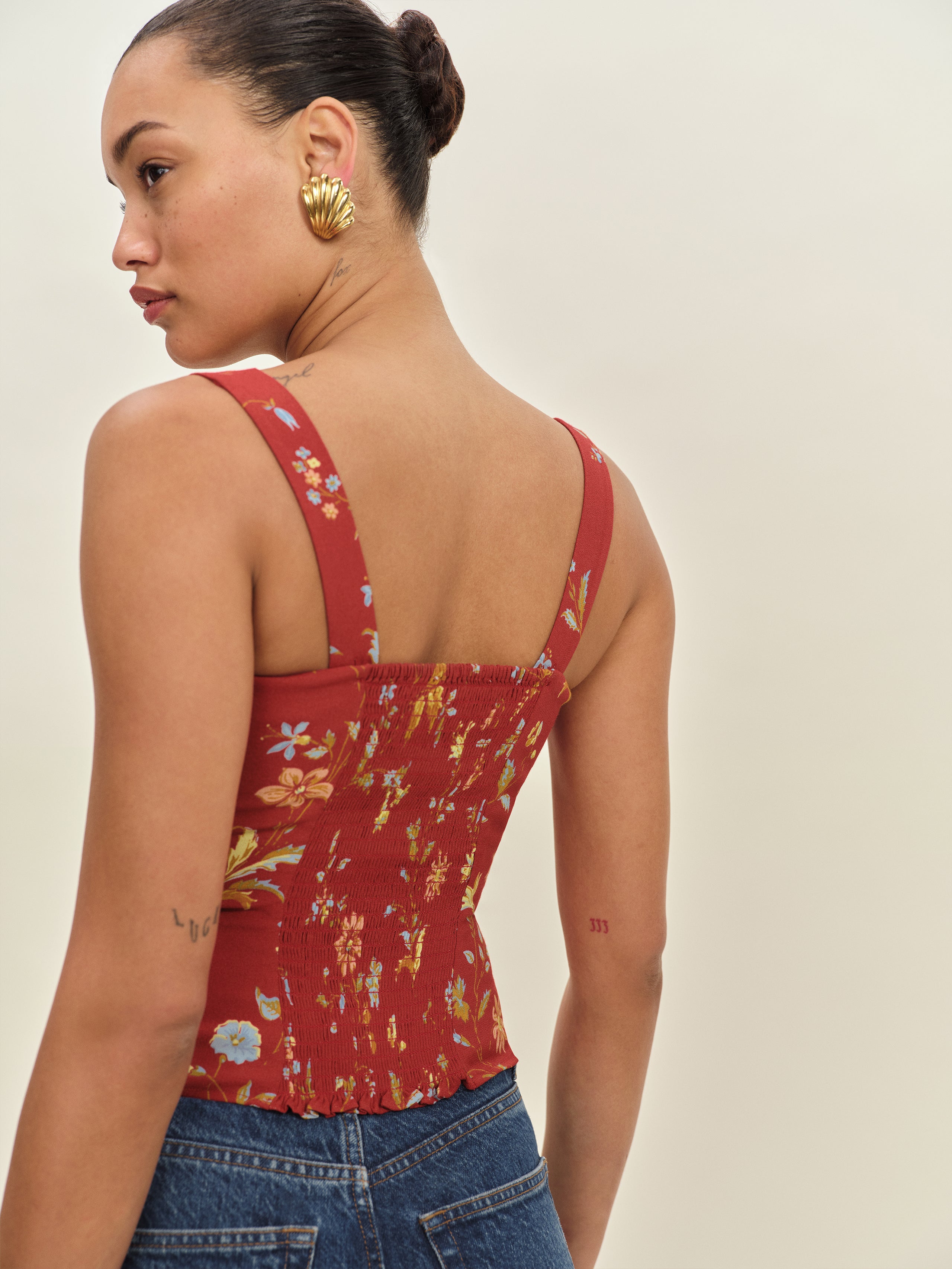 What do we have here? Shop the Francy Top from Reformation, a sleeveless top with a sweetheart neckline, button details at the bust, and smocking in the back.
