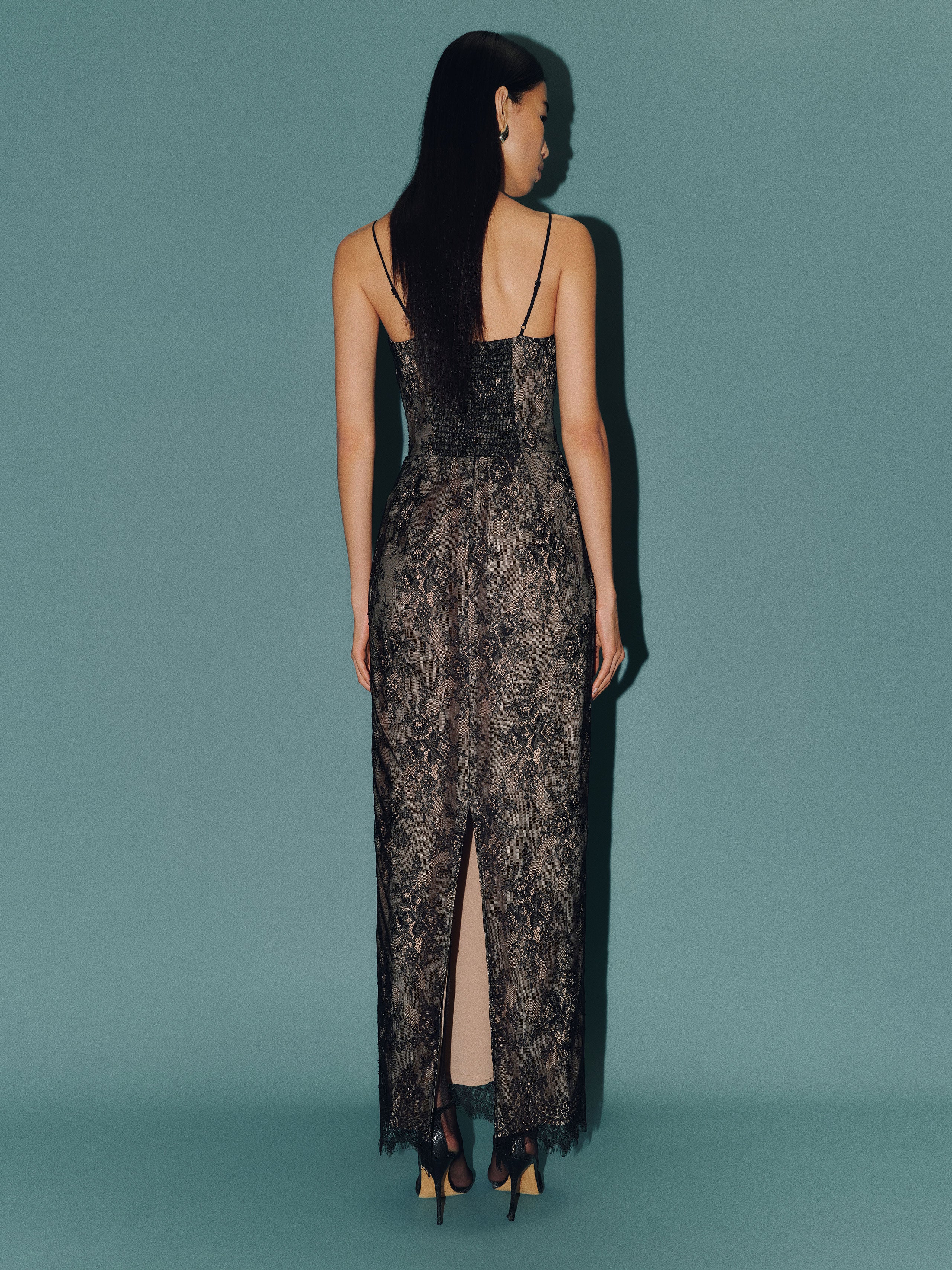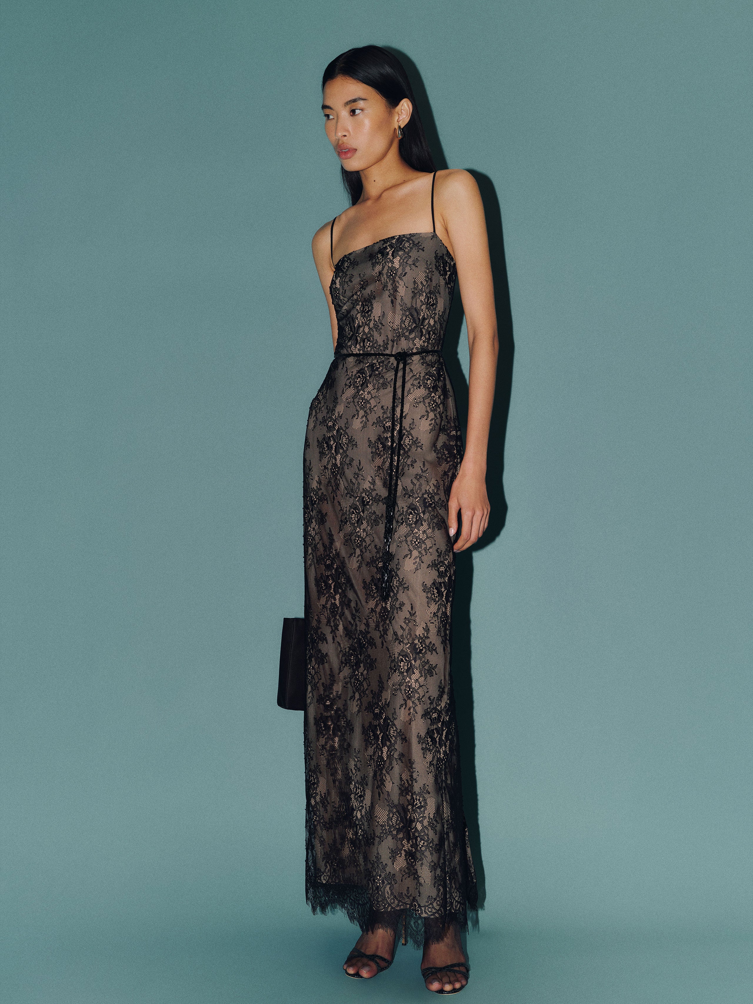 Slinky. Shop the Frankie Dress from Reformation, a slim-fitting midi dress with a straight neckline, spaghetti straps, and a center back slit.