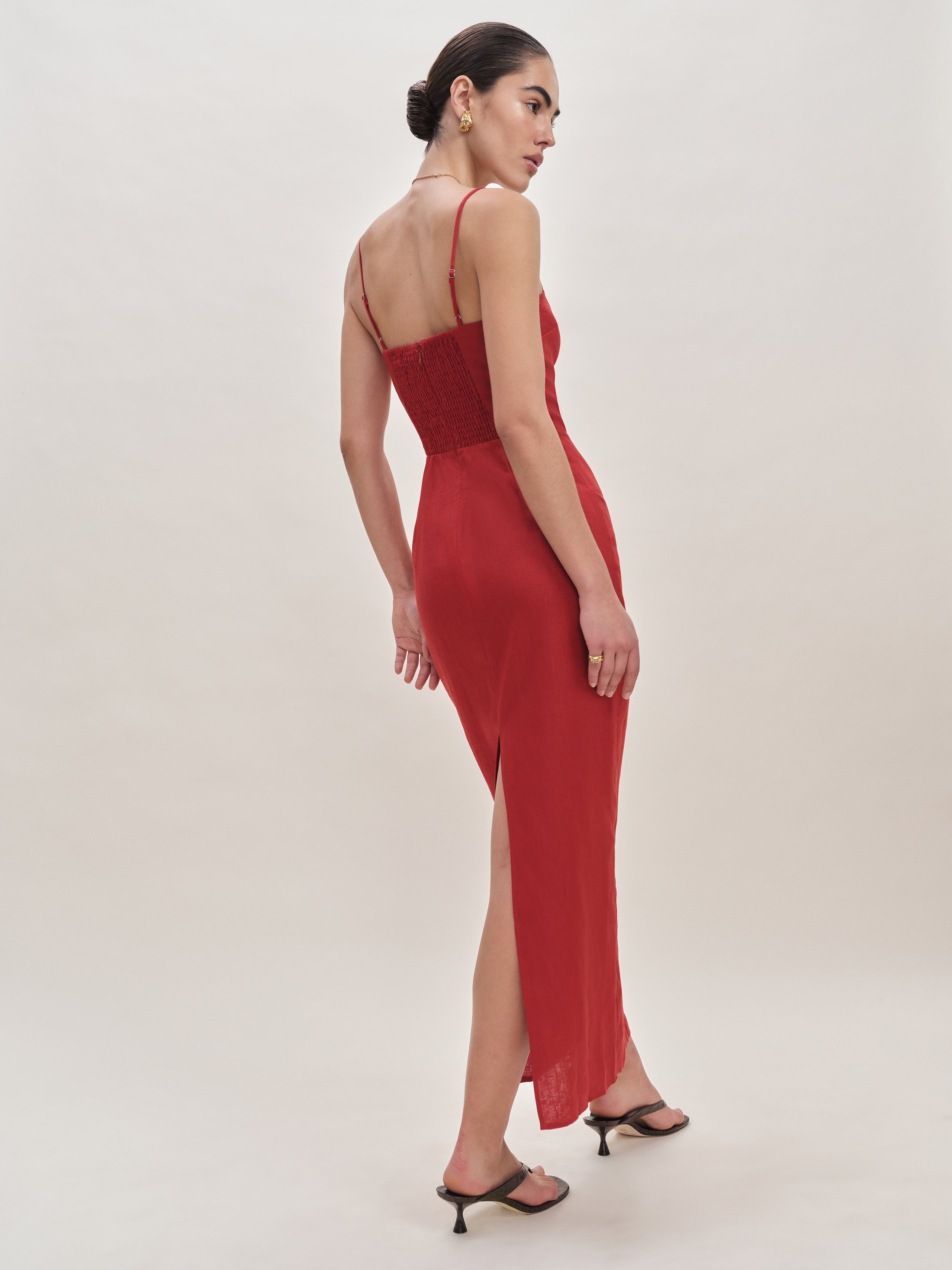 Wear me. Shop the Frankie Linen Dress from Reformation, a slim fitting dress with a straight neckline, non-adjustable spaghetti straps and a center back slit.