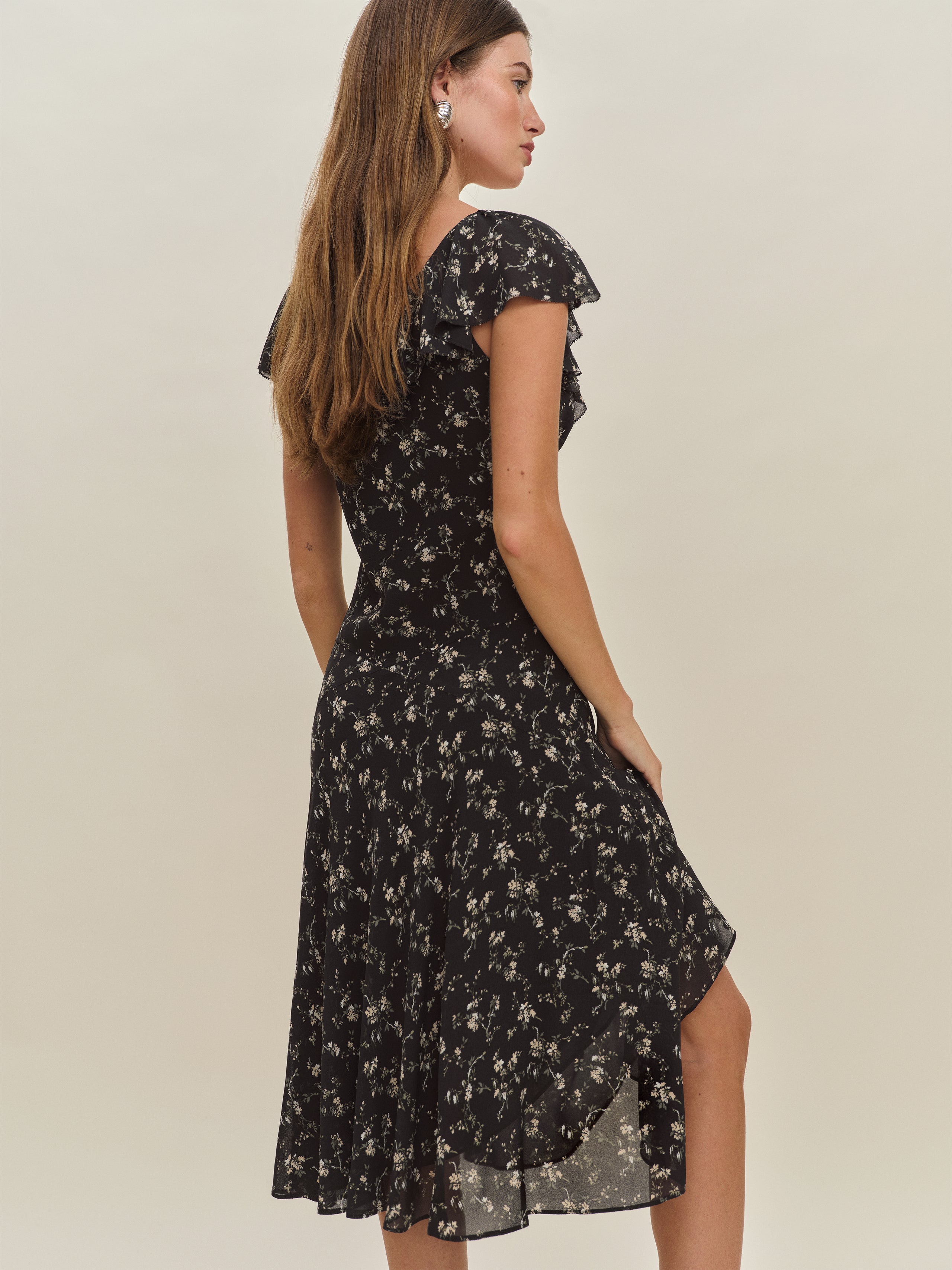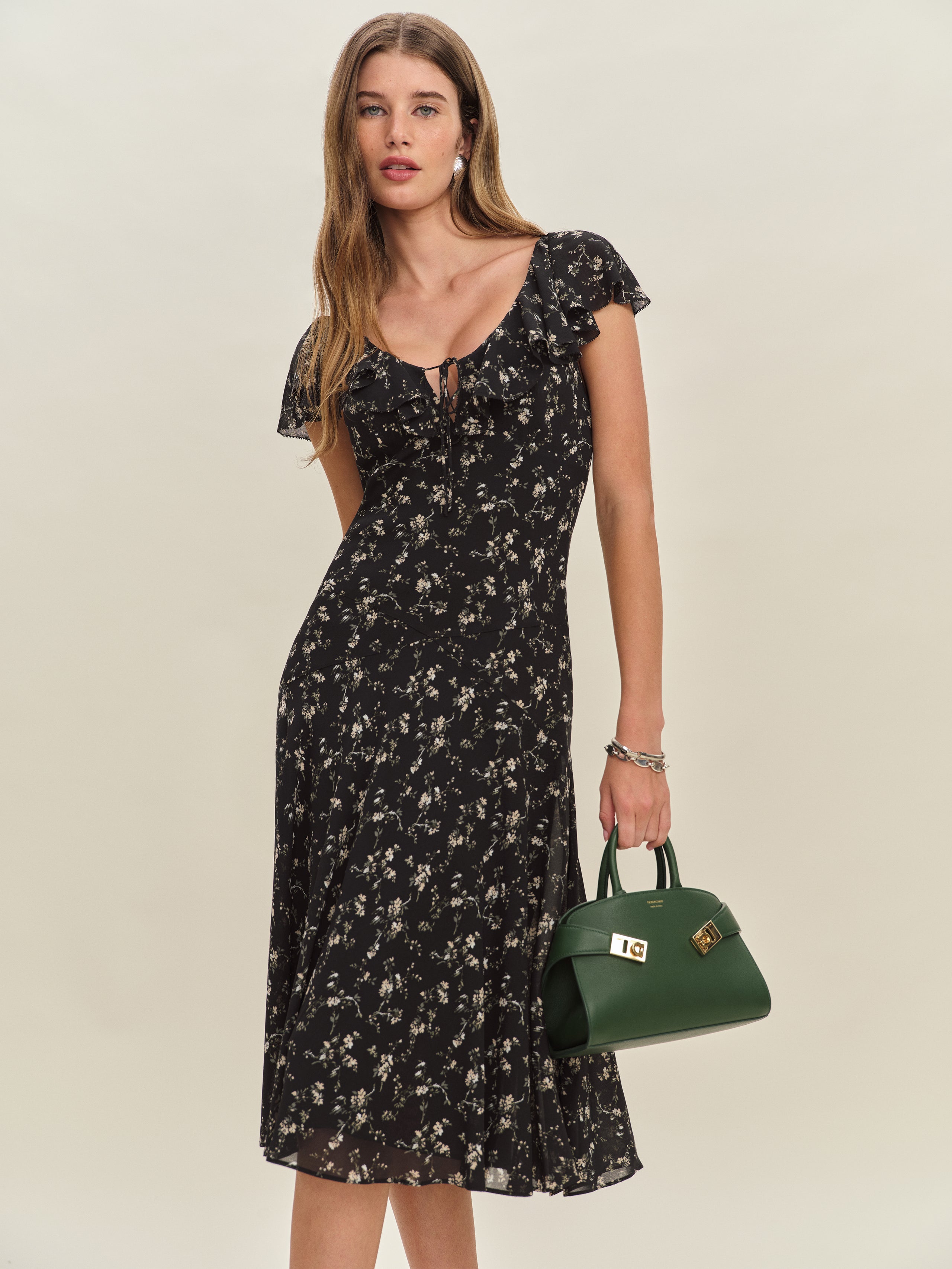 How classic. Shop the Gaelle Dress from Reformation, a midi dress with capped flutter sleeves, a v-neckline, and an adjustable tie.