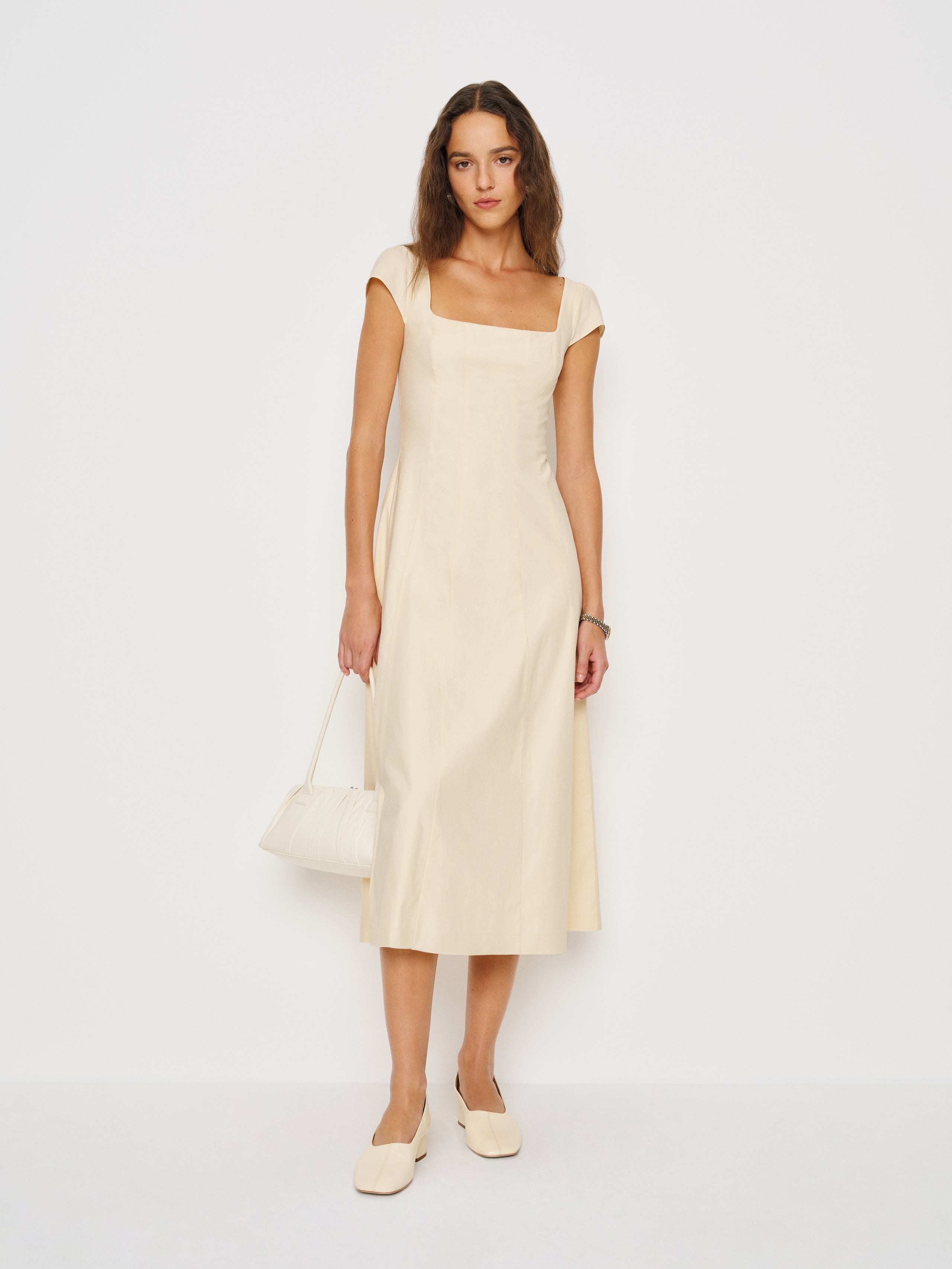 What do we have here? Shop the Harlie Dress from Reformation, a short-sleeved midi dress with a square neckline and cap sleeves.