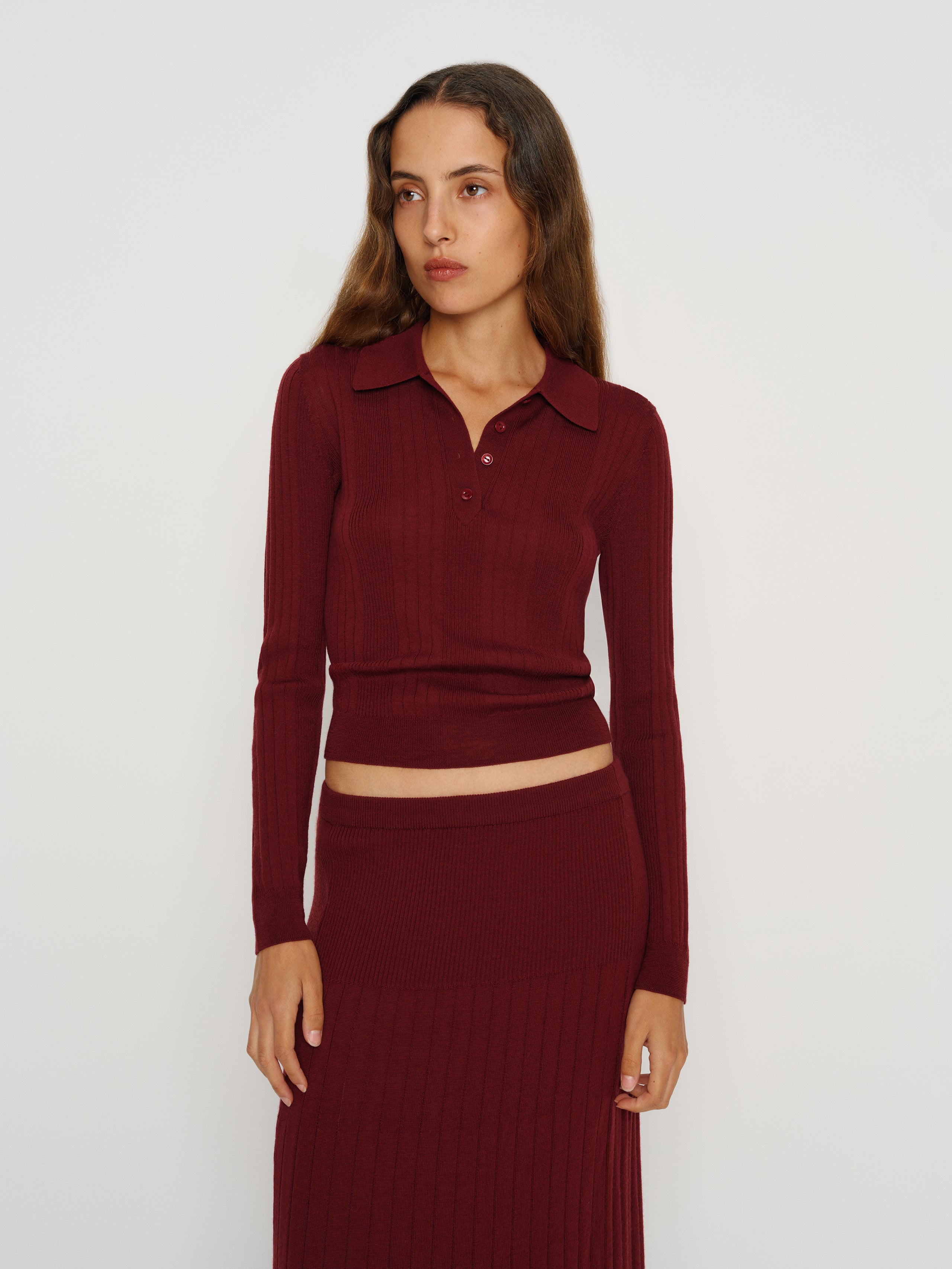 Layer up. Shop the Hermia Regenerative Merino Polo from Reformation, a long-sleeved polo, with center front buttons...
