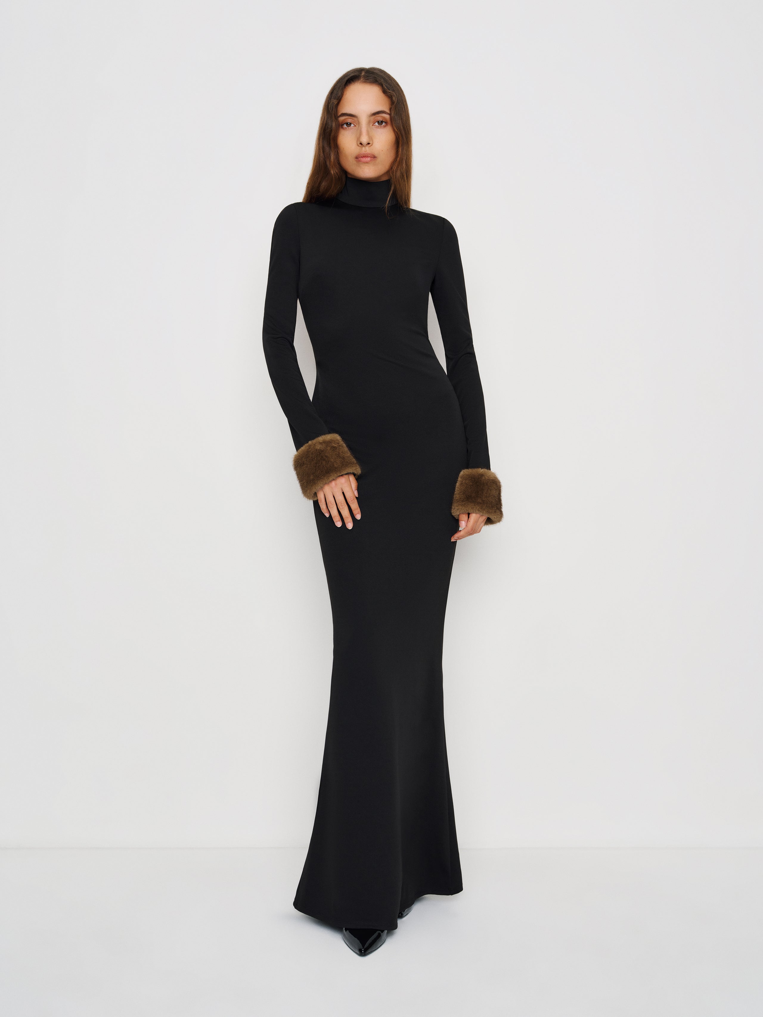 Detail oriented. Shop the Honey Knit Dress from Reformation, a long-sleeved maxi dress with a mock neckline, open back, and detachable fur cuffs.