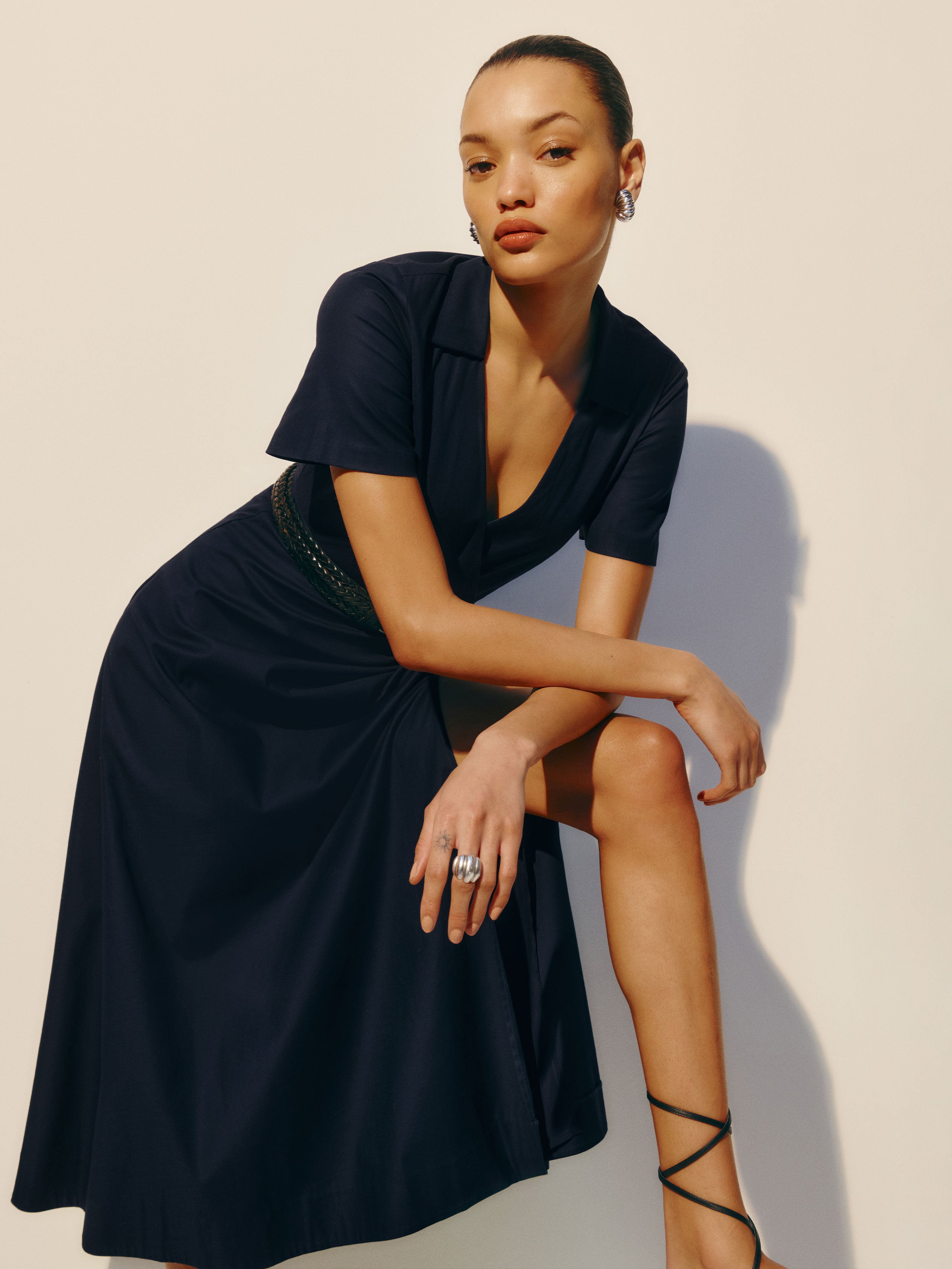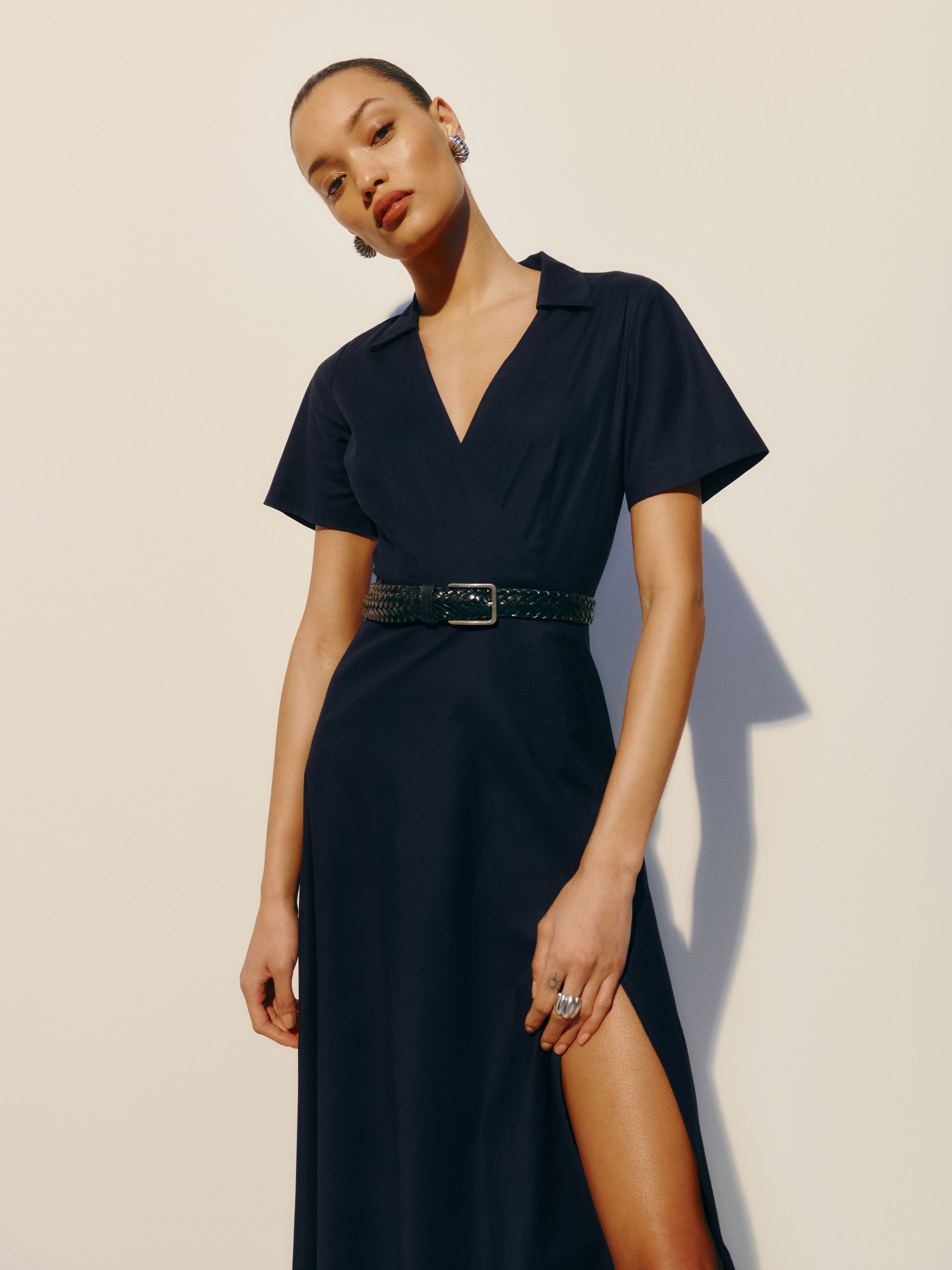 How classic. Shop the Isadora Dress from Reformation, a short sleeve, midi length dress with a wrap v neckline and side slit.
