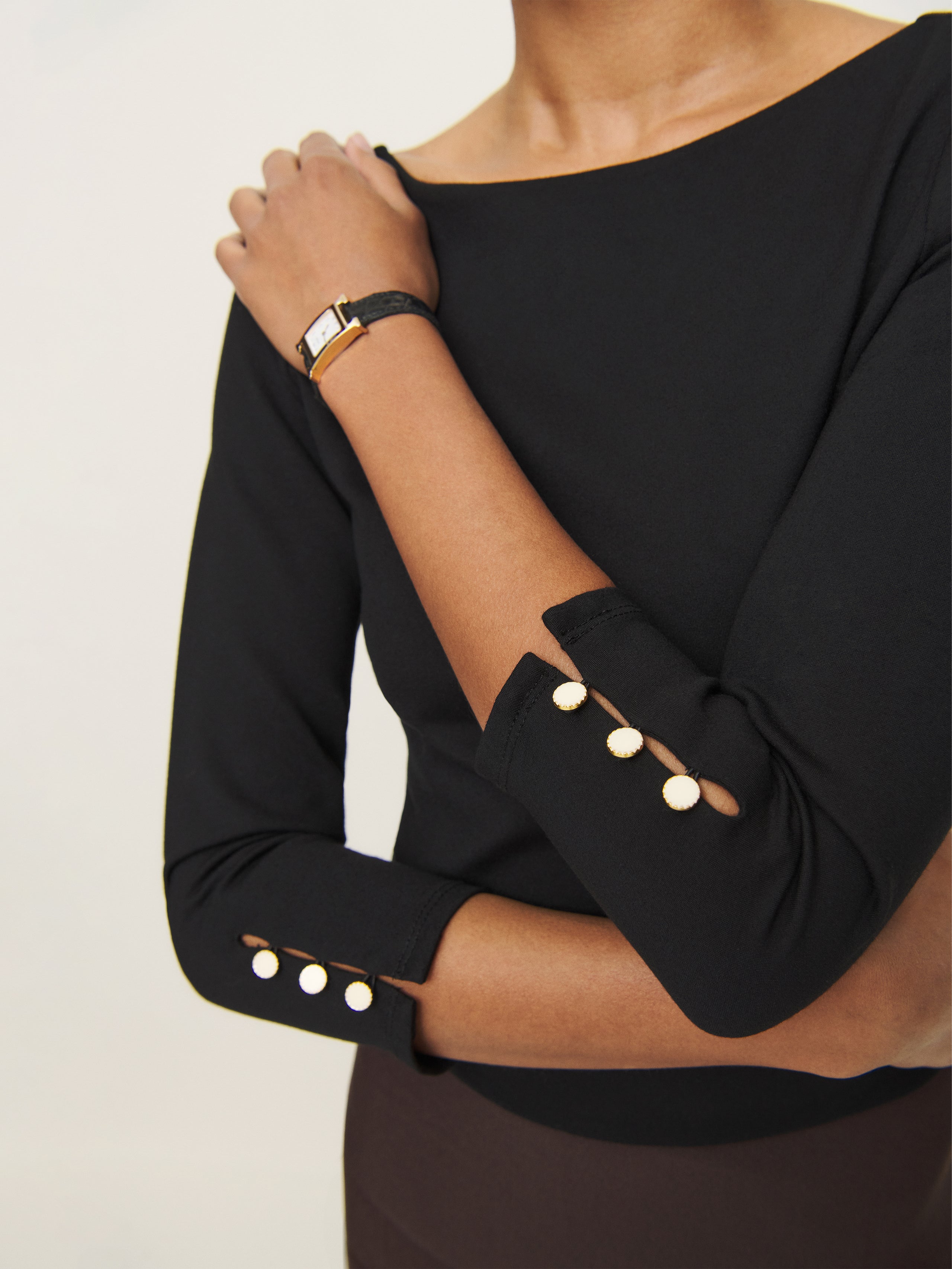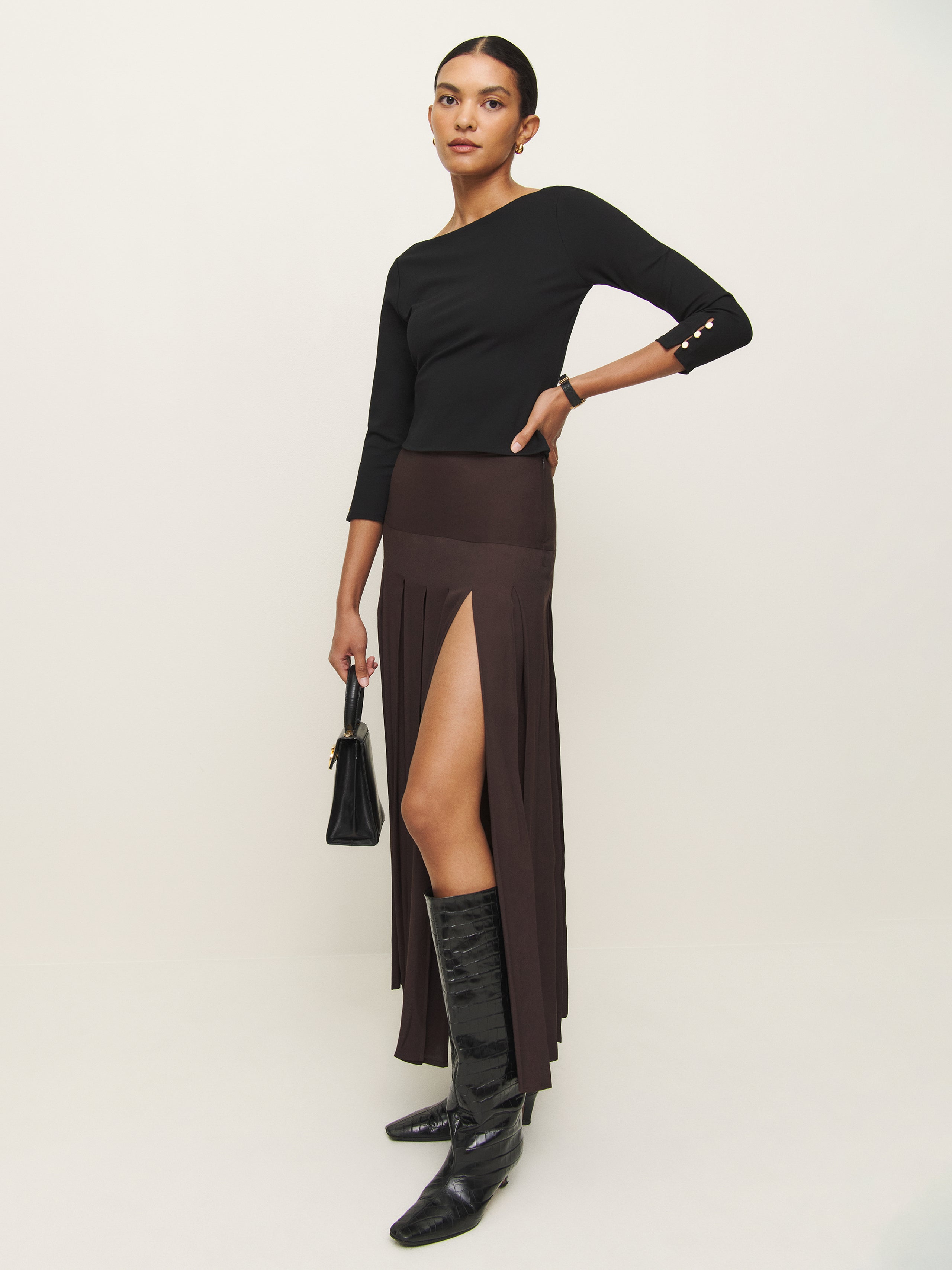 Up top. Shop the Jalen Knit Top from Reformation, a fitted top with 3/4-length sleeves, a boat...