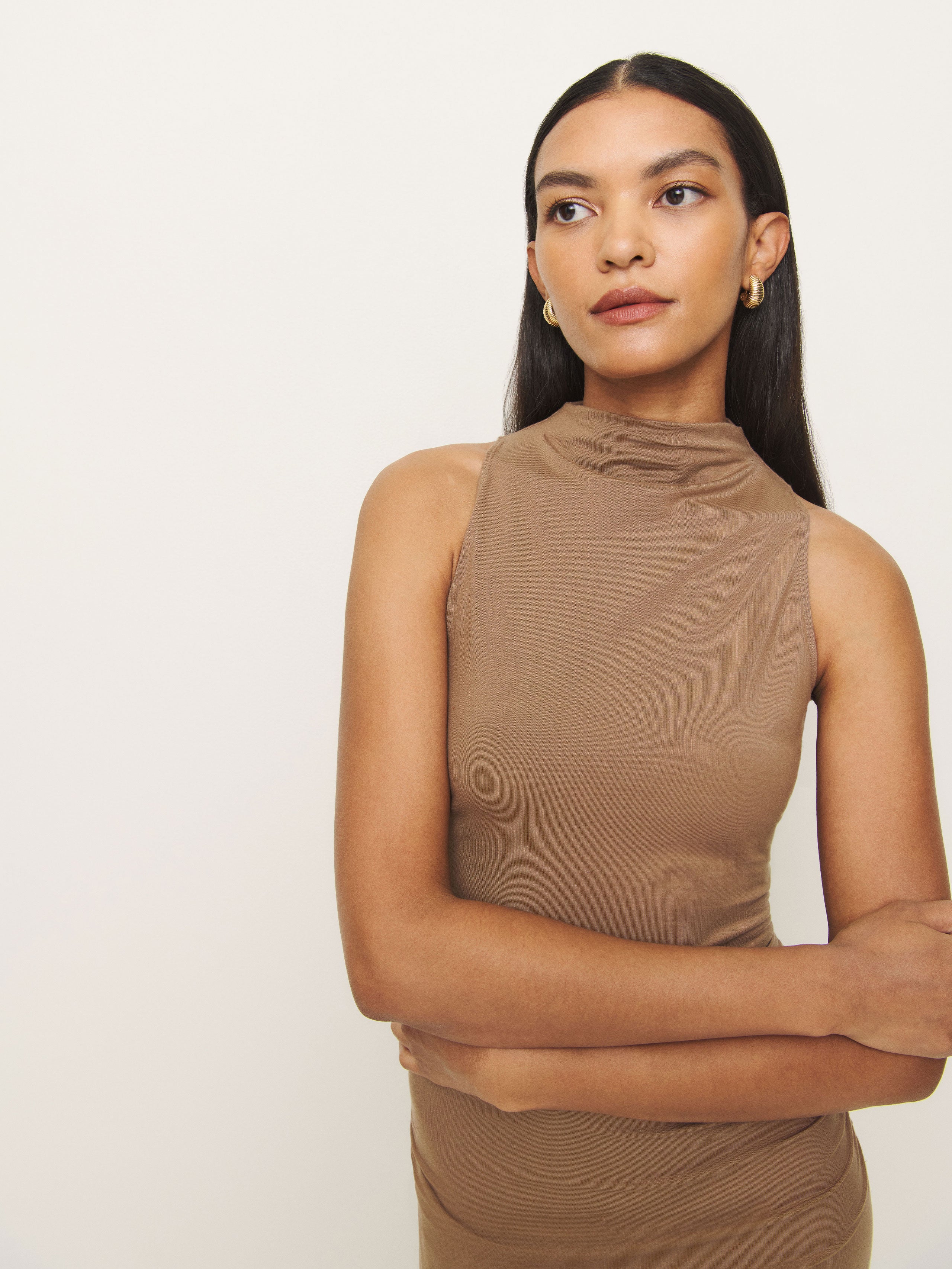Easy little mini. Shop the Jana Knit Dress from Reformation, a sleeveless mini dress with a mock neckline and ruching throughout.