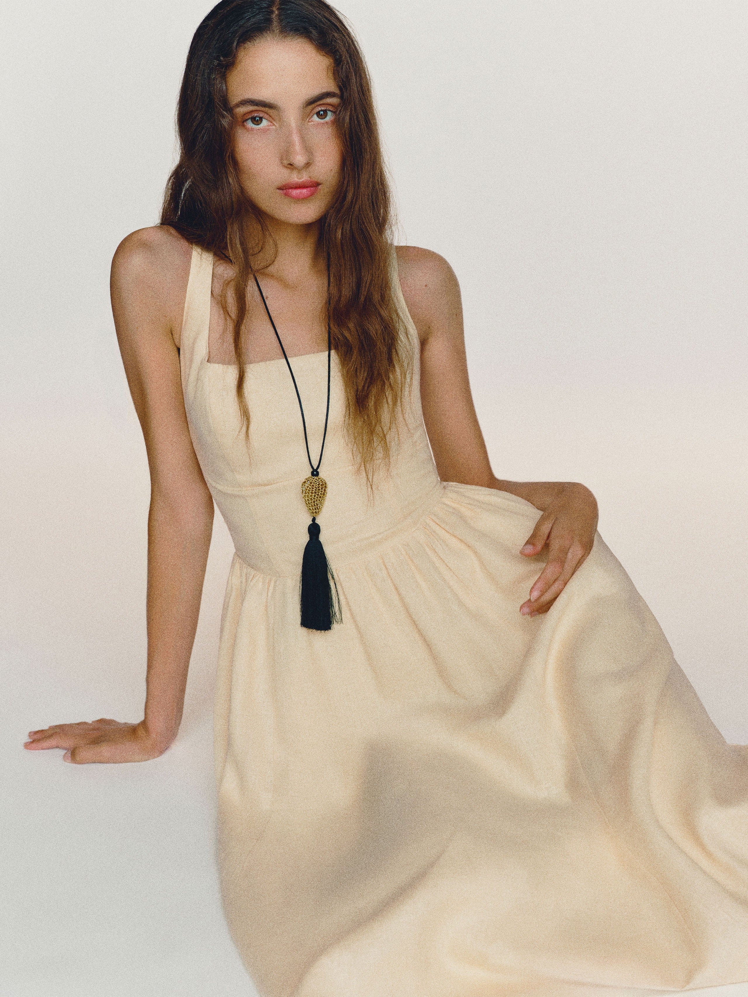Shop the Janu Linen Dress from Reformation, a sleeveless midi dress with a square neckline, drop waist,...