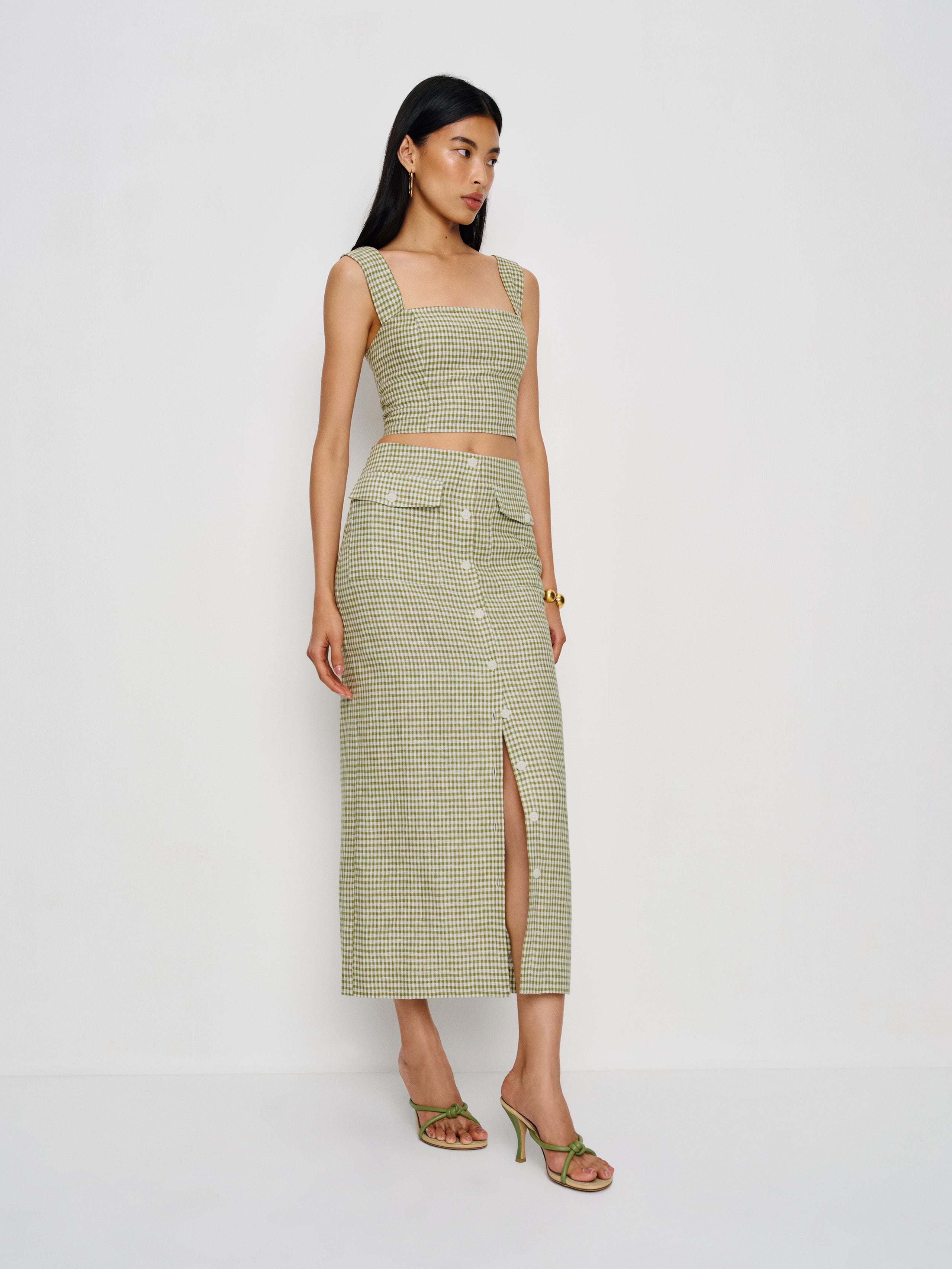Up top. Shop the Jasmine Linen Top from Reformation, a sleeveless cropped top with a square neck...