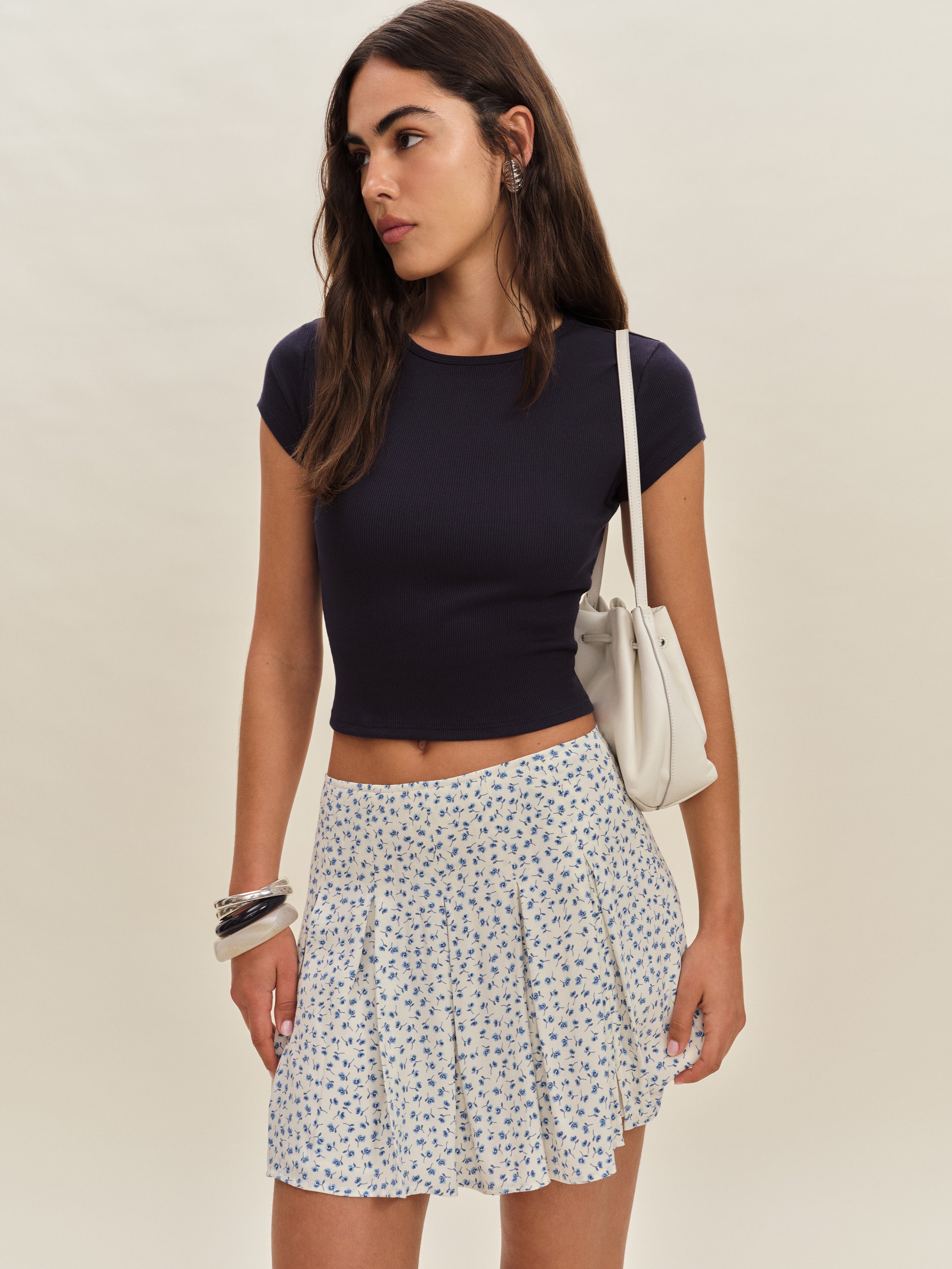 Get a hobby. Shop the Jeanne Skirt from Reformation, a mini skirt with pleating, a side slit, and an A-line hem.