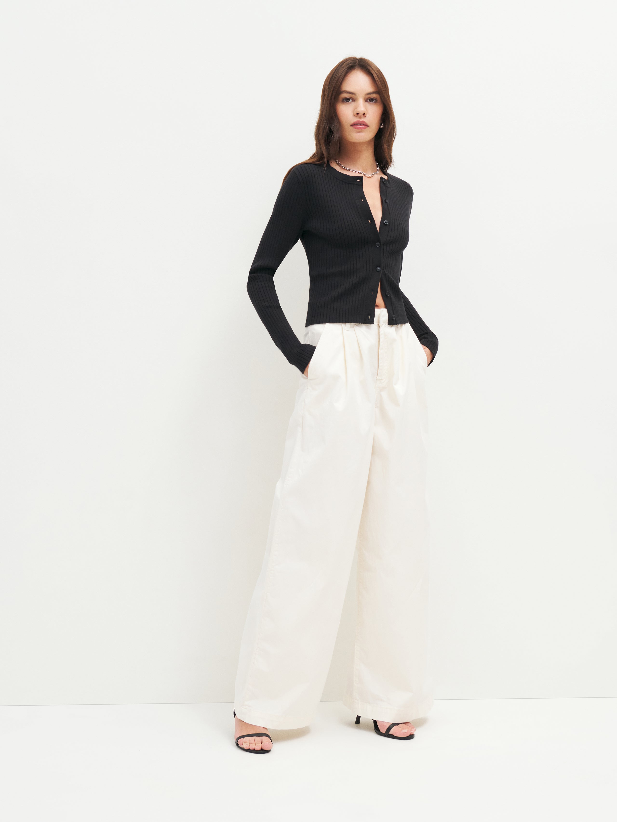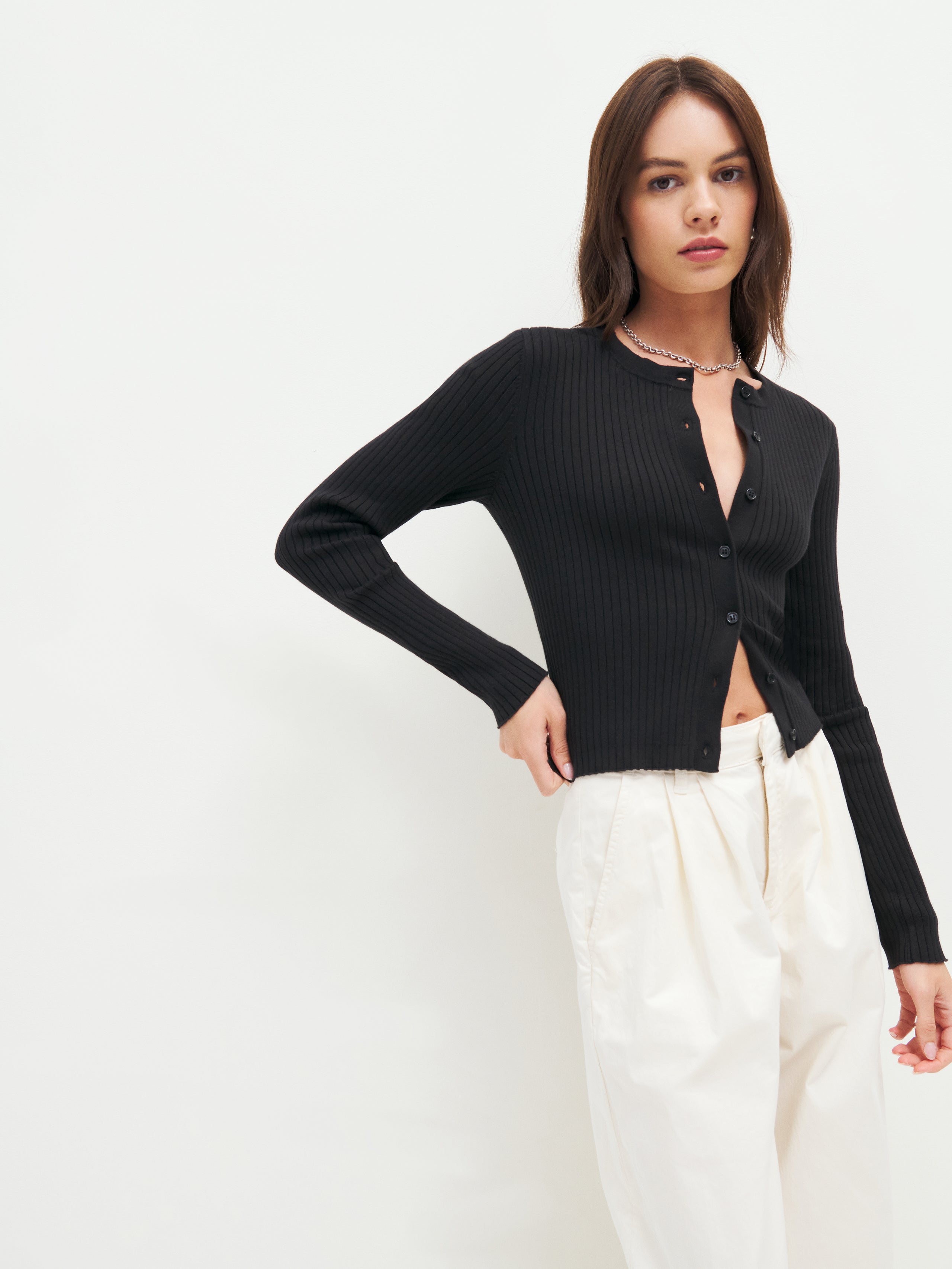 Be nice to your bottoms and get them some good tops. Shop the Joanne Cotton Cardigan from Reformation, a long sleeve, ribbed, crewneck cardigan.