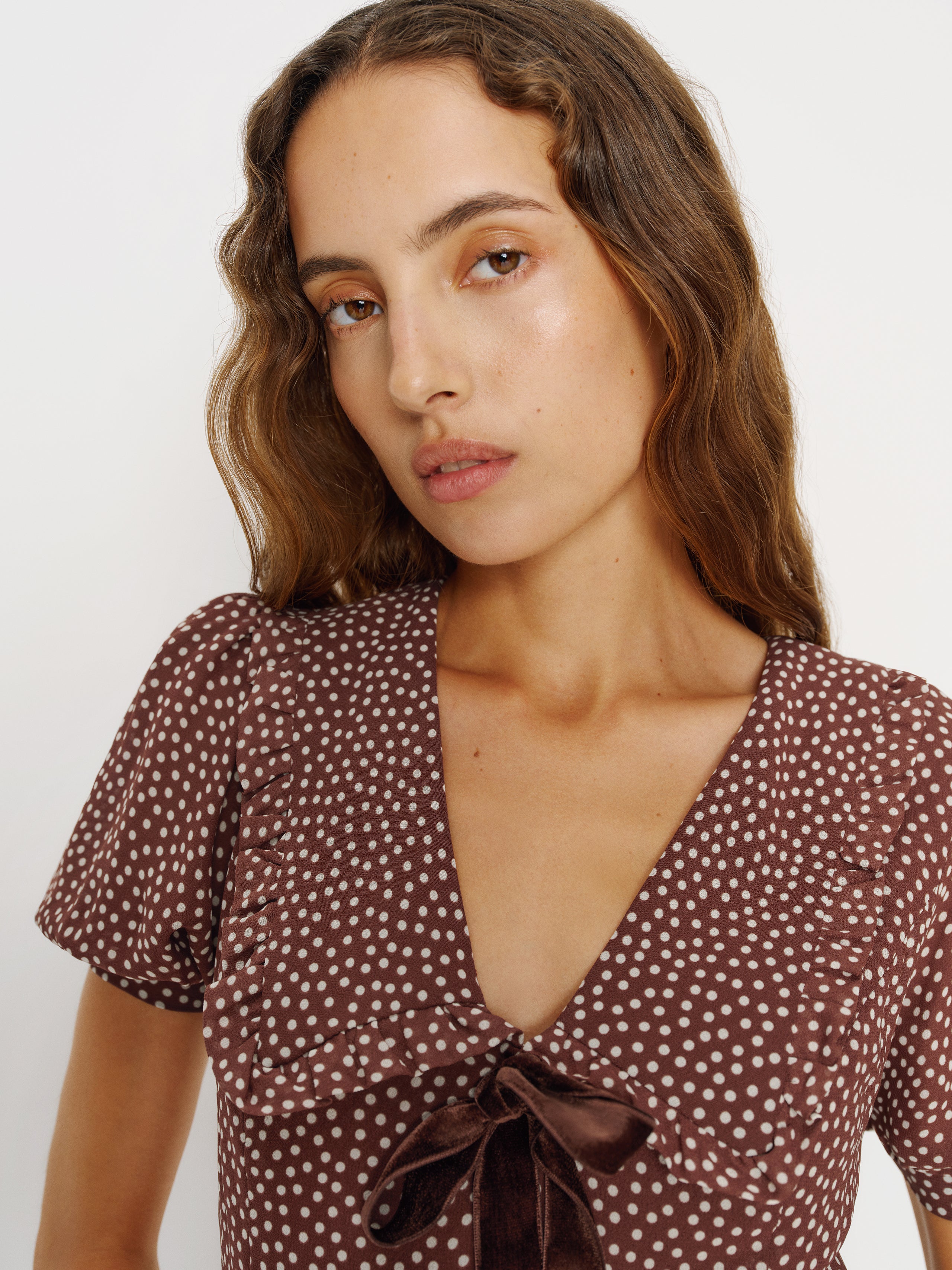Get some compliments. Shop the Kaylia Dress from Reformation, a mini dress with a v-neckline, puff sleeves, oversized collar, and ties at the front.