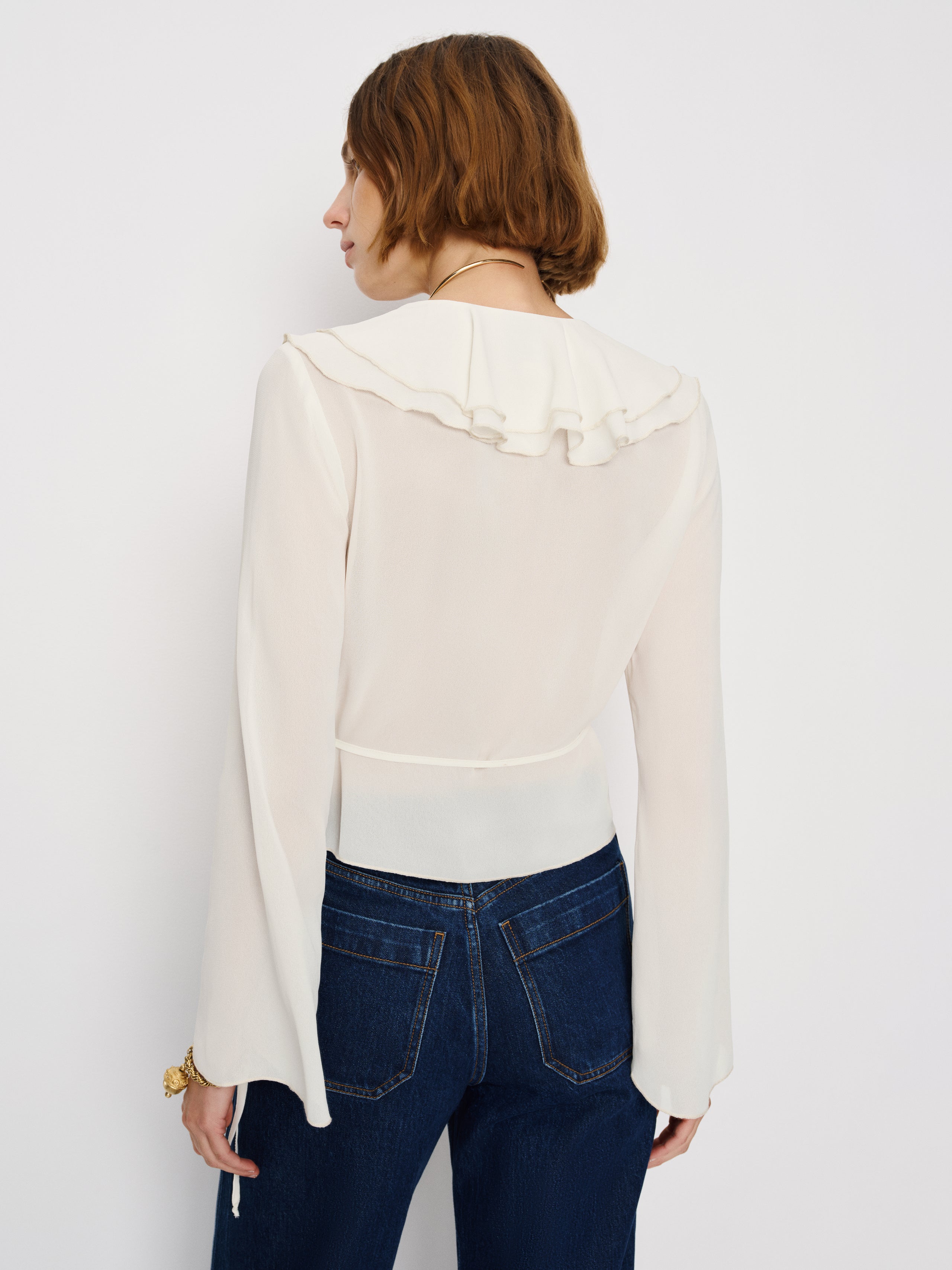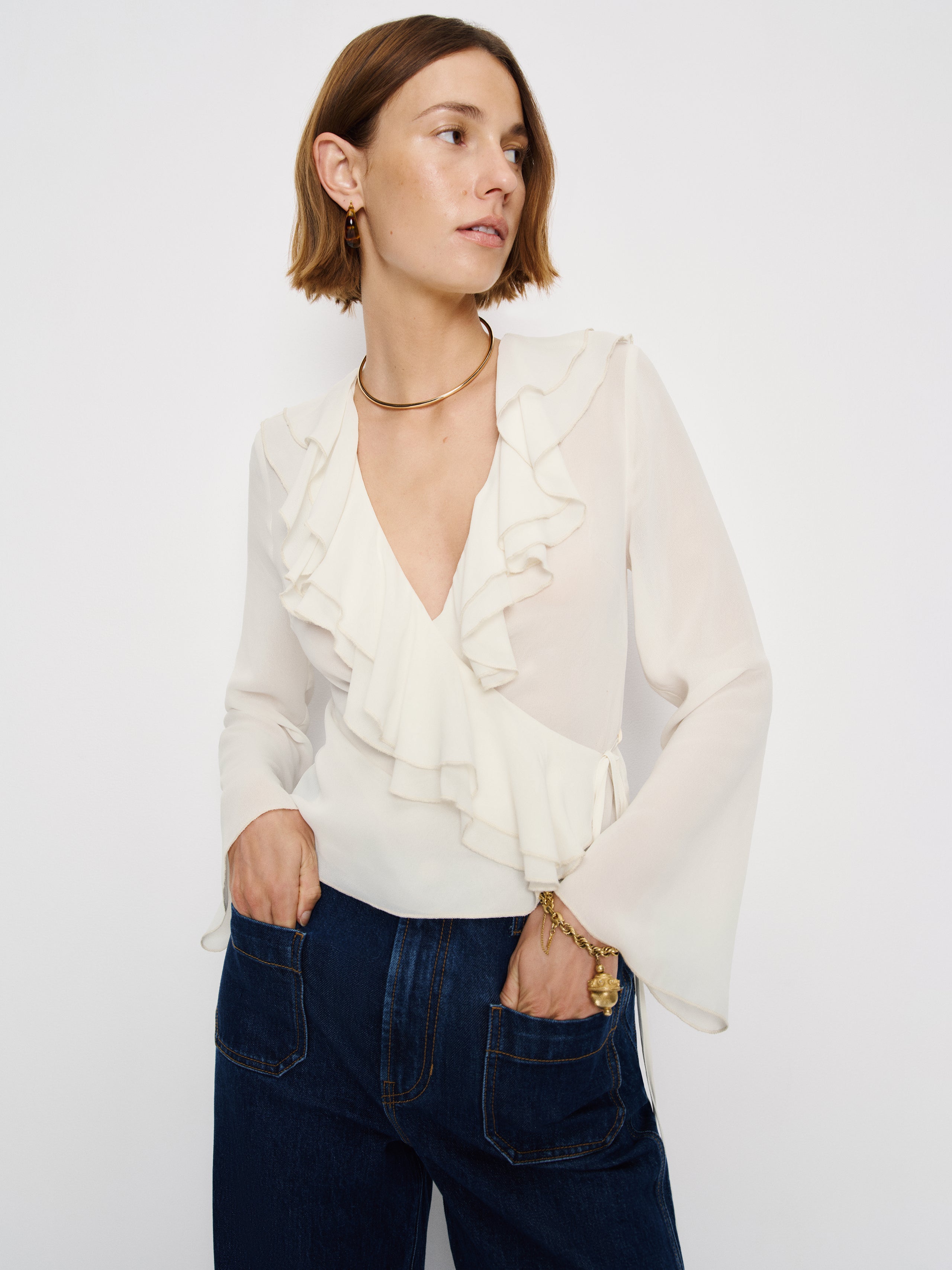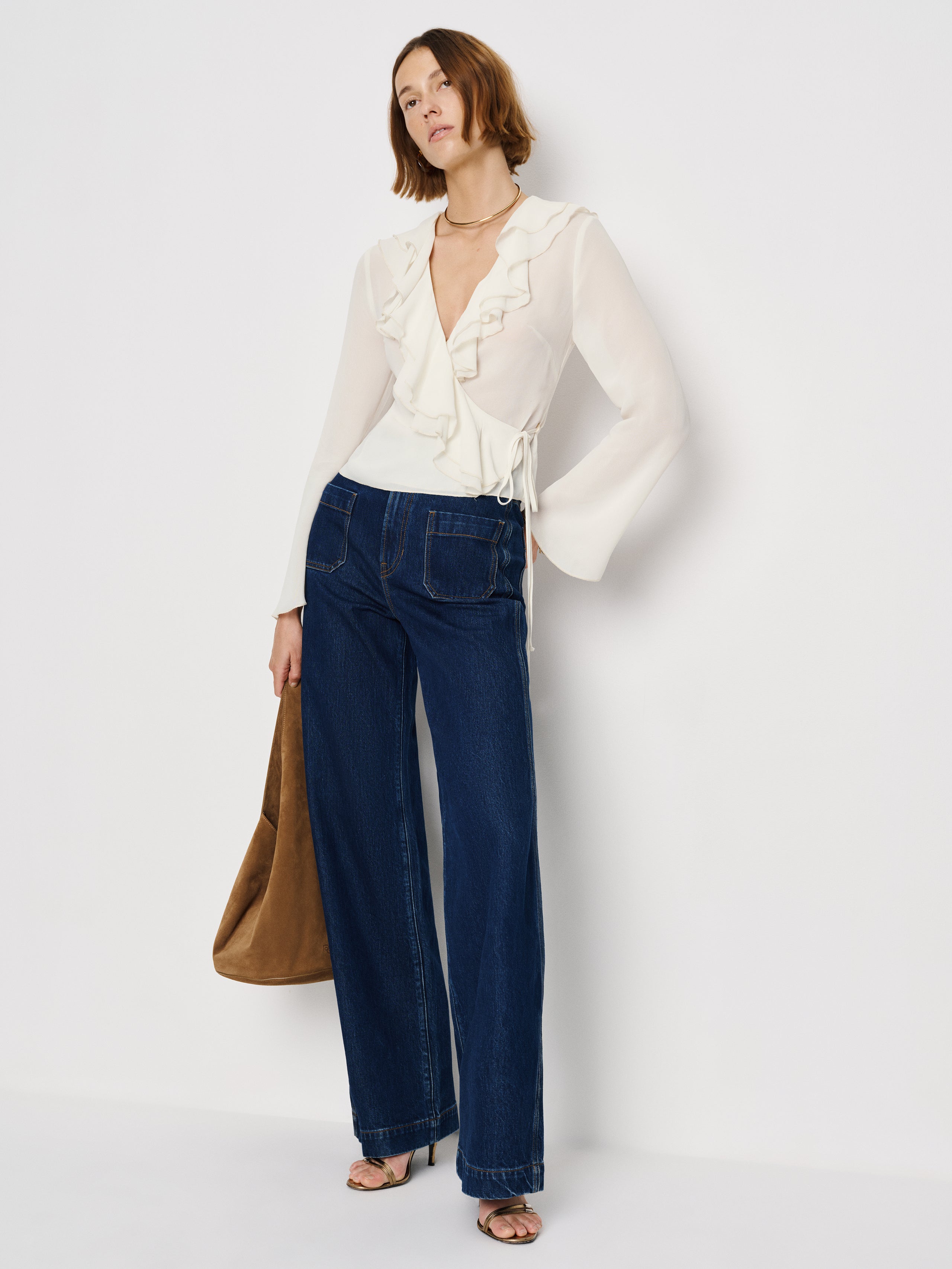 Up top. Shop the Kilah Top from Reformation, a long-sleeved top with a v-neckline, an adjustable tie...