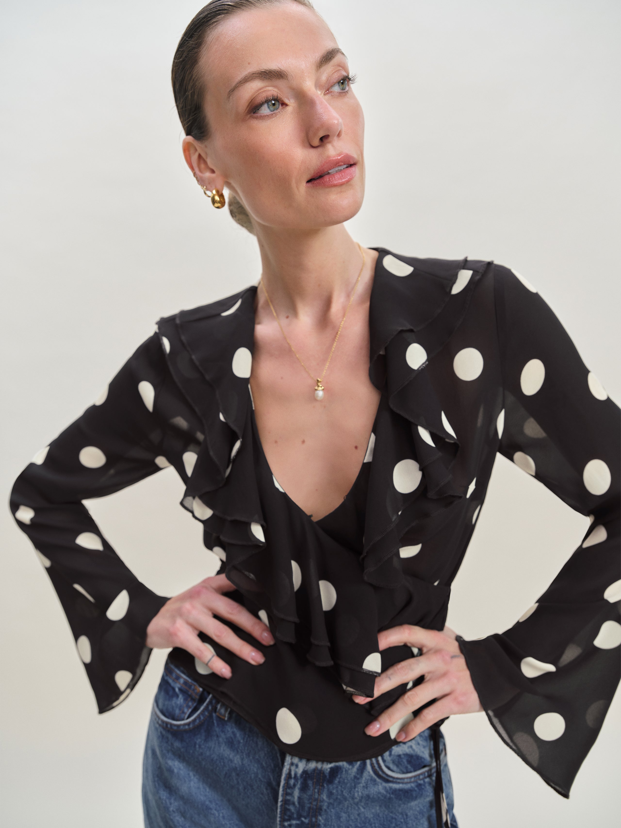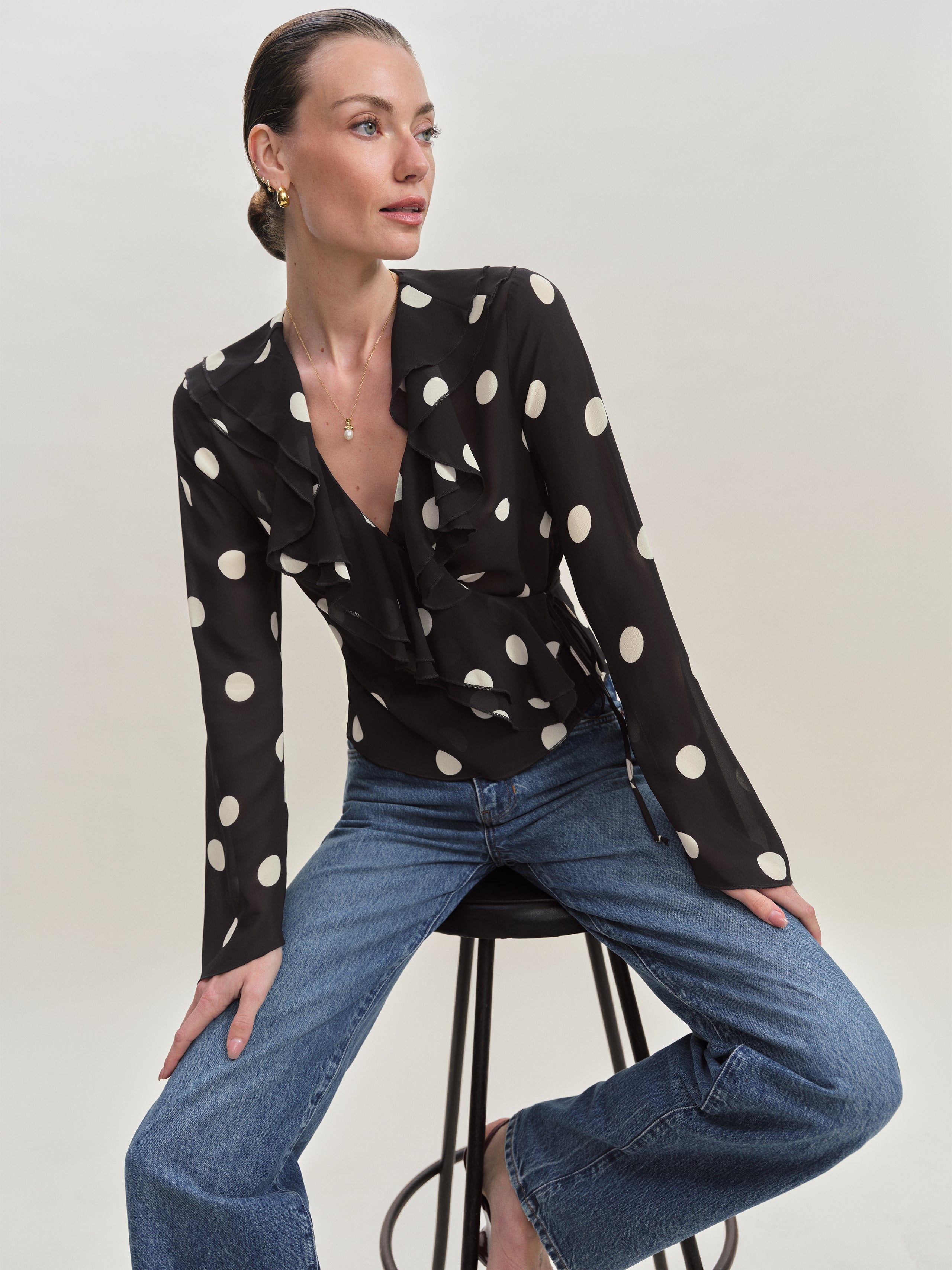 Up top. Shop the Kilah Top from Reformation, a long-sleeved top with a v-neckline, an adjustable tie at the back, and ruffle detailing throughout.