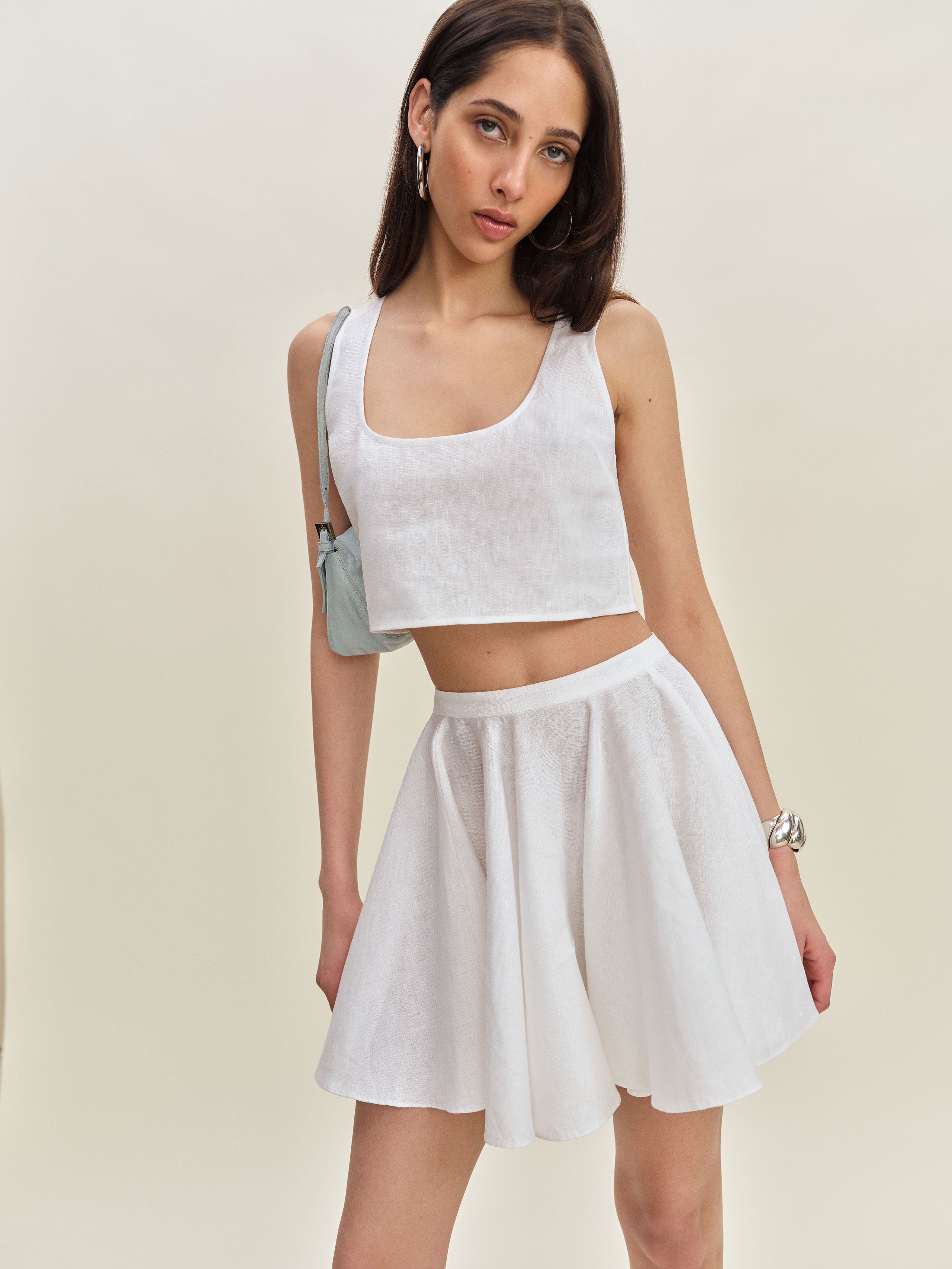 Up top. Shop the Kylie Linen Top from Reformation, a sleeveless cropped top with a scoop square neckline.