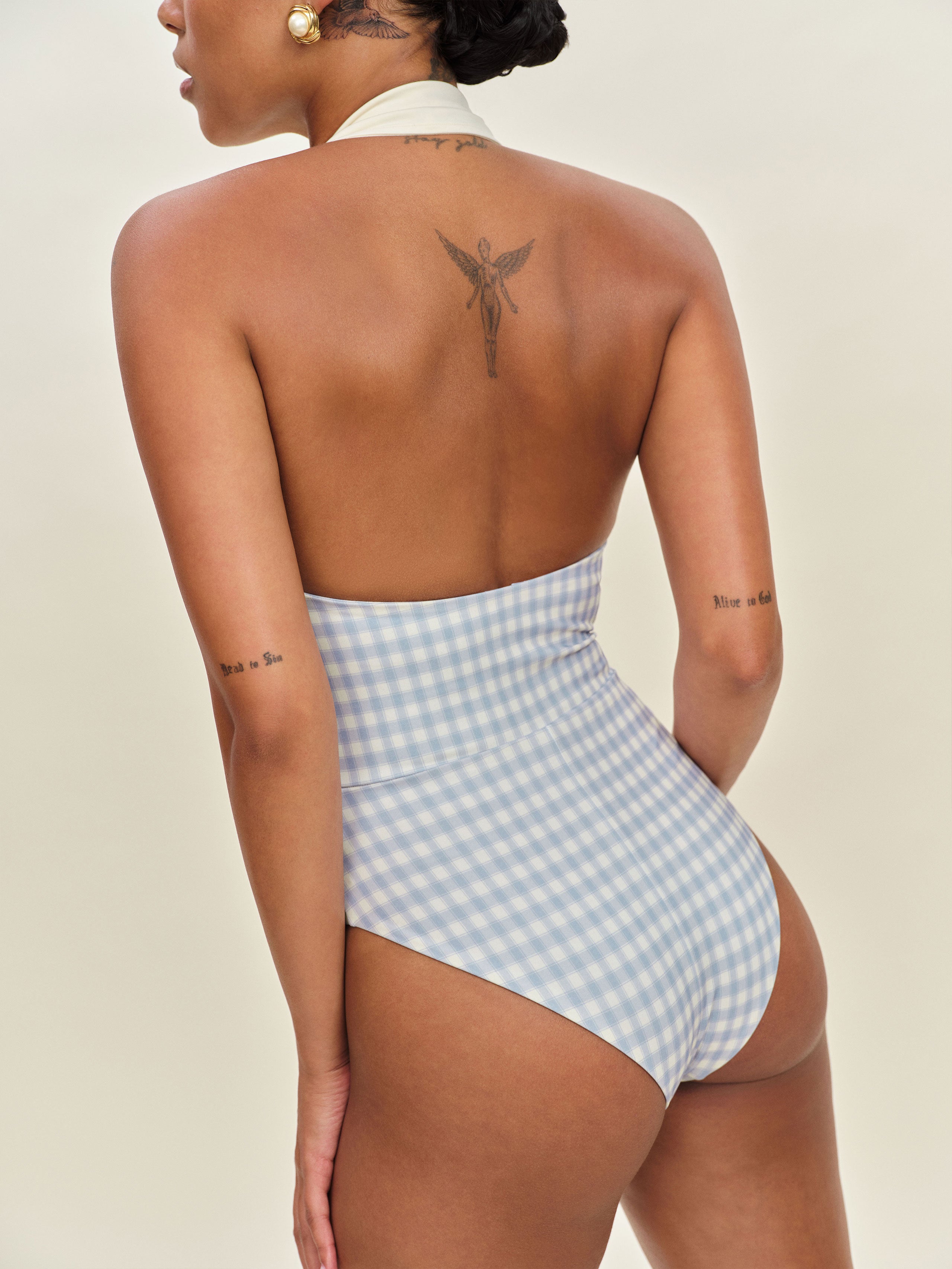 Shop the Lagos One Piece Swimsuit from Reformation, a sleeveless one piece swimsuit with a collared neckline and button front.