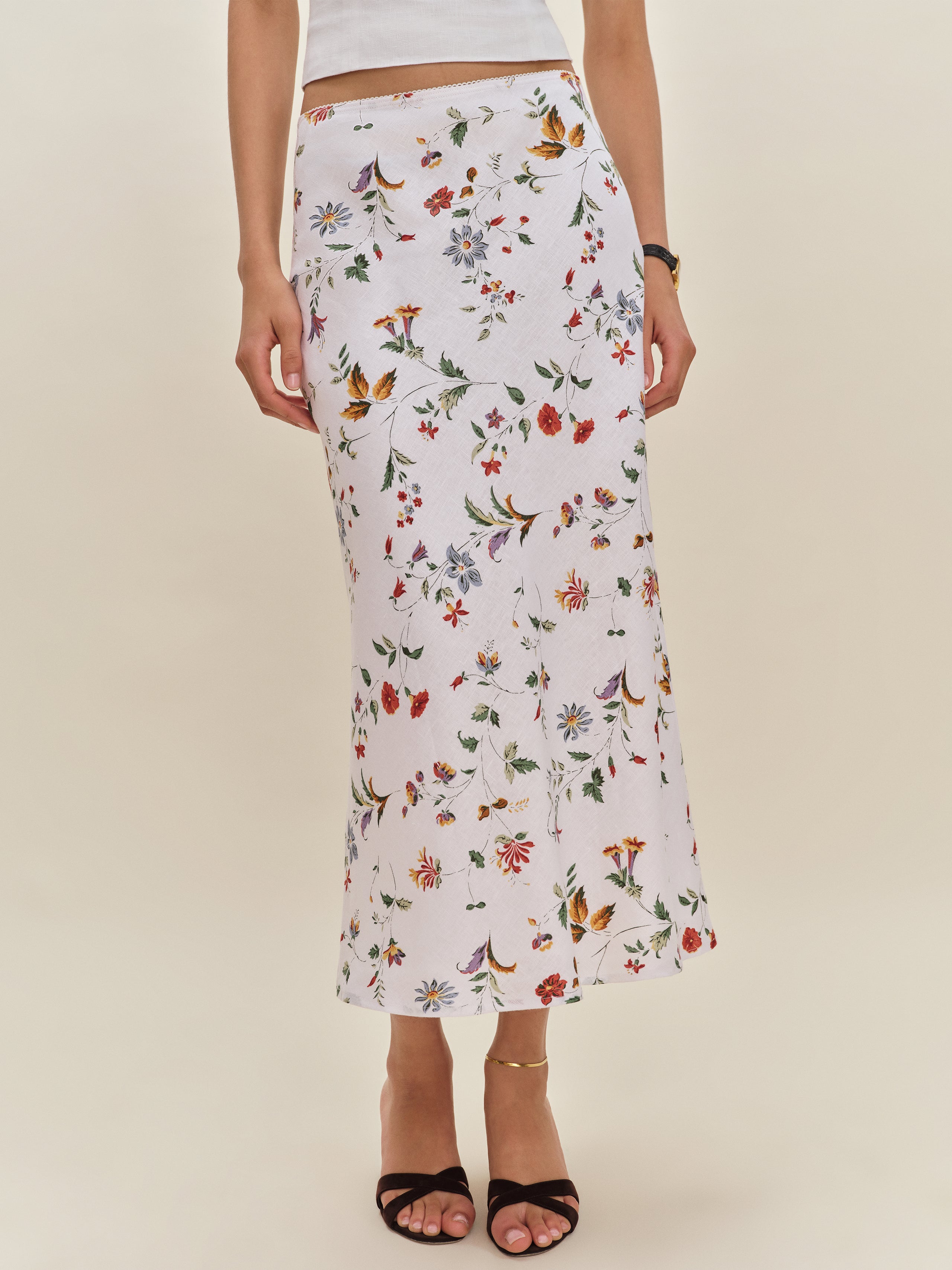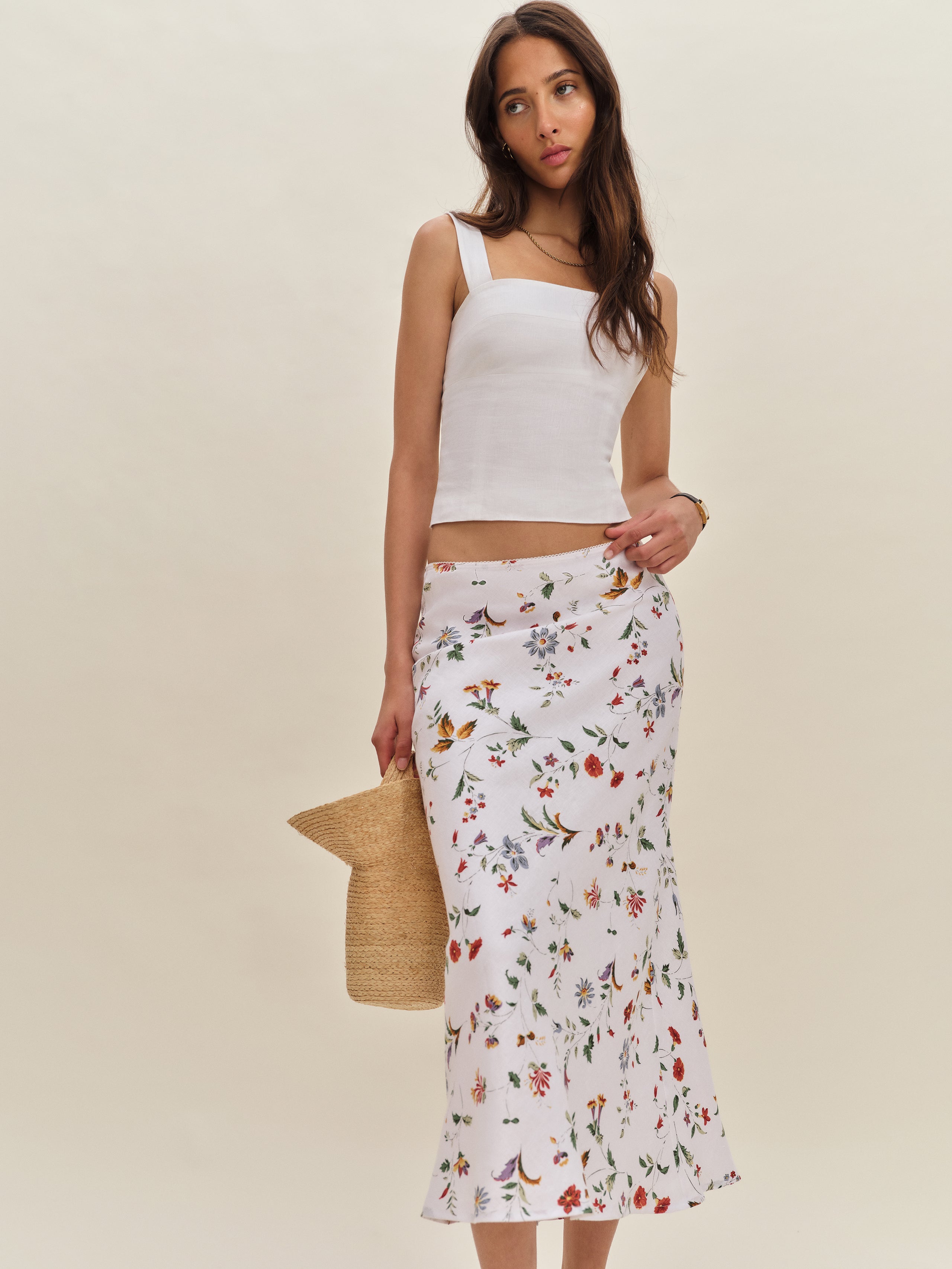 Let your skirt do the talking. Shop the Layla Linen Skirt from Reformation, a bias cut, midi...