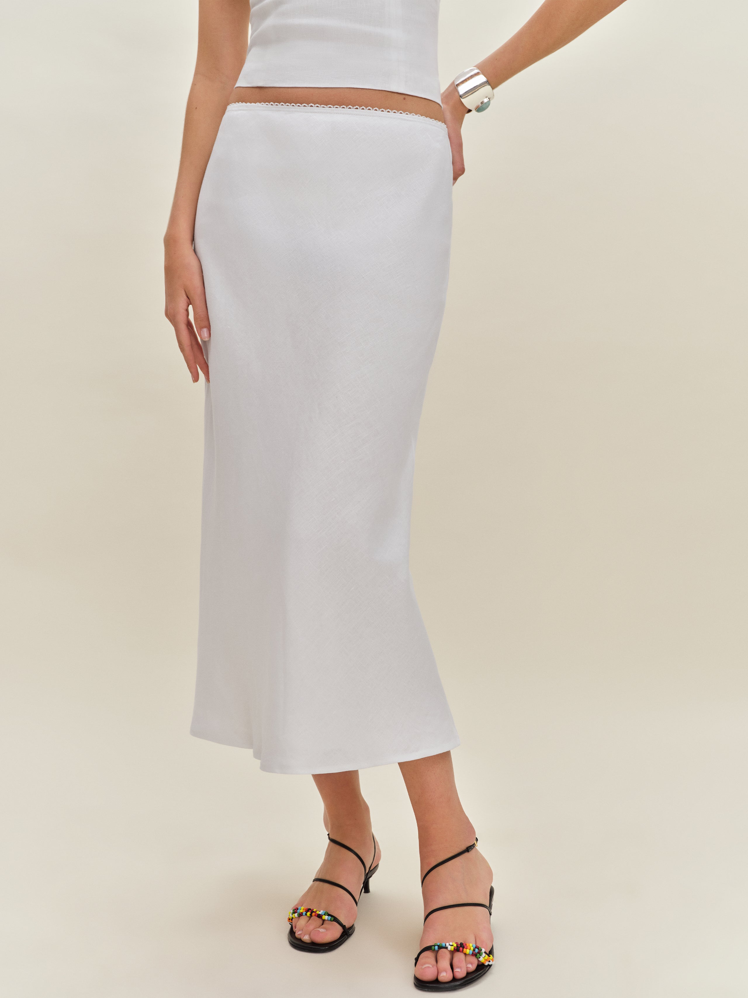 Let your skirt do the talking. Shop the Layla Linen Skirt from Reformation, a bias cut, midi...