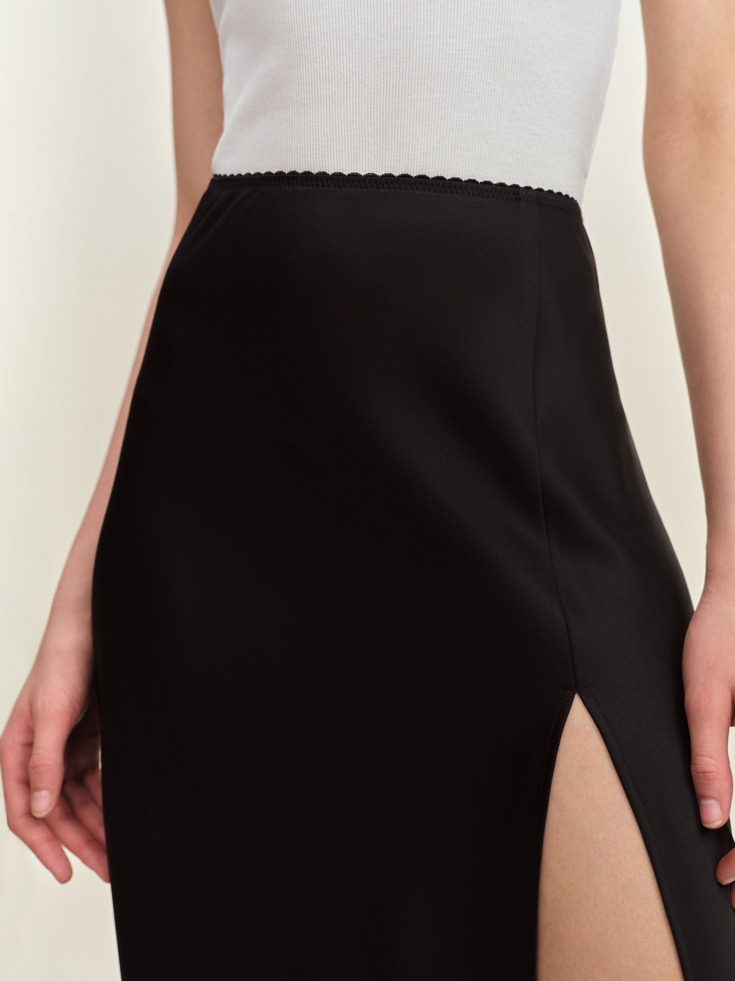 Wear the skirt. Shop the Layla Satin Skirt With Slit, a sustainable skirt from Reformation.