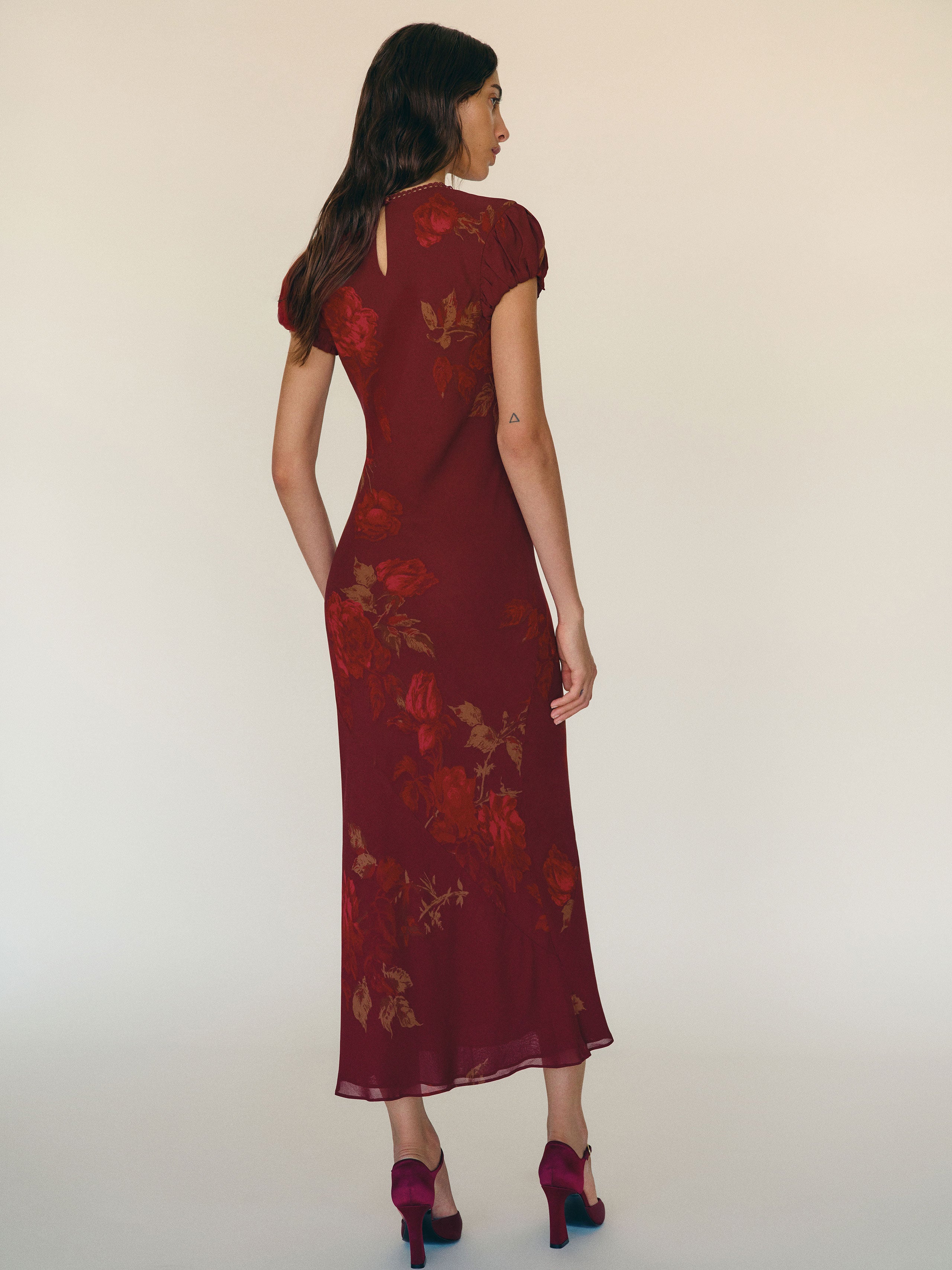 How romantic. Shop the Leana Dress from Reformation, a midi dress with a high neckline, ruched cap sleeves, and lace detailing at the neck.