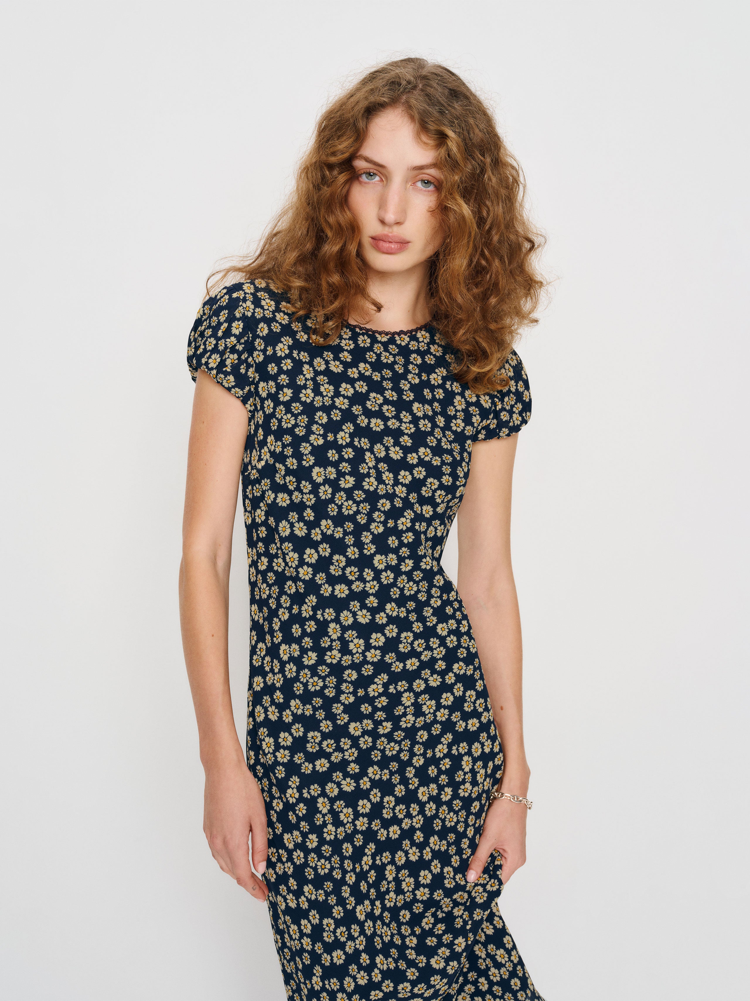 How romantic. Shop the Leana Dress from Reformation, a midi dress with a high neckline, ruched cap sleeves, and lace detailing at the neck.