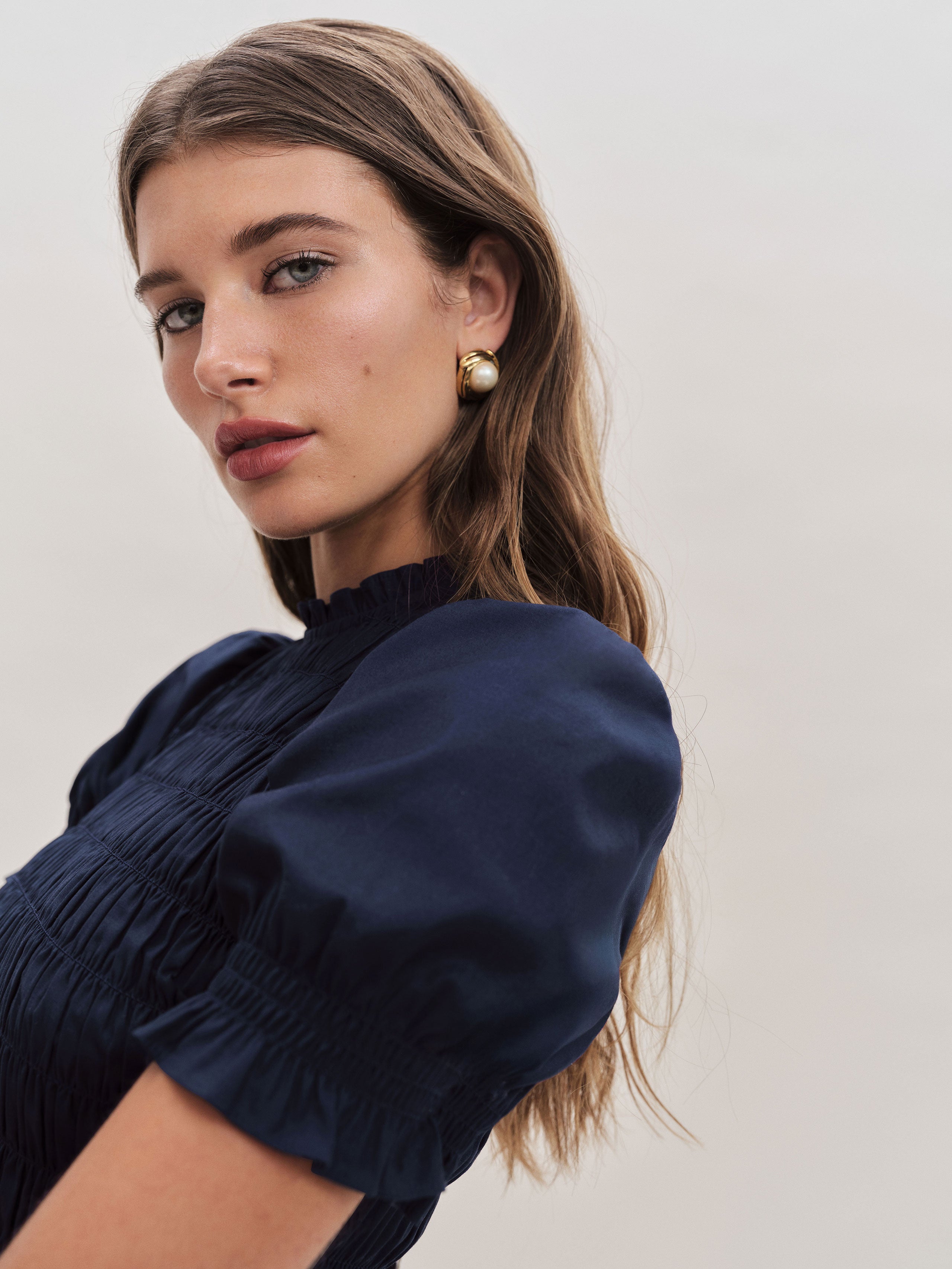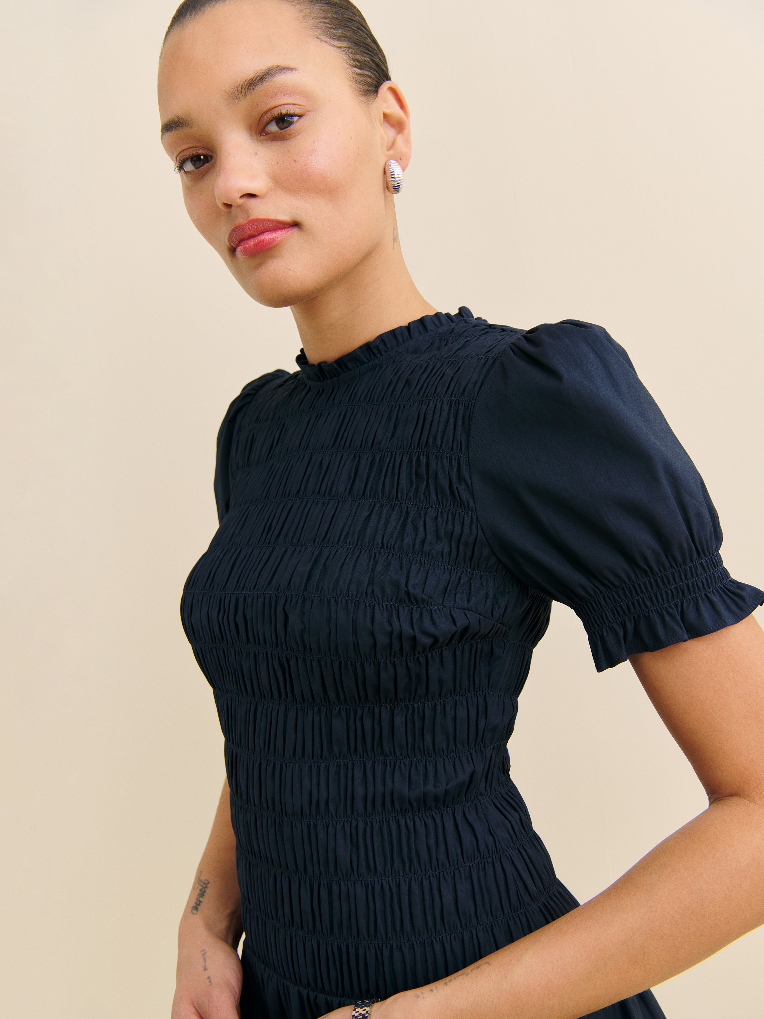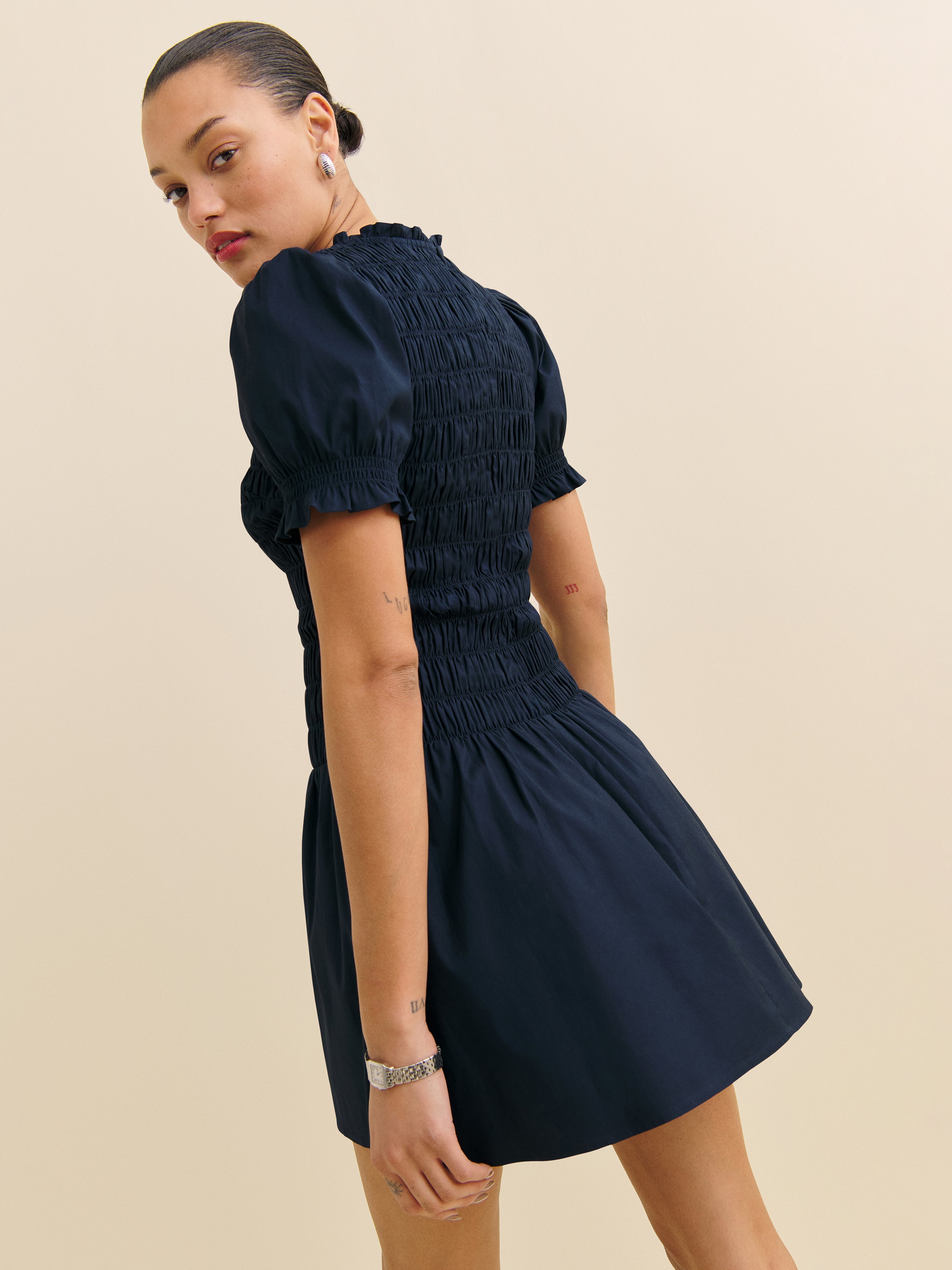 Wear the dress. Shop the Leannah Dress from Reformation, a short-sleeved mini dress with a drop waist, smocked bodice, and puffed sleeves.