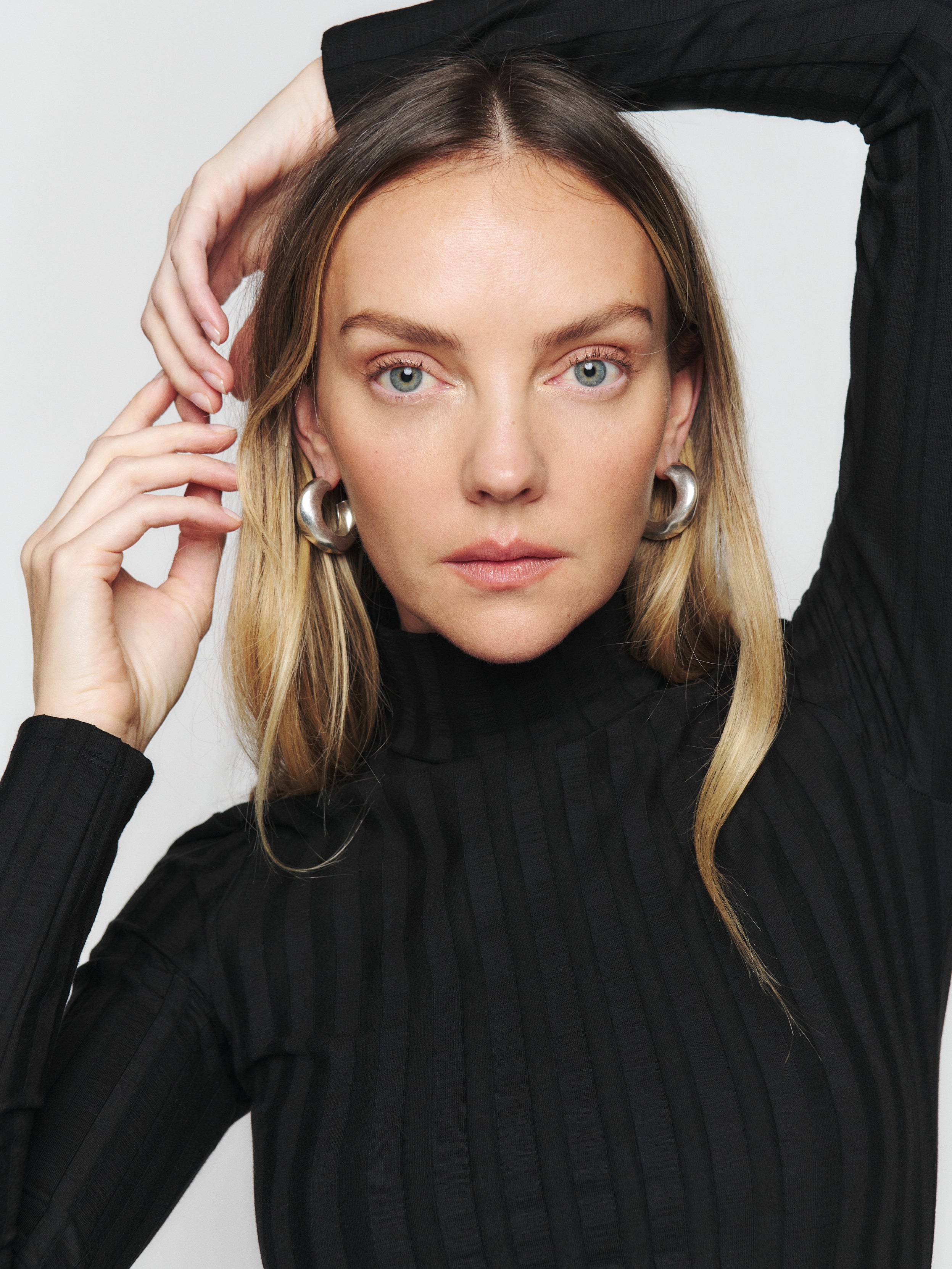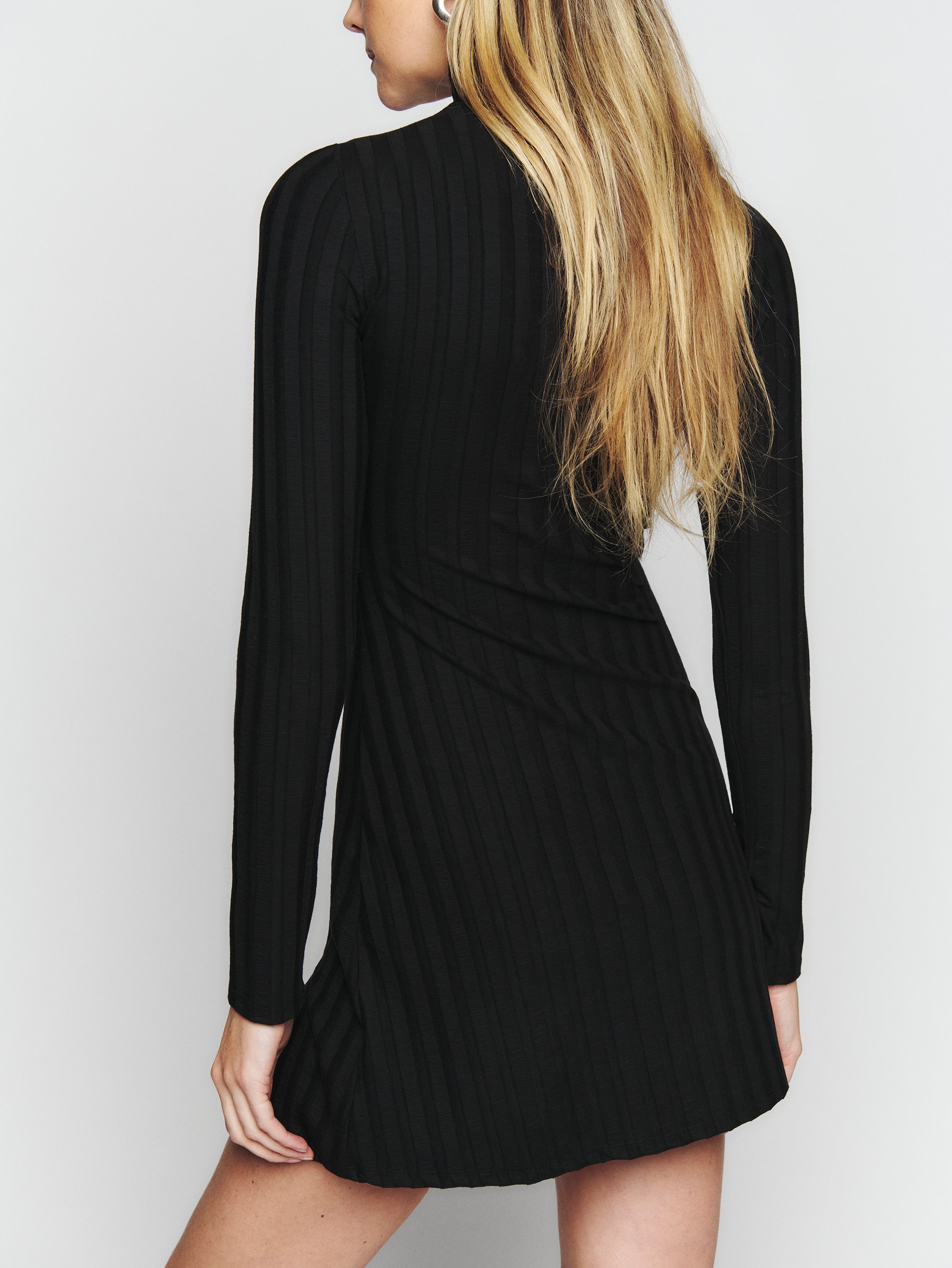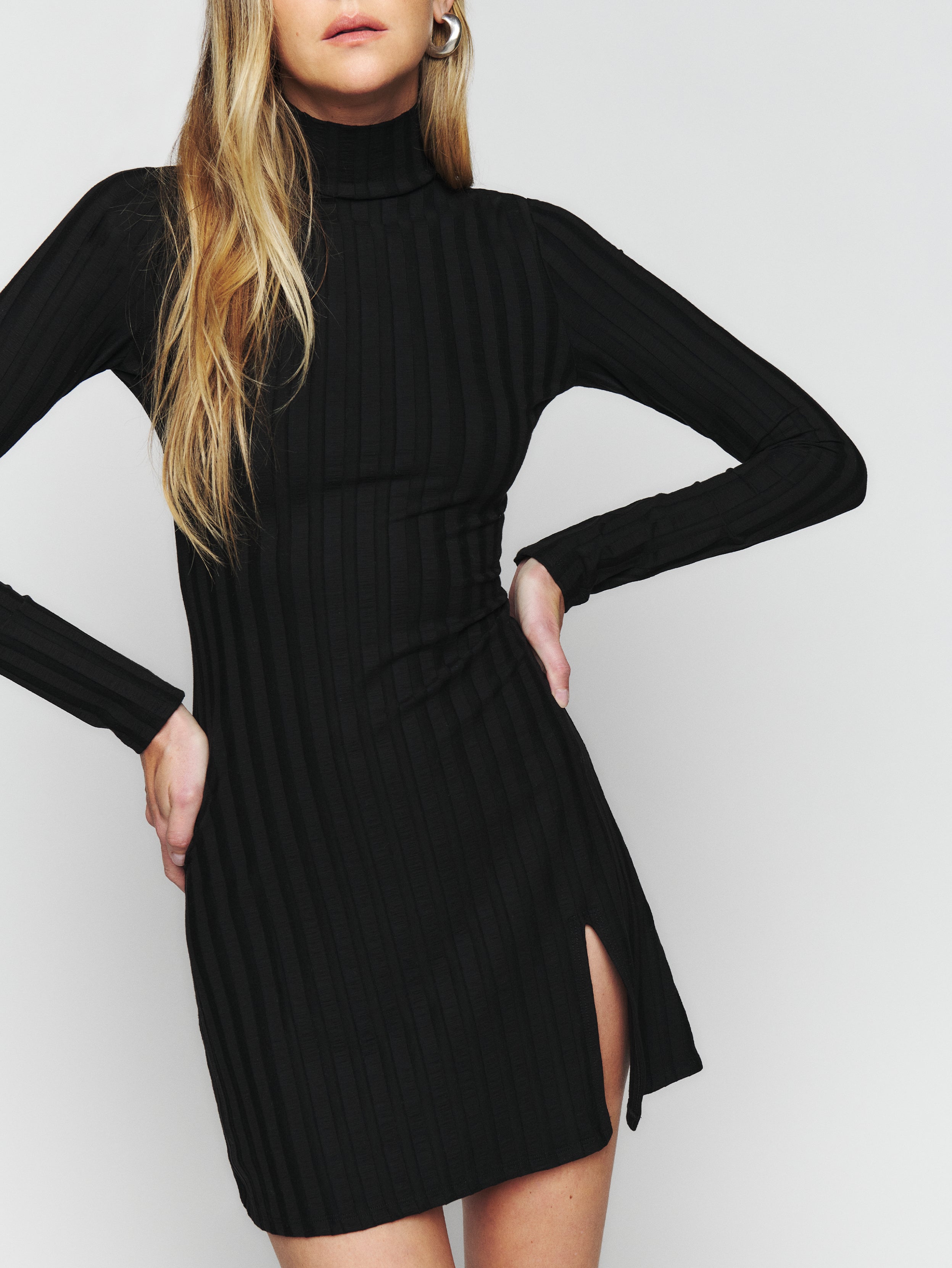For all your morning, afternoon, and evening situations. The Libra is form fitting throughout with a mock neck and a small side slit.