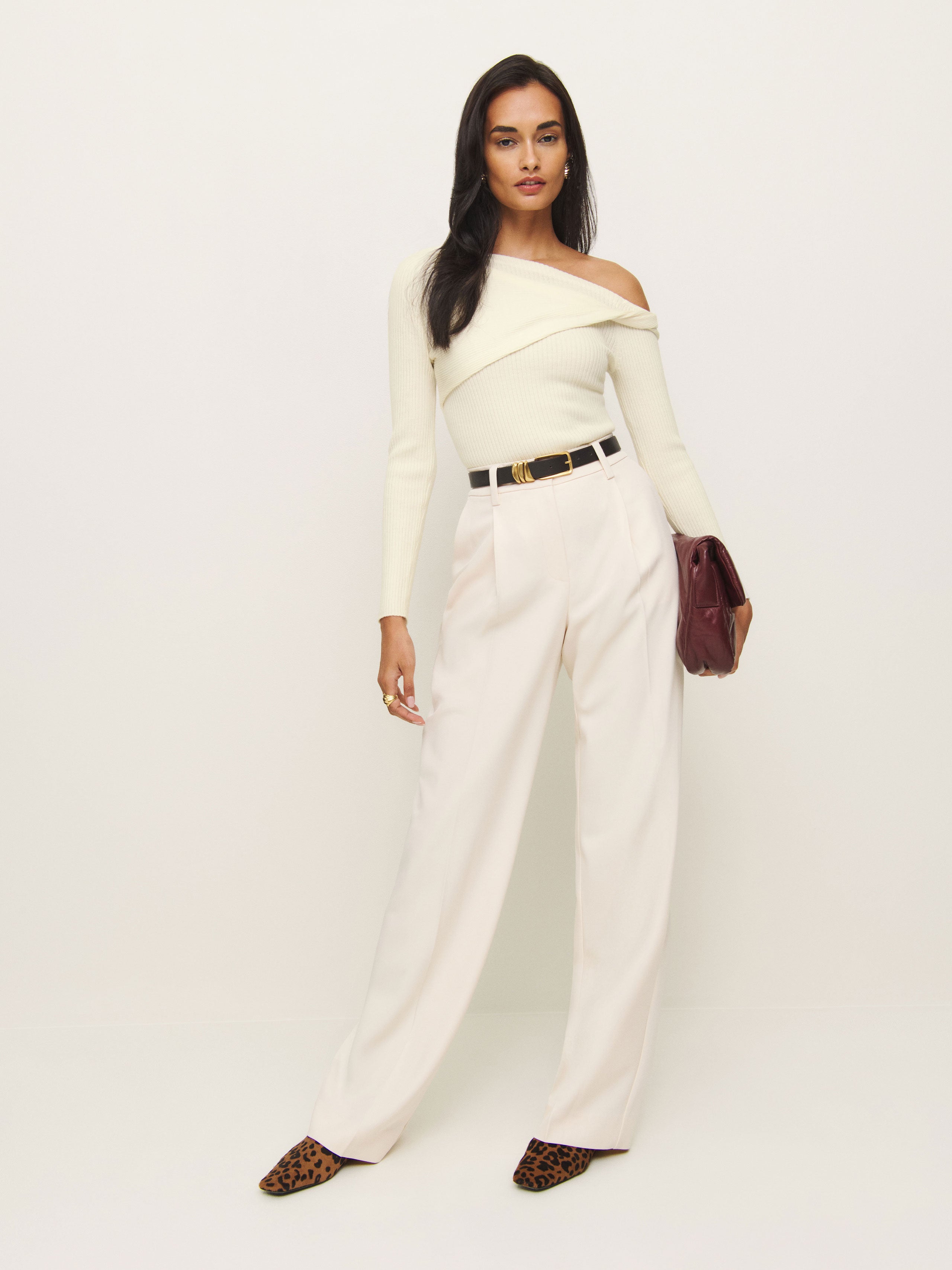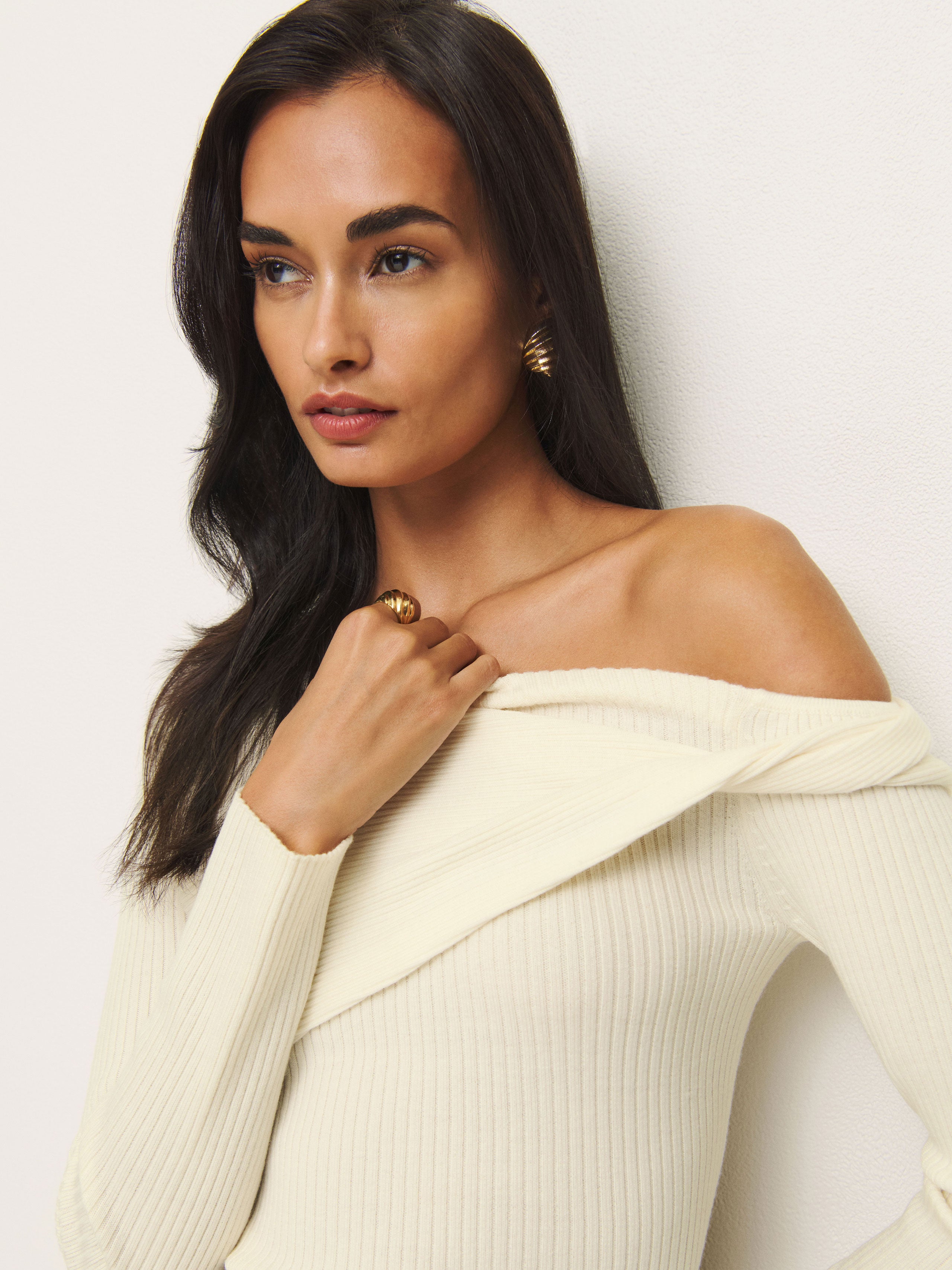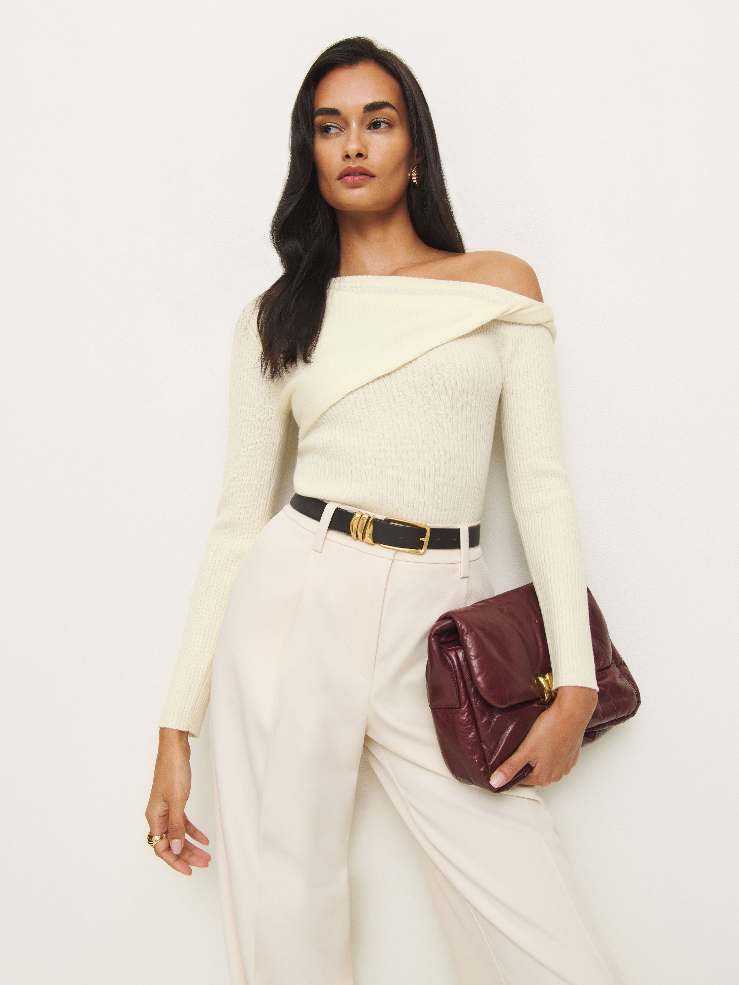Cozy time. Shop the Lilou Regenerative Merino Sweater from Reformation, a long-sleeved sweater with an asymmetrical off-the-shoulder...