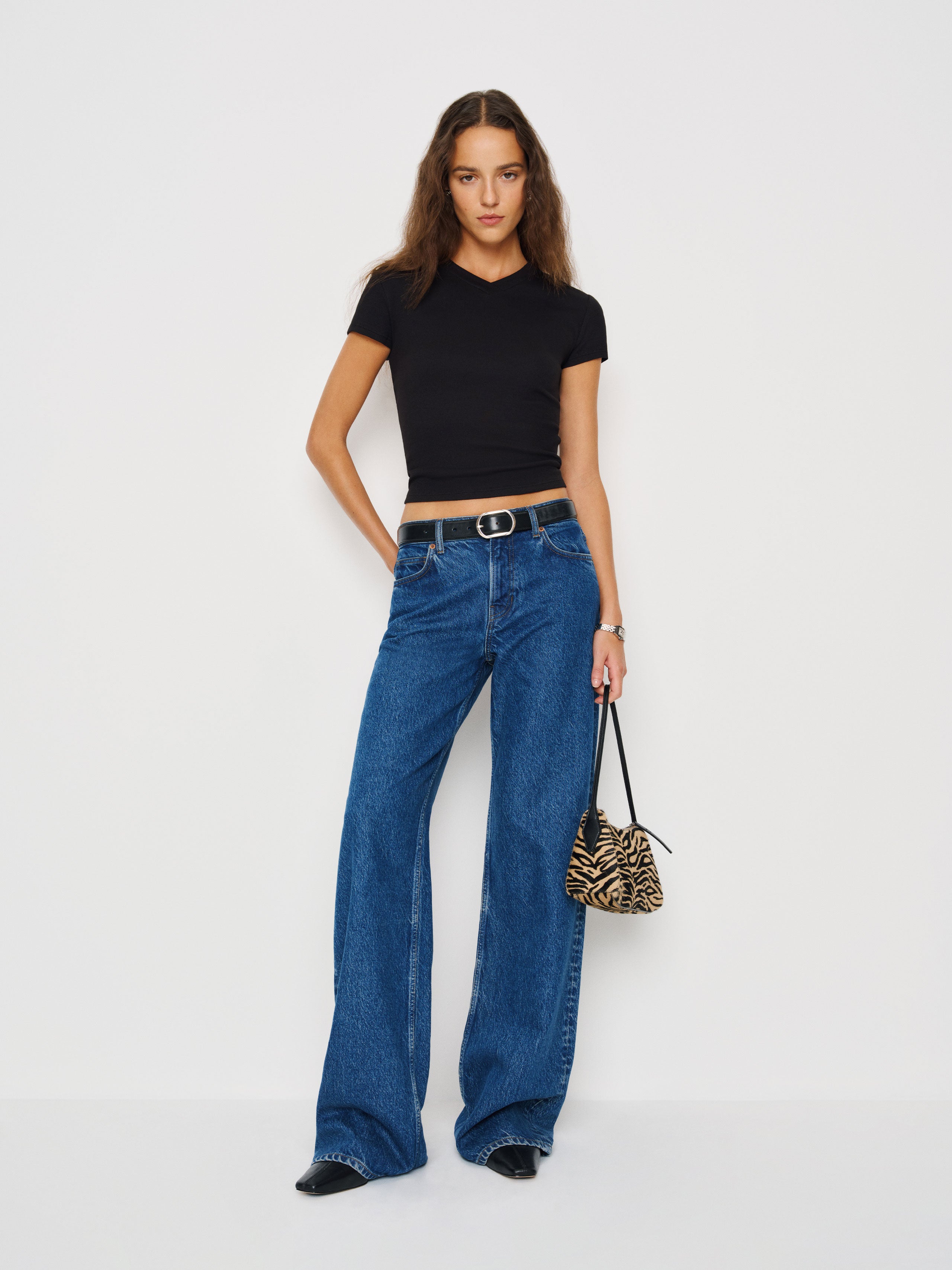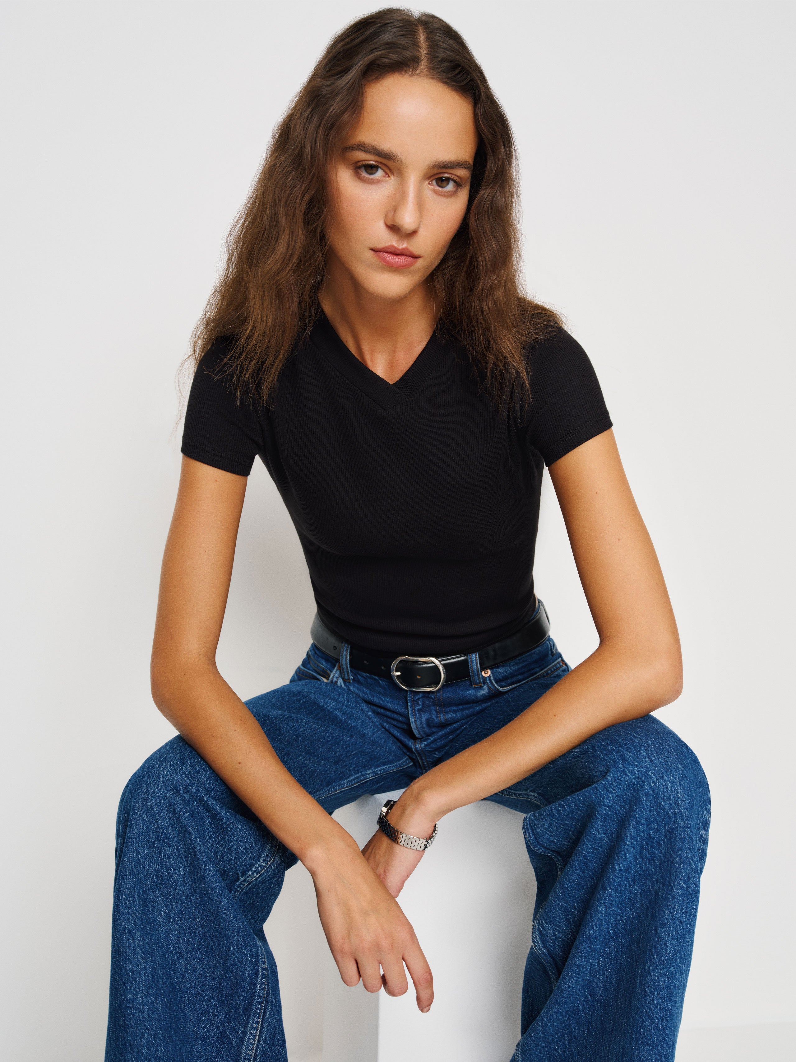Shop the Lindie Tee from Reformation, a short sleeve knit tee with a high v neckline and...