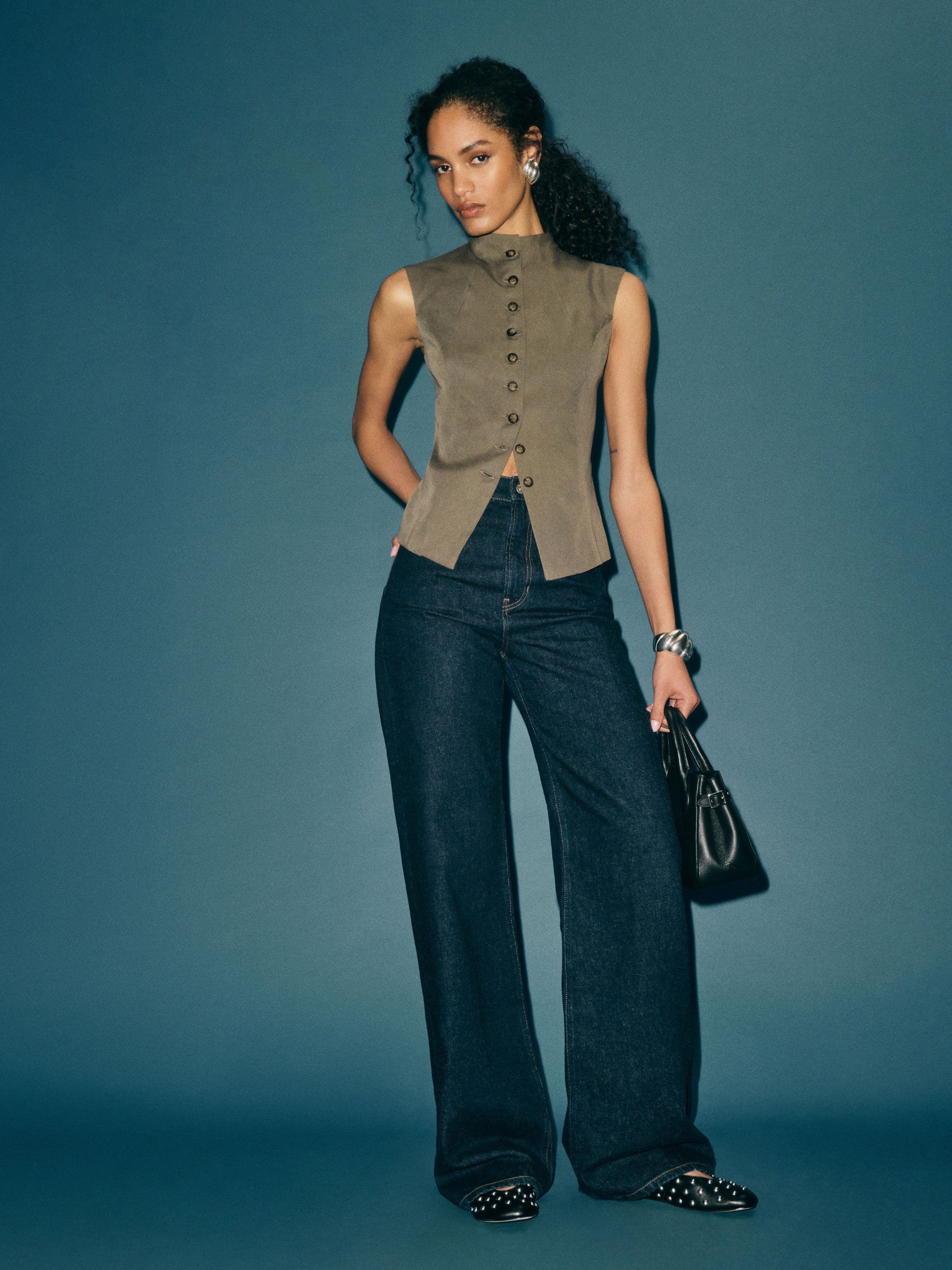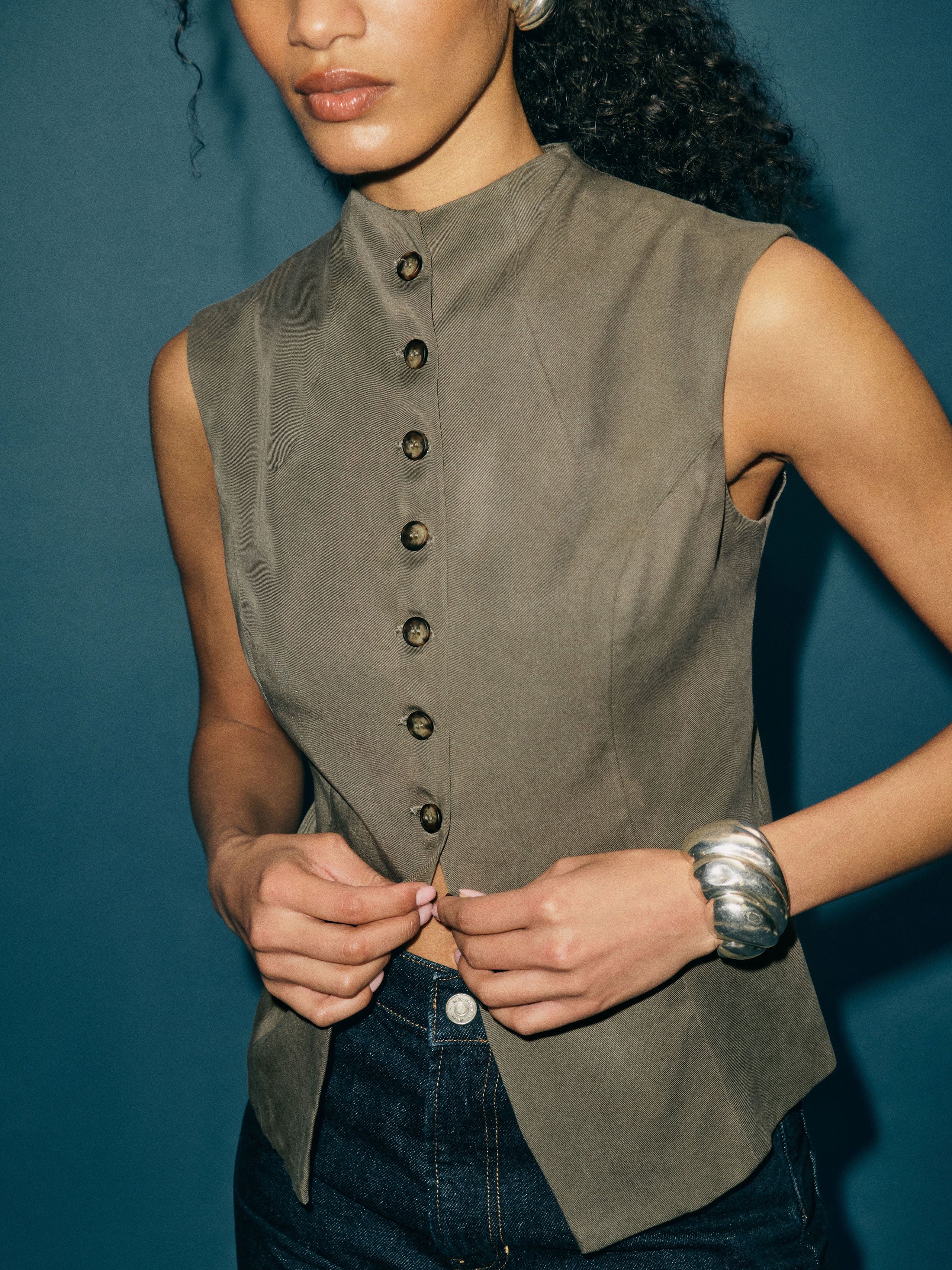 Up top. Shop the Lottie Vest from Reformation, a sleeveless vest with a mock neckline, button front, and split hem.