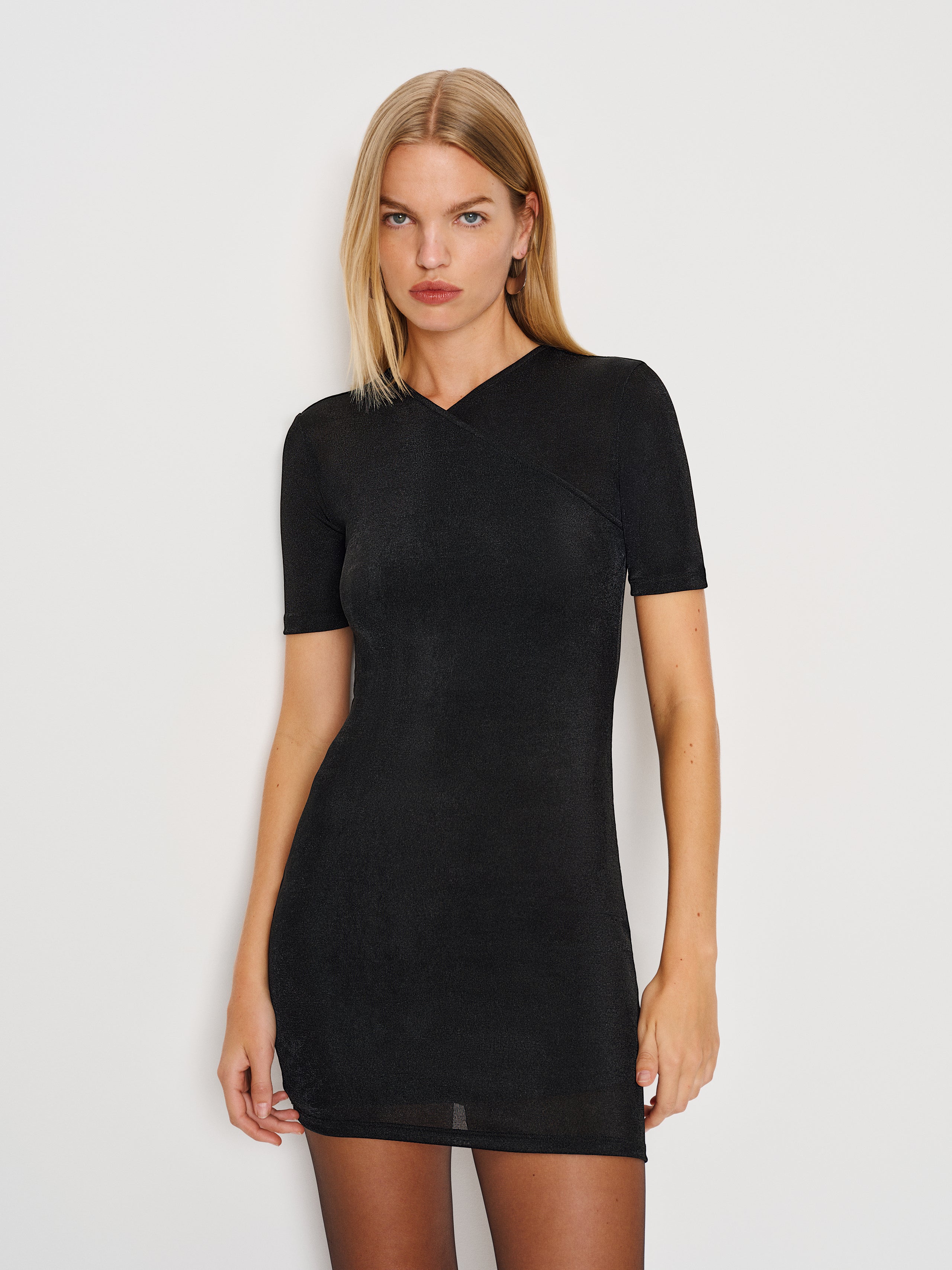 No nonsense. Shop the Lotus Knit Dress from Reformation, a short-sleeved mini dress with a high V-neckline. A not-so-basic basic.