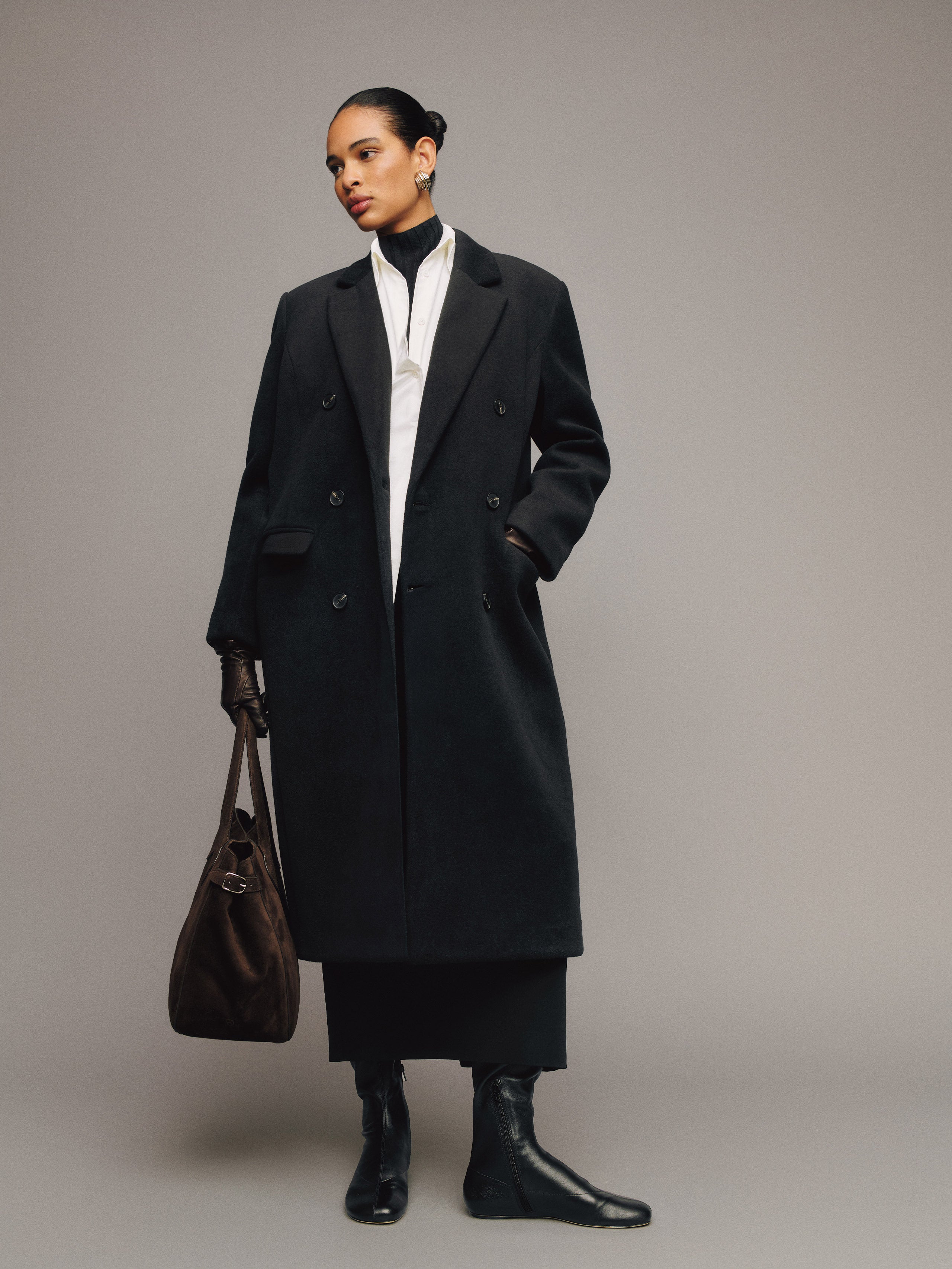 Layer up. Shop the Lucas Coat from Reformation, a full-length, double-breasted coat.