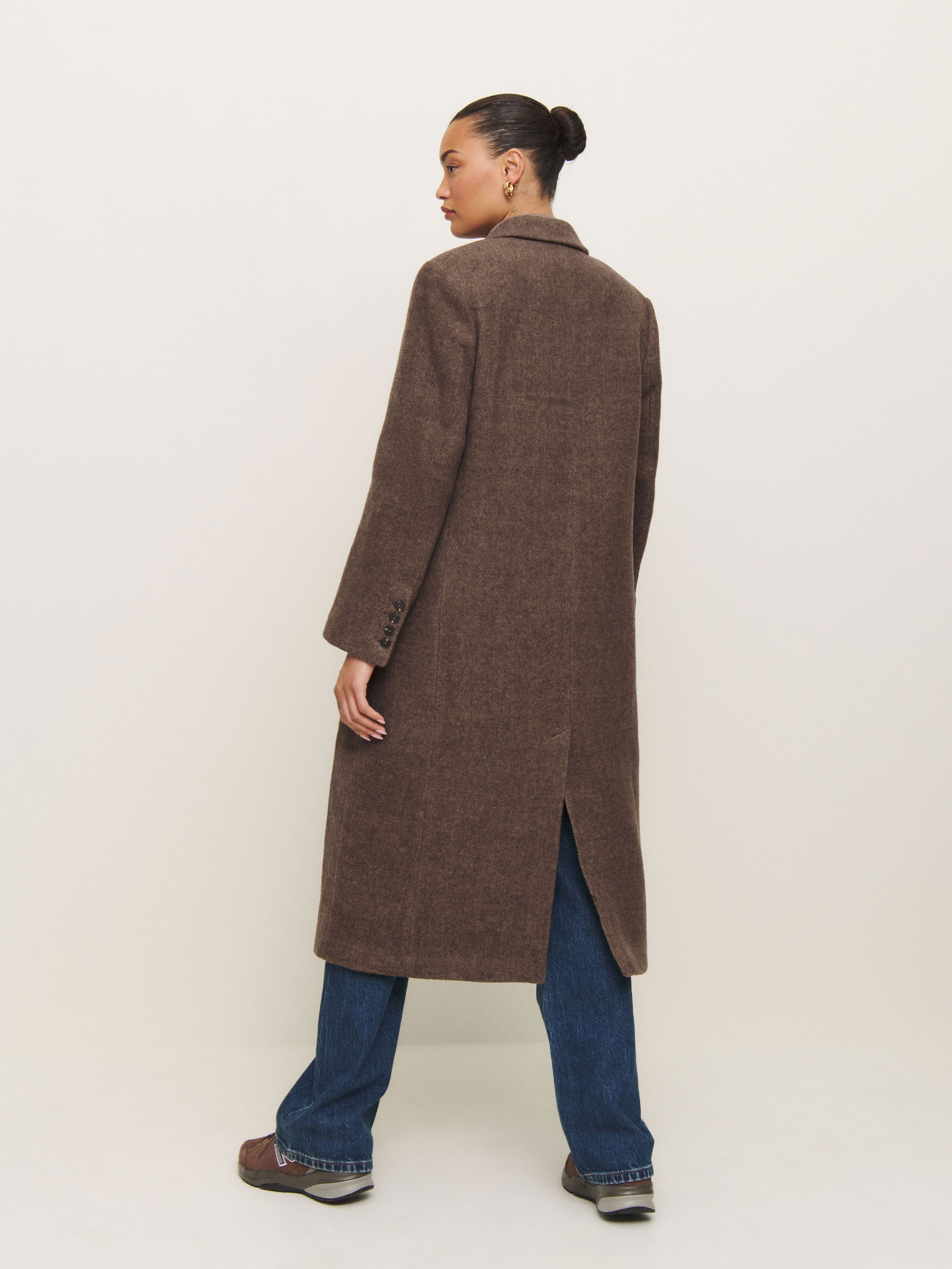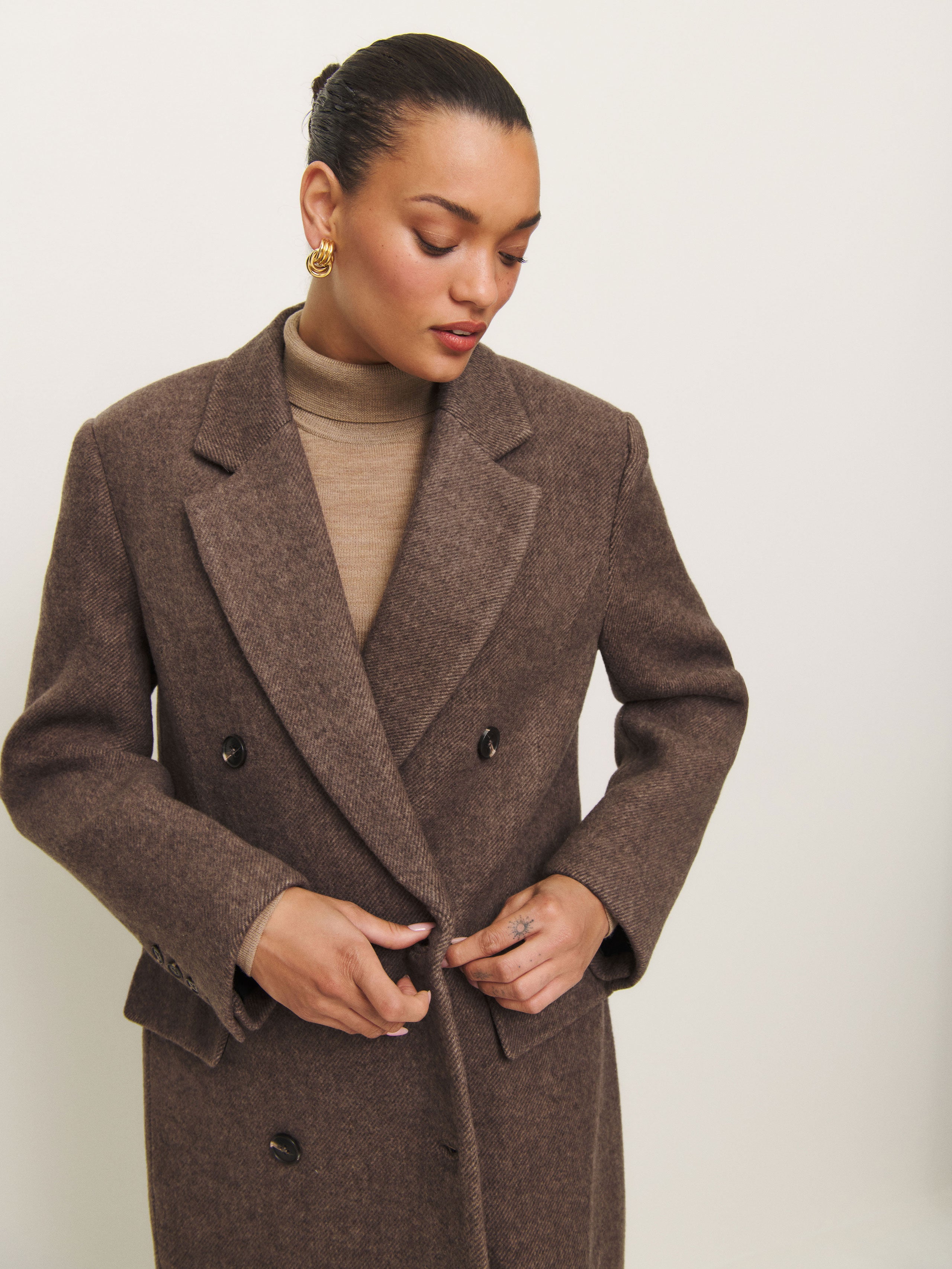 Layer up. Shop the Lucas Coat from Reformation, a full-length, double-breasted coat.