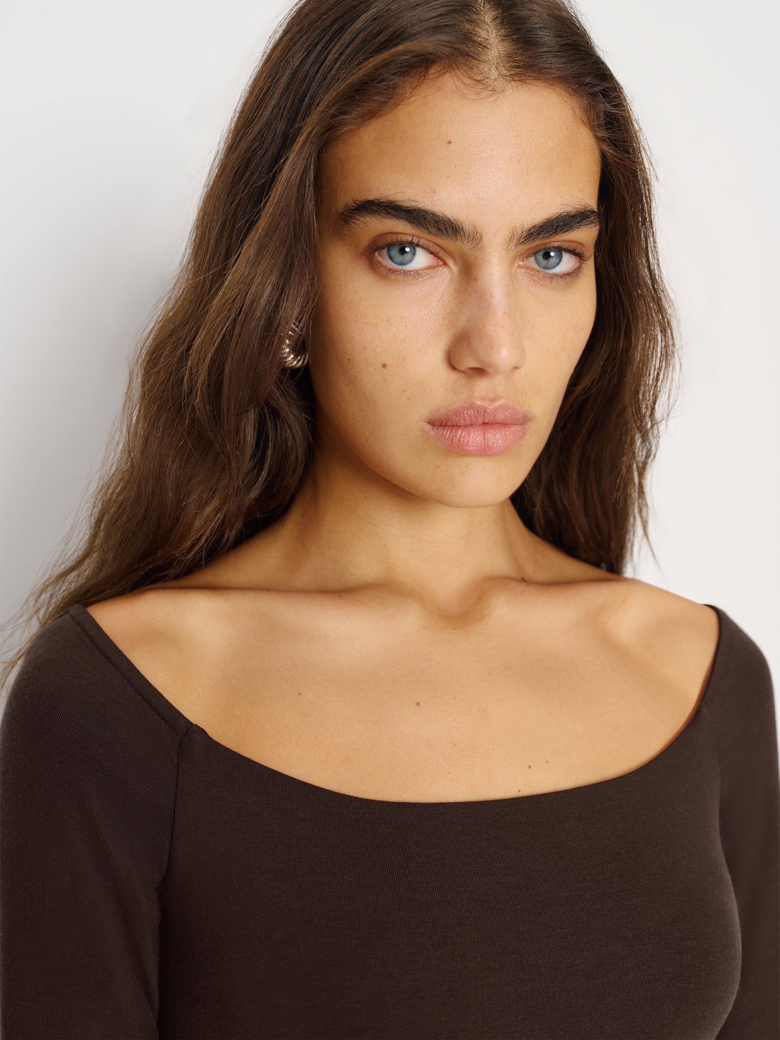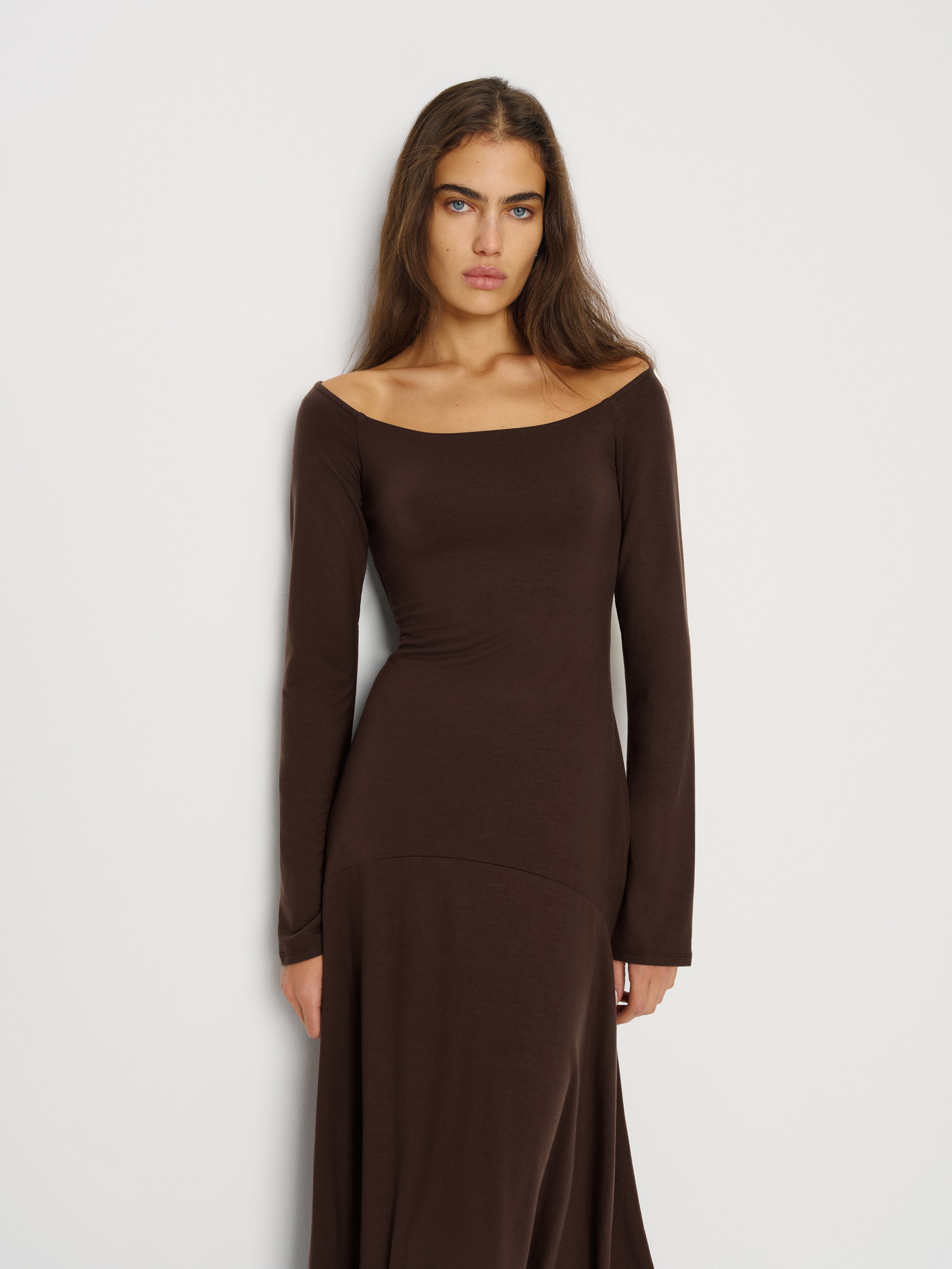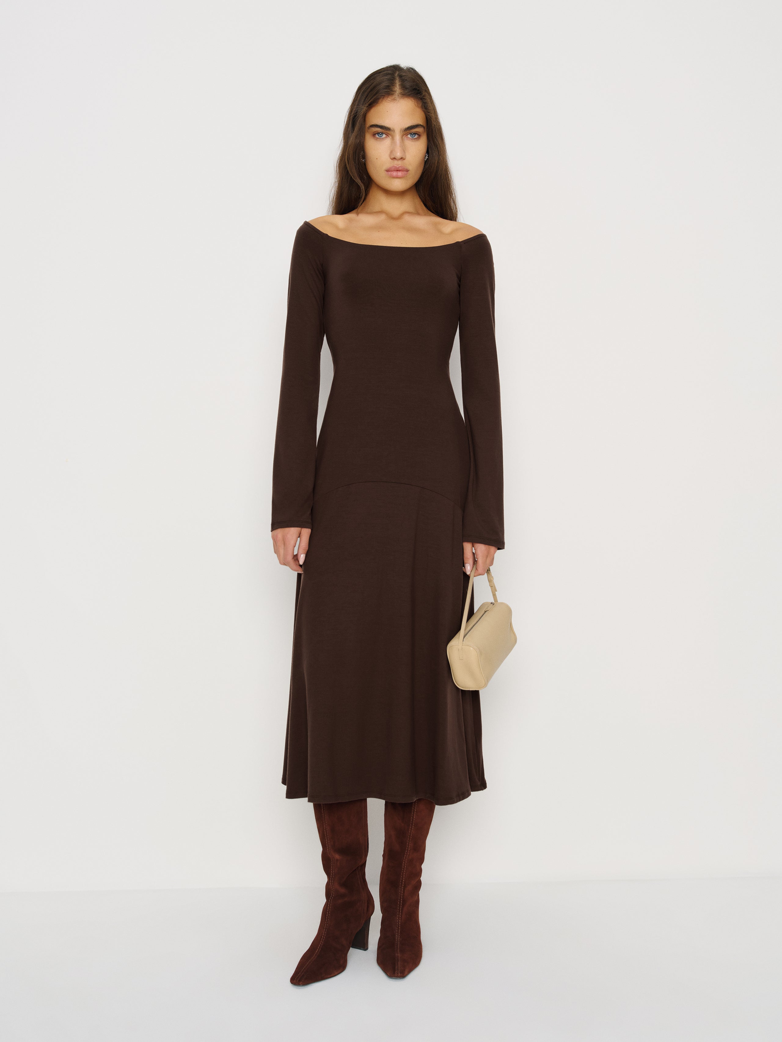 What do we have here? Shop the Lucca Knit Dress from Reformation, a long-sleeved off-the-shoulder midi dress. Easy, but doesn't look it.