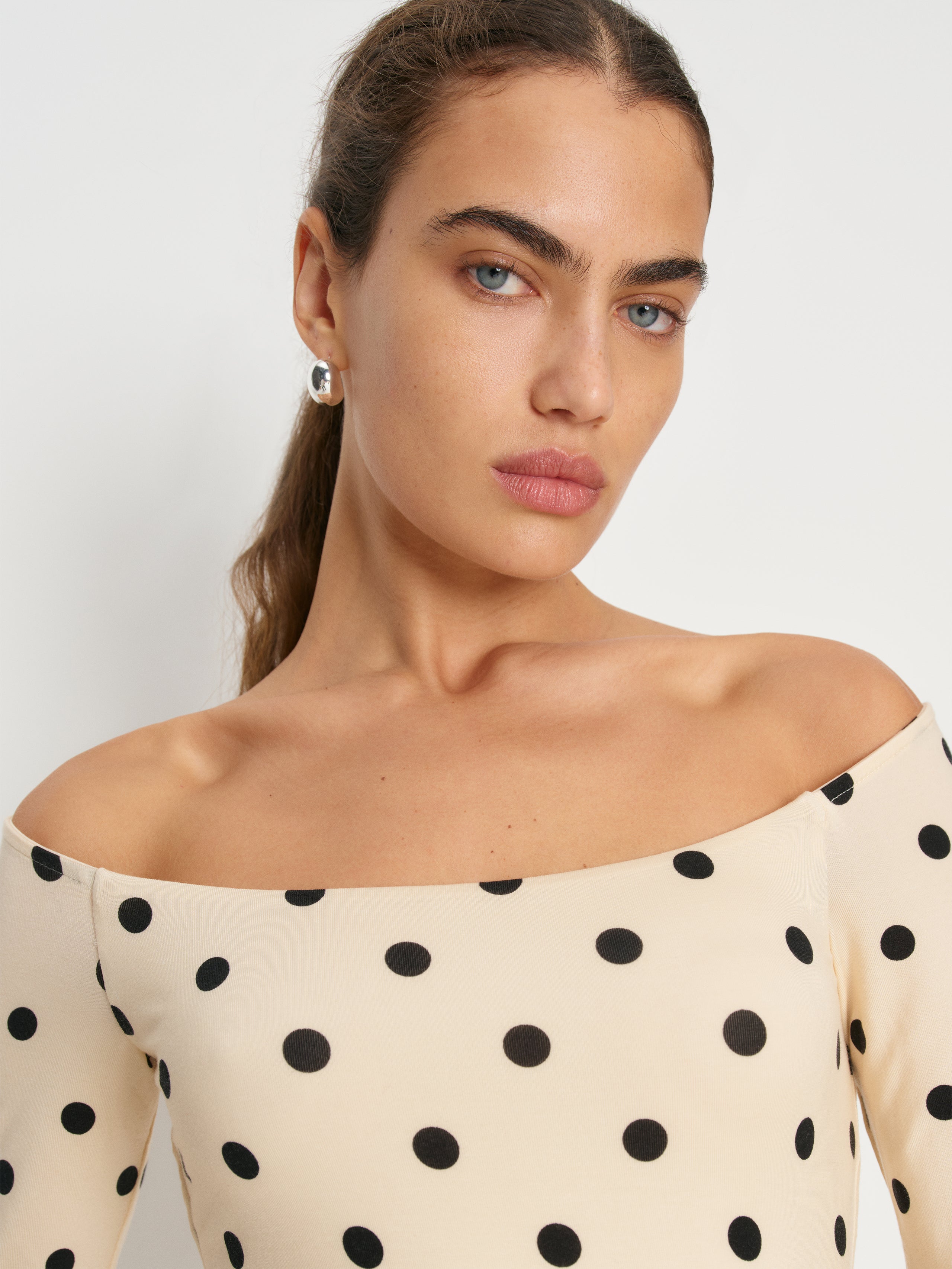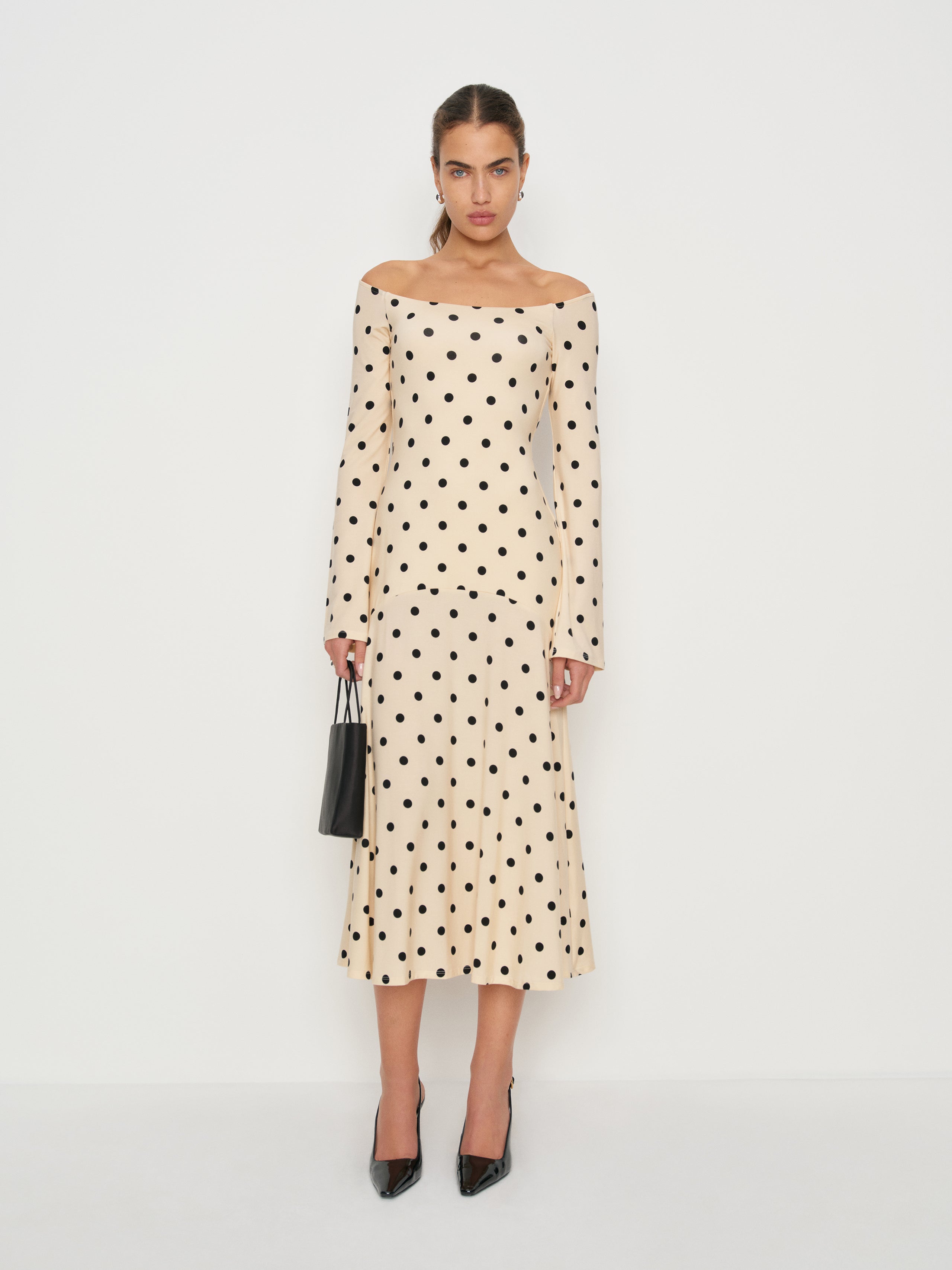What do we have here? Shop the Lucca Knit Dress from Reformation, a long-sleeved off-the-shoulder midi dress....