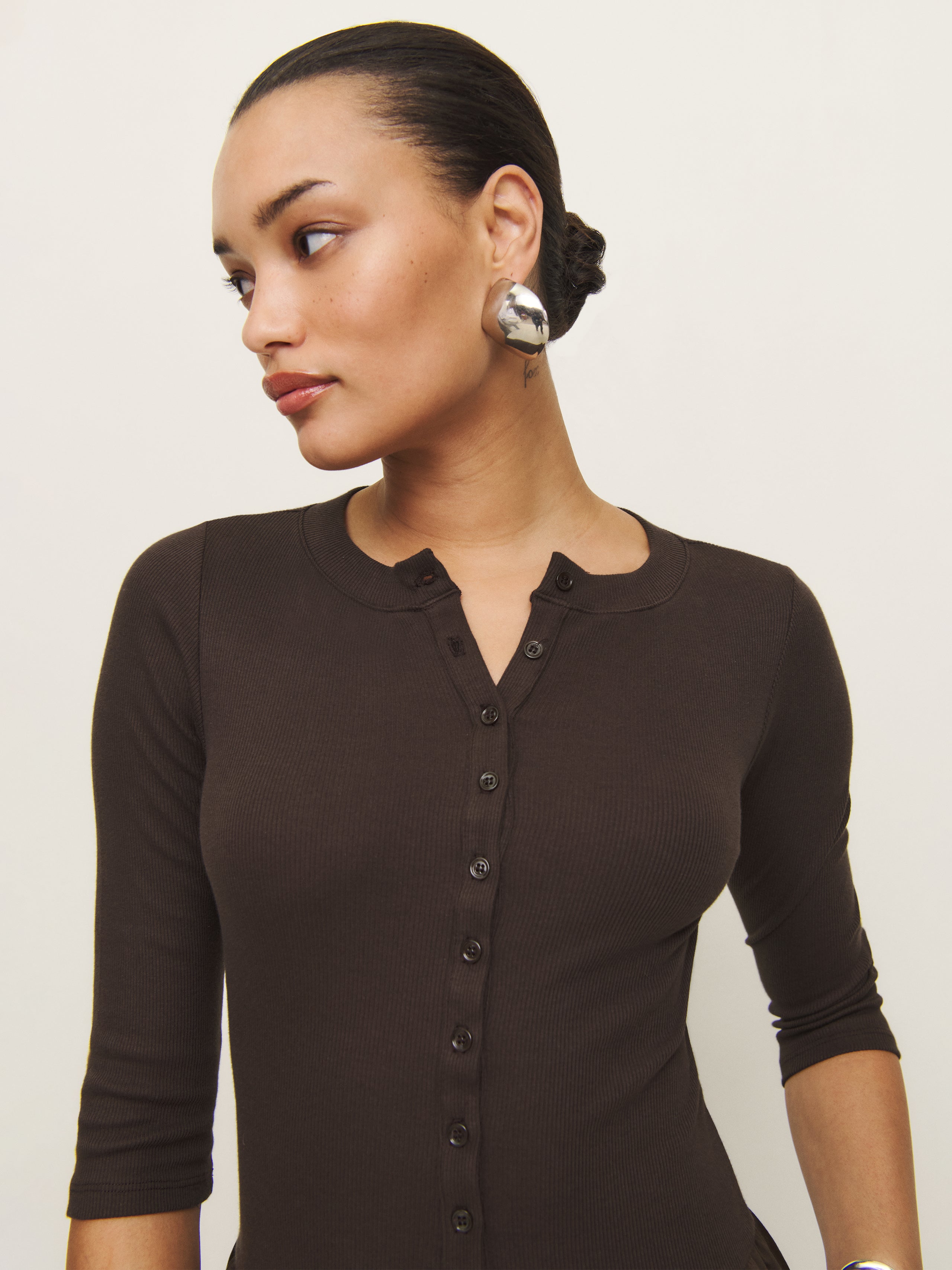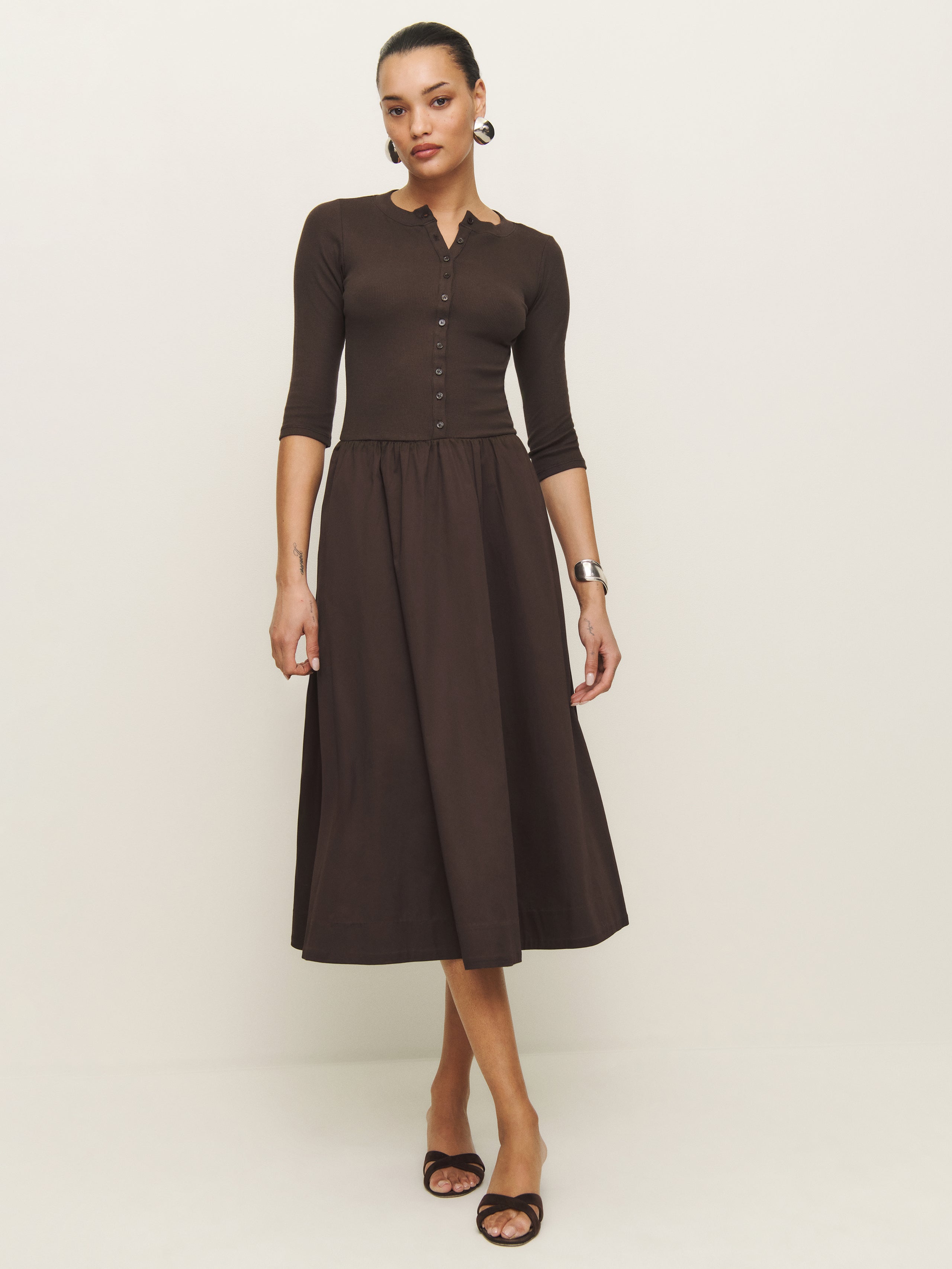 Wear the dress. Shop the Luka Knit Dress from Reformation, a midi dress with 3/4 length sleeves, a henley style neckline, and a drop waist.