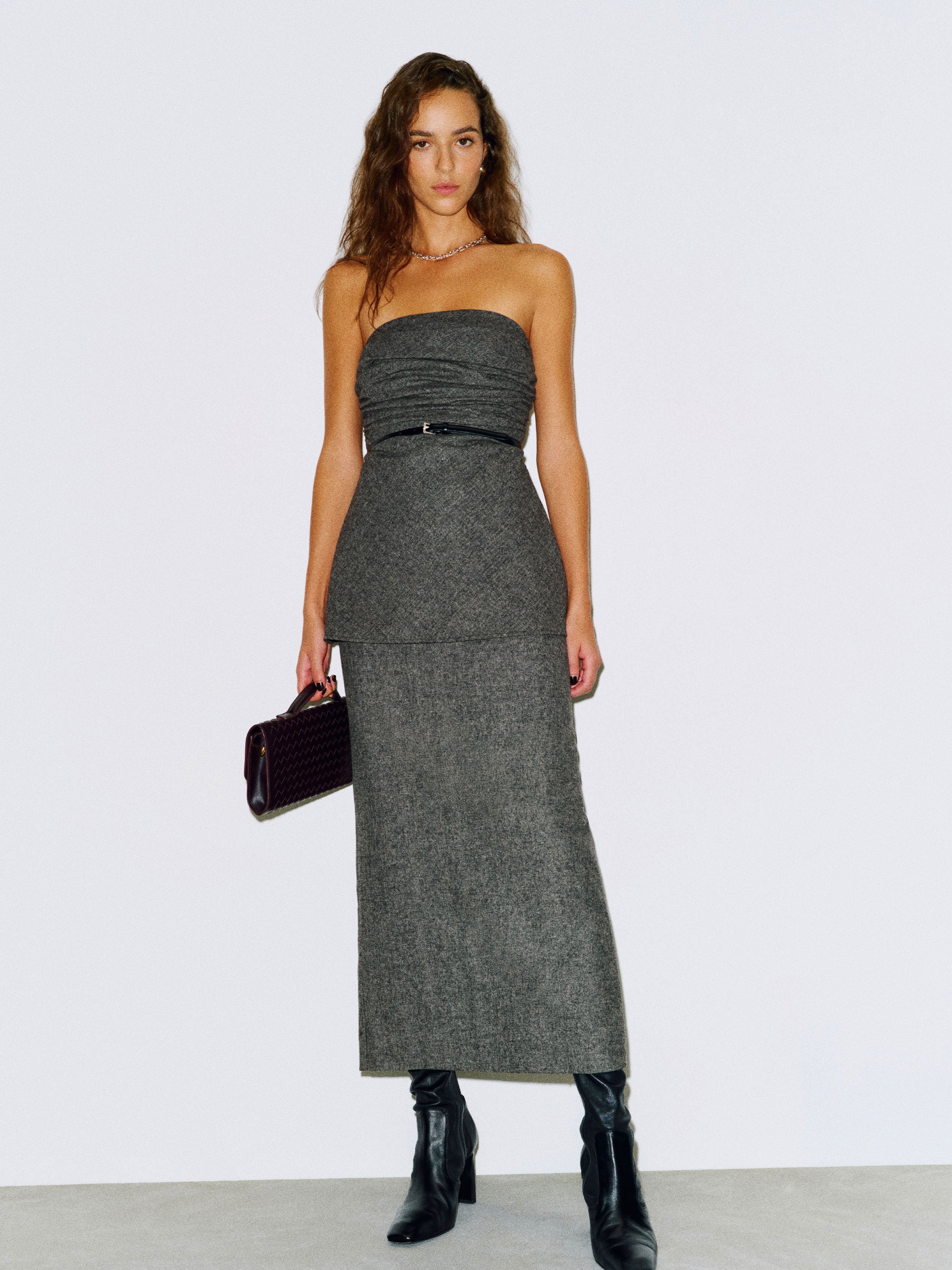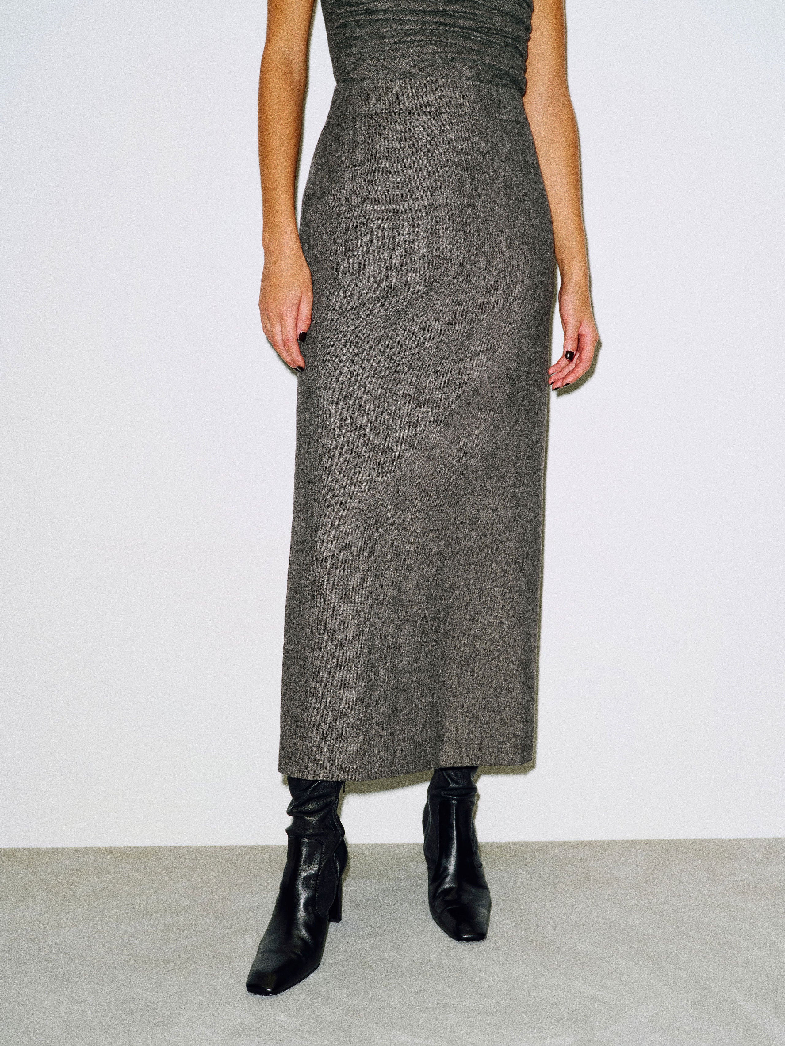 Let your skirt do the talking. Shop the Lydia Skirt from Reformation, a high rise maxi skirt with a column fit.