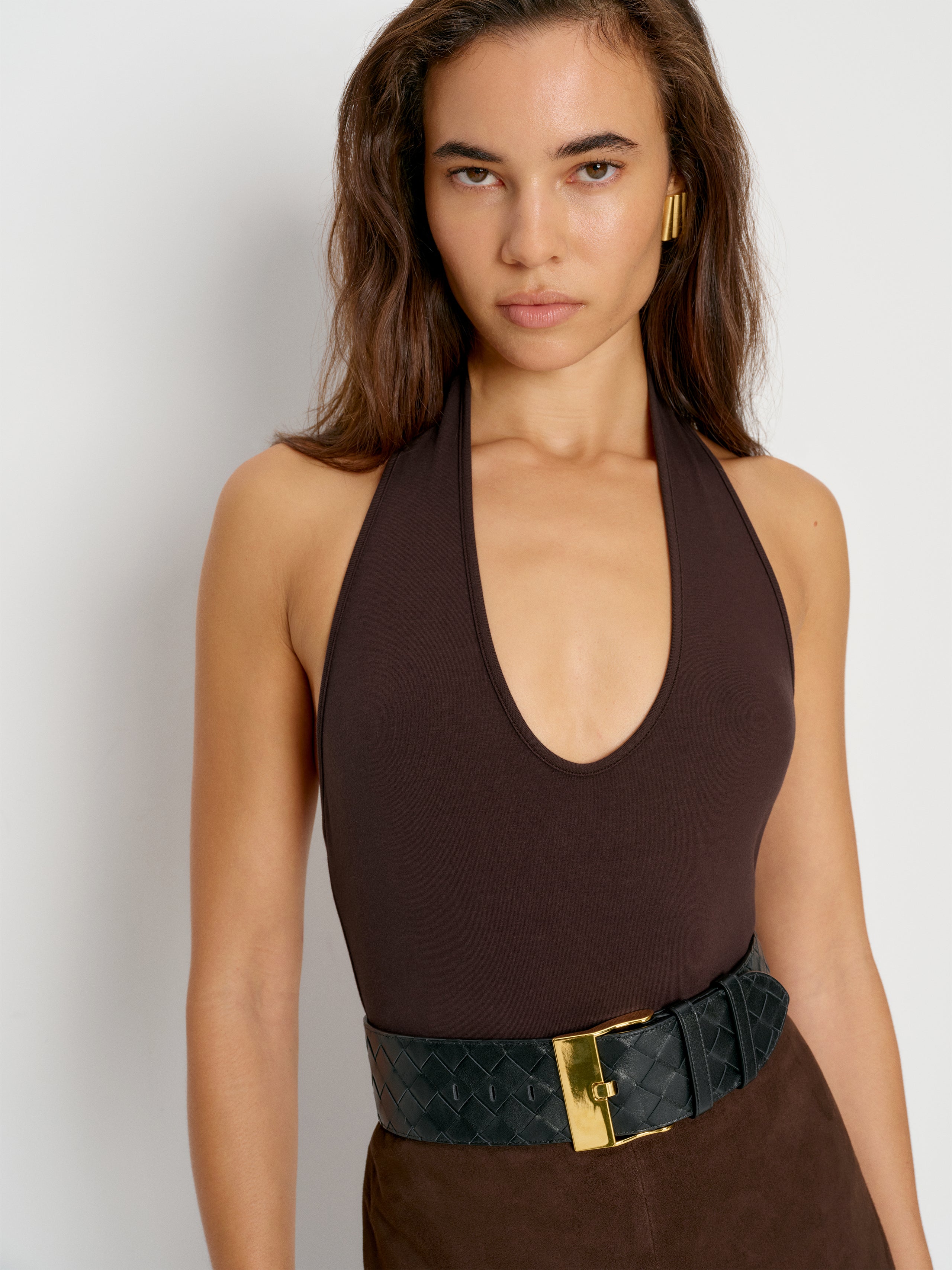 No nonsense. Shop the Lyra Knit Bodysuit from Reformation, a sleeveless bodysuit with a scoop neckline and an open back. Easy, but doesn't look it.